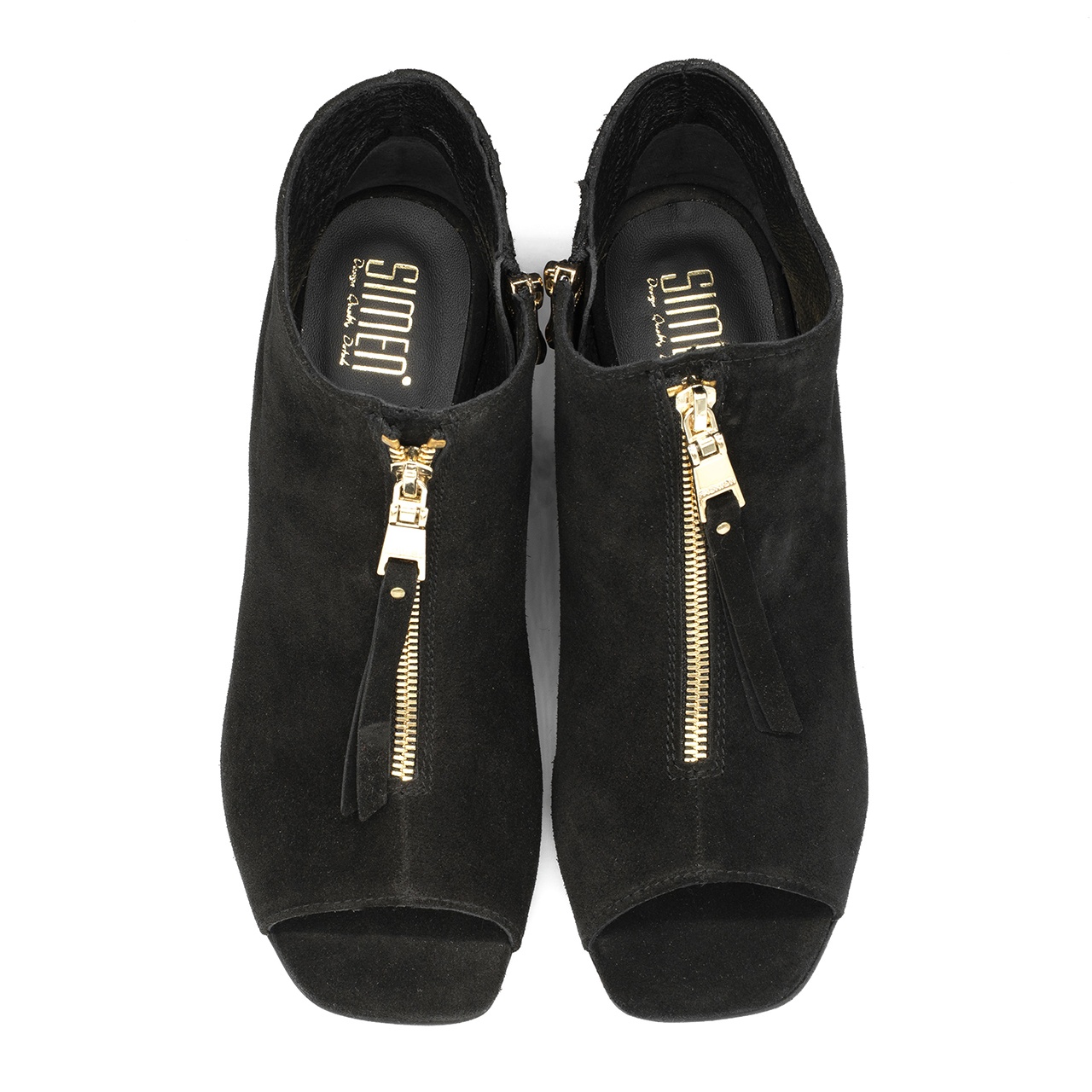 Czarne welurowe botki typu peep toe. Obuwie wyprodukowano ze skóry welurowej. Obcas wynosi około 7,5 cm. Przód buta w kwadrat. Buty posiadają od wewnętrznej strony zamek ułatwiający zakładanie. Zamek z przodu buta stanowi element ozdobny. Wkładka wykonana ze skóry naturalnej. Wymiary podawane na kartach produktów to wymiary orientacyjne i odnoszą się do rozmiaru 37.