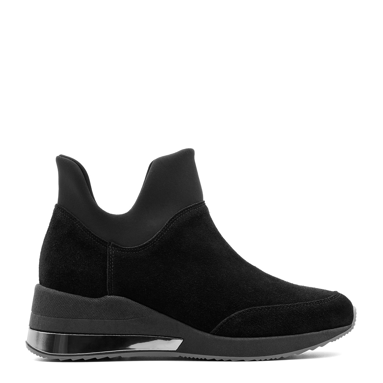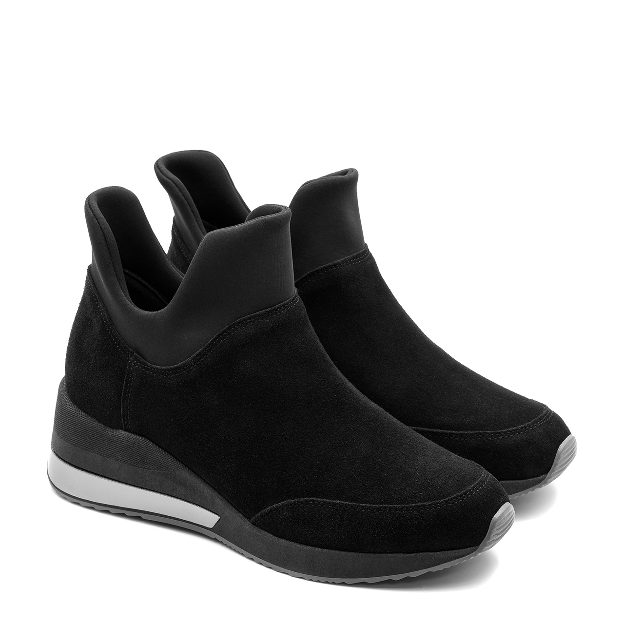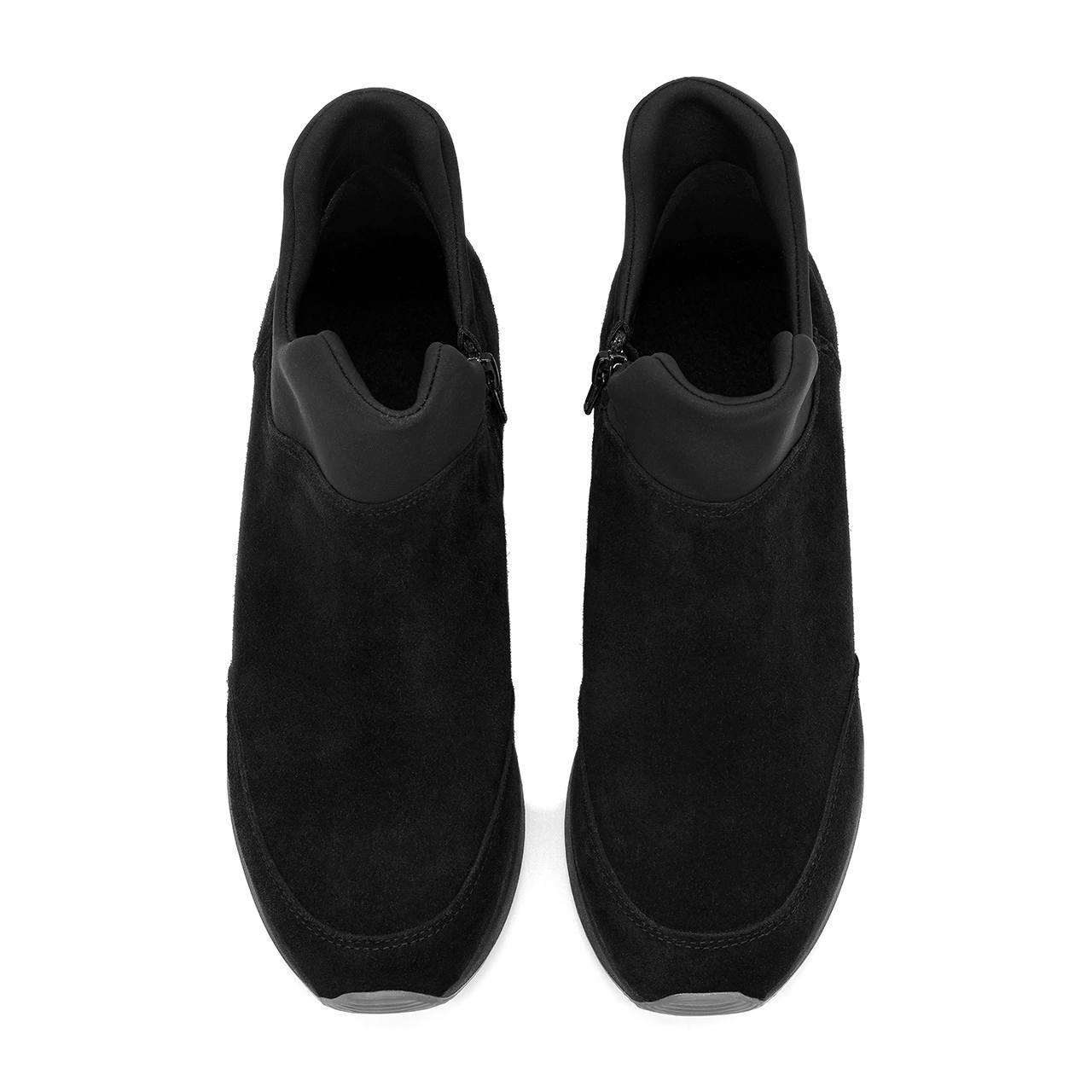 Czarne sportowe botki wykonano z połączenia naturalnej skóry welurowej i elastycznego materiału tekstylnego. Buty posiadają z boku cholewki zamek. Podeszwa z tyłu wynosi 5,5 cm, a z przodu 1,5 cm. Podeszwę ozdobiono z tyłu buta wstawką w kolorze niklu. Szerokość cholewki na górze około 25 cm, a jej wysokość mierzona od podeszwy wynosi około 10 cm. Podszewkę i wkładkę wykonano z filcu. Wymiary podawane na kartach produktów to wymiary orientacyjne i odnoszą się do rozmiaru 37.