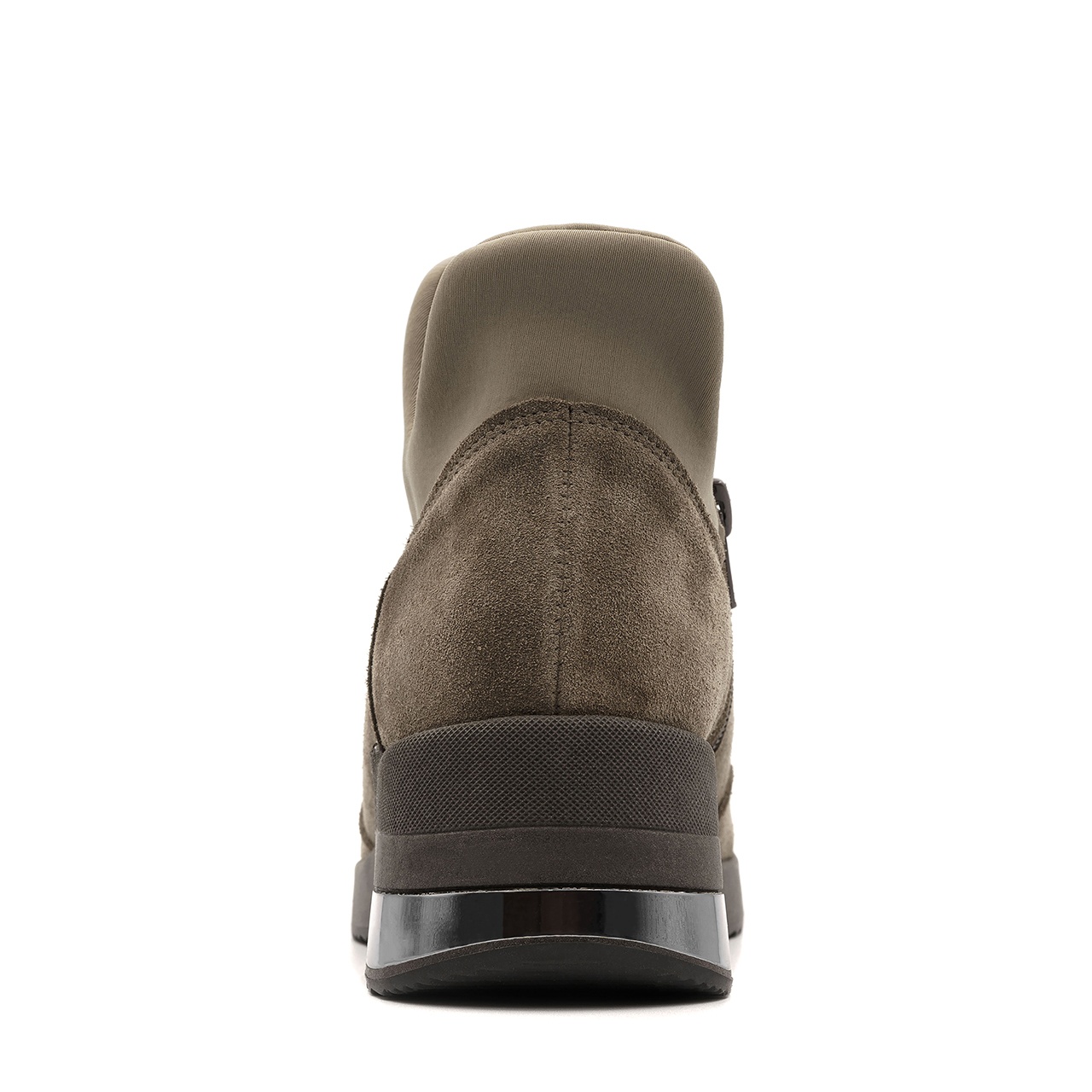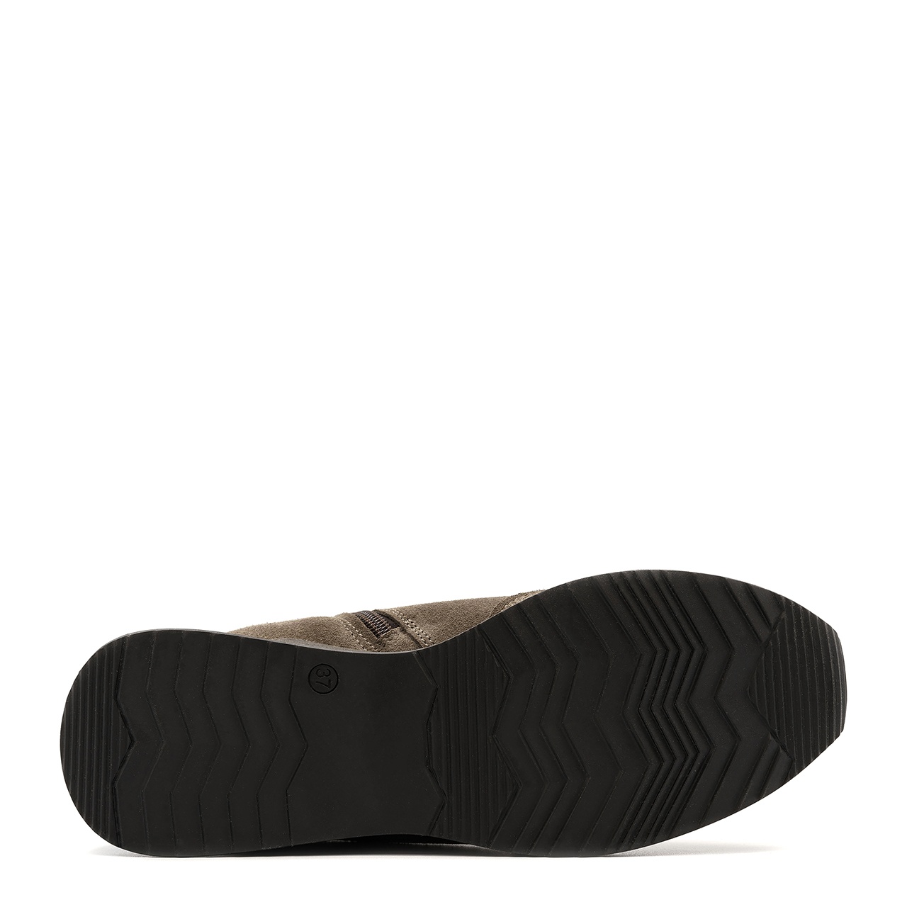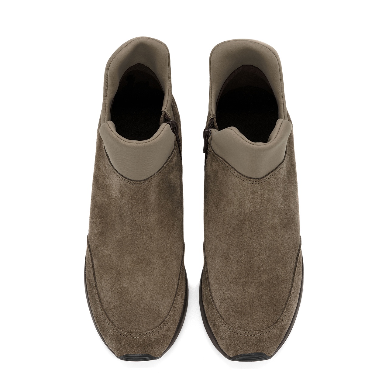 Kawowe sportowe botki wykonano z połączenia naturalnej skóry welurowej i elastycznego materiału tekstylnego. Buty posiadają z boku cholewki zamek. Podeszwa z tyłu wynosi 5,5 cm, a z przodu 1,5 cm. Podeszwę ozdobiono z tyłu buta wstawką w kolorze niklu. Szerokość cholewki na górze około 25 cm, a jej wysokość mierzona od podeszwy wynosi około 10 cm. Podszewkę i wkładkę wykonano z filcu. Wymiary podawane na kartach produktów to wymiary orientacyjne i odnoszą się do rozmiaru 37.