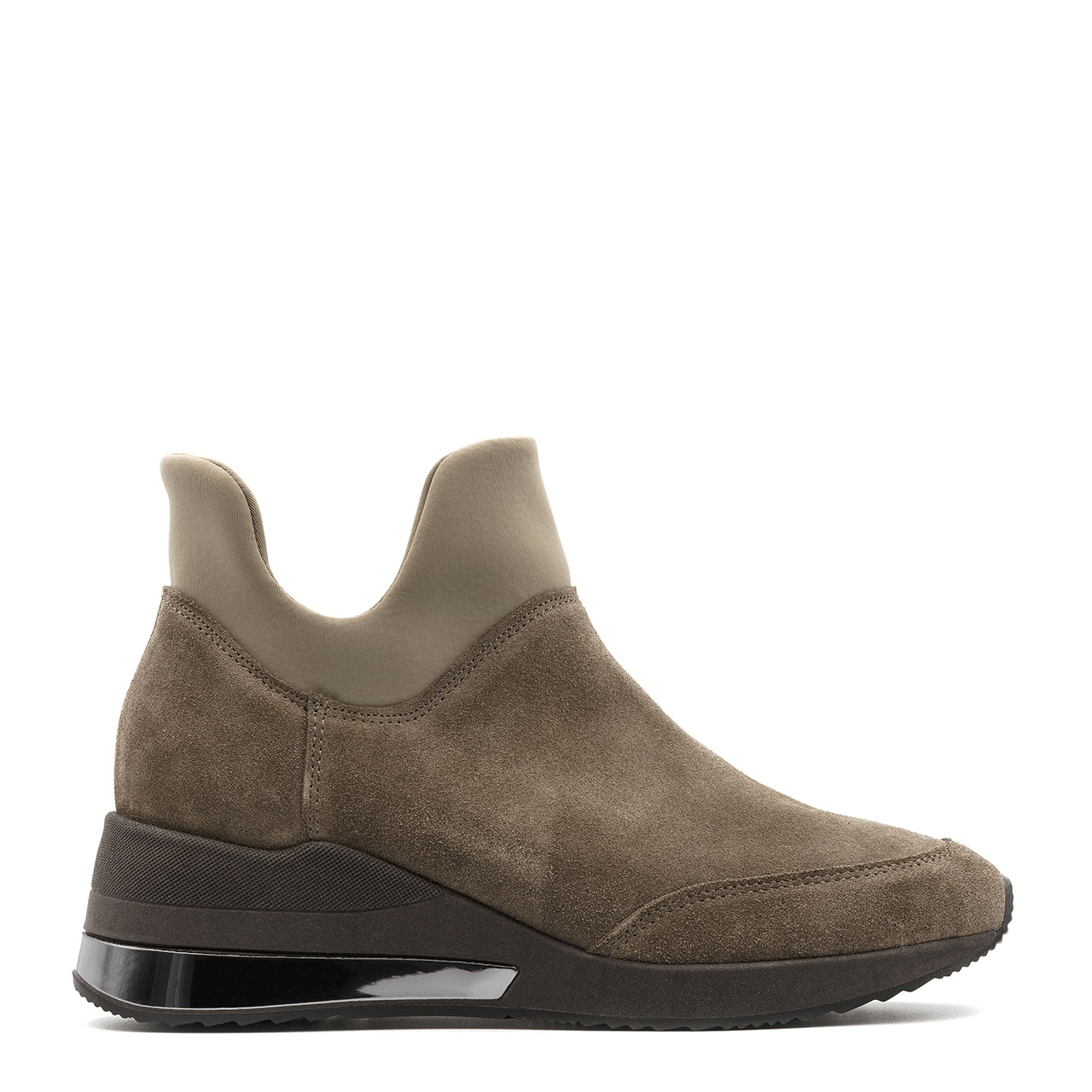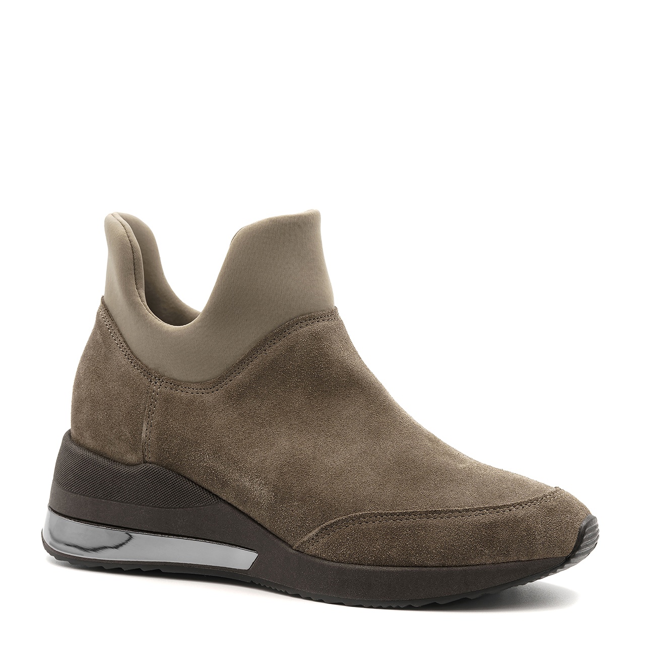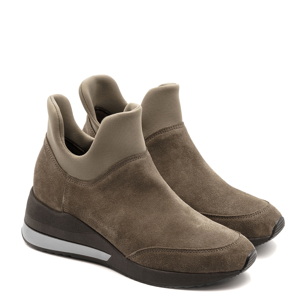 Kawowe sportowe botki wykonano z połączenia naturalnej skóry welurowej i elastycznego materiału tekstylnego. Buty posiadają z boku cholewki zamek. Podeszwa z tyłu wynosi 5,5 cm, a z przodu 1,5 cm. Podeszwę ozdobiono z tyłu buta wstawką w kolorze niklu. Szerokość cholewki na górze około 25 cm, a jej wysokość mierzona od podeszwy wynosi około 10 cm. Podszewkę i wkładkę wykonano z filcu. Wymiary podawane na kartach produktów to wymiary orientacyjne i odnoszą się do rozmiaru 37.