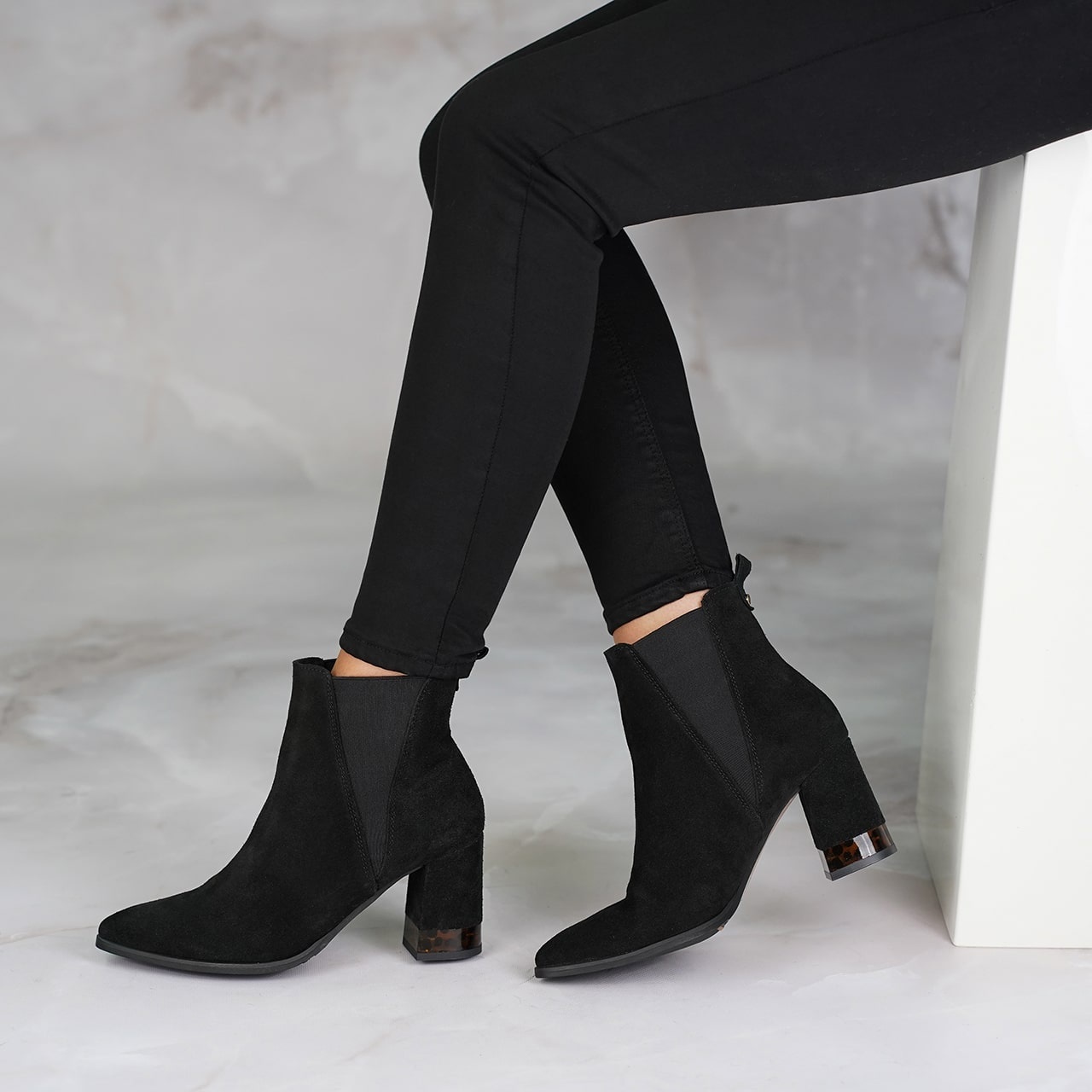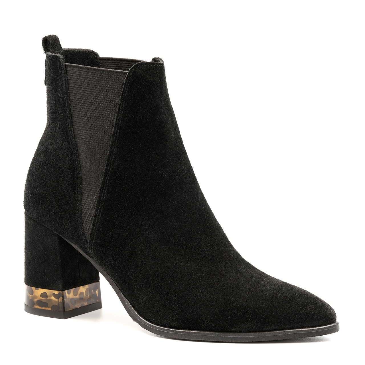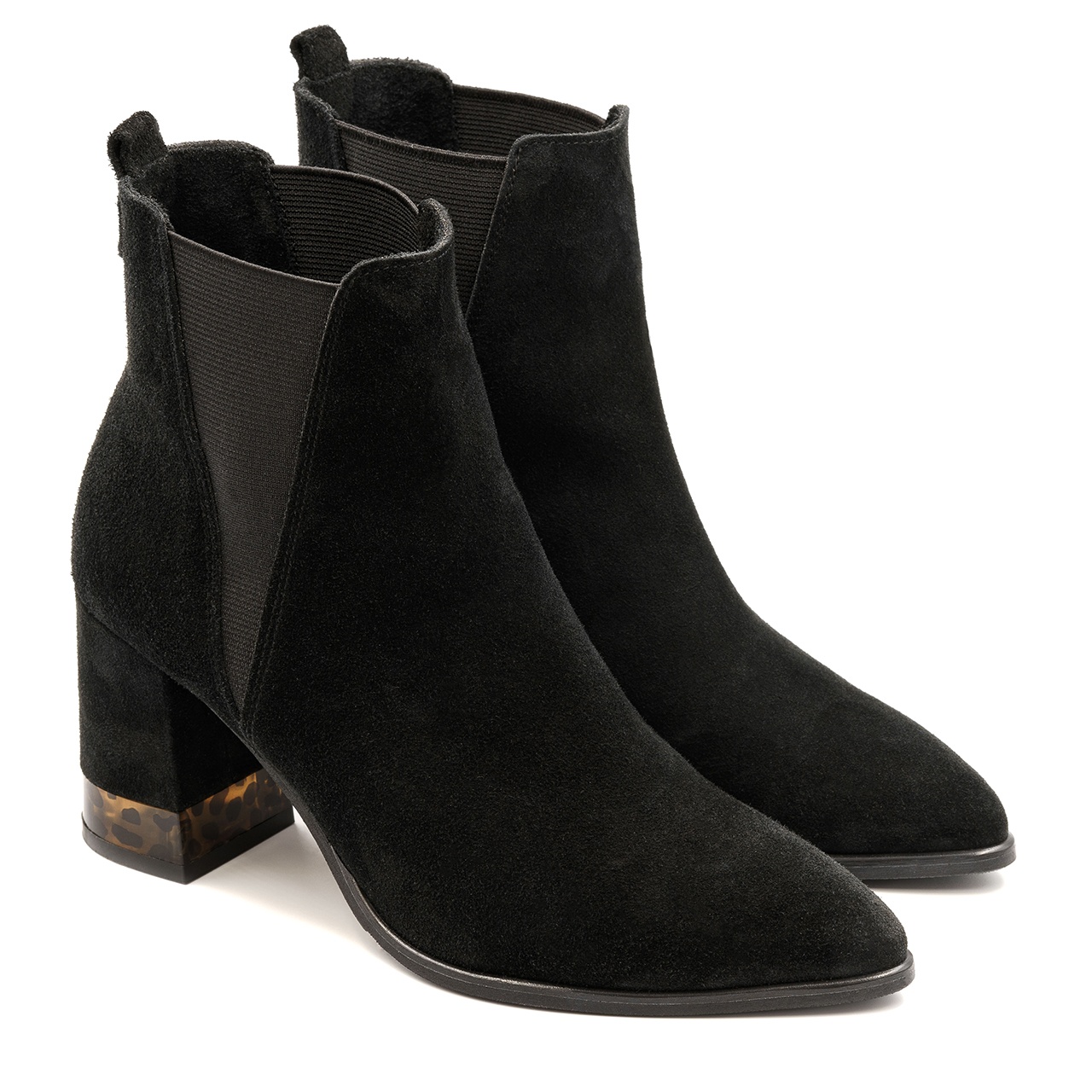 Czarne botki, które wykonano ze skóry welurowej. Obcas w butach wynosi 8 cm, a podeszwa 0,5 cm. Botki mają lekko delikatny szpic. Obcas ozdobiony elementem z półprzezroczystego brązowego tworzywa w panterkę obleczono skórą welurową. Do cholewki wszyto gumkę, która ułatwia zakładanie obuwia. Szerokość cholewki na górze około 24 cm po rozciągnięciu około 32, a jej wysokość mierzona od obcasa wynosi około 14 cm. Podszewkę i wkładkę wykonano z filcu. Wymiary podawane na kartach produktów to wymiary orientacyjne i odnoszą się do rozmiaru 37.