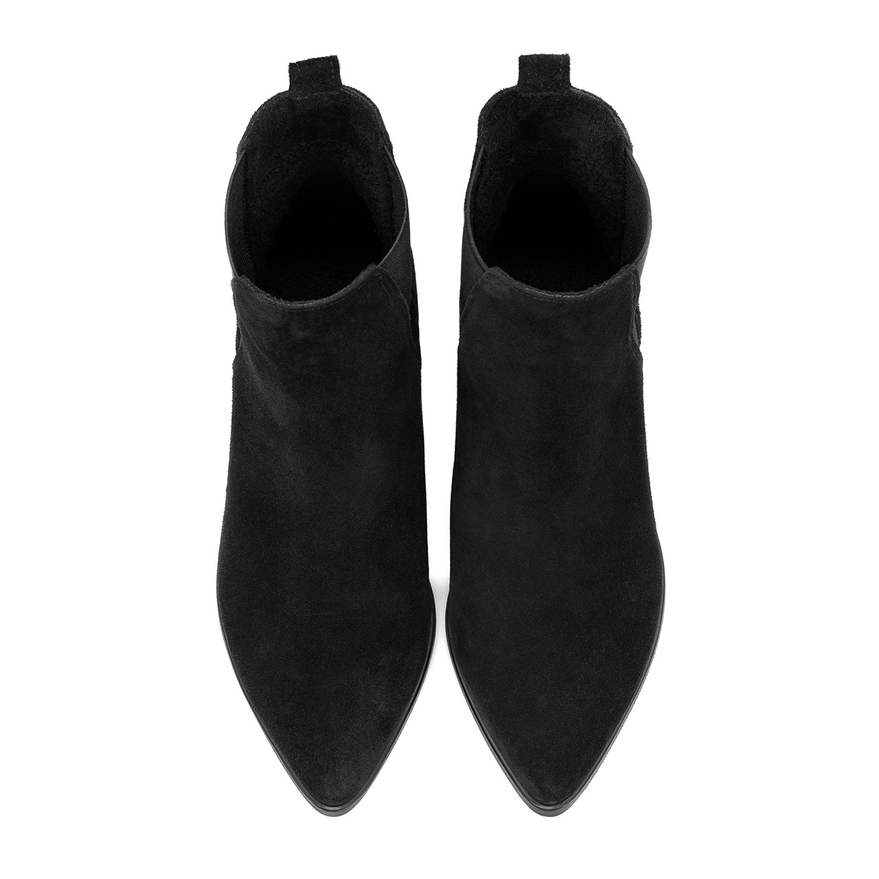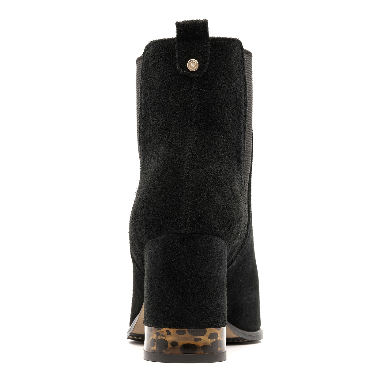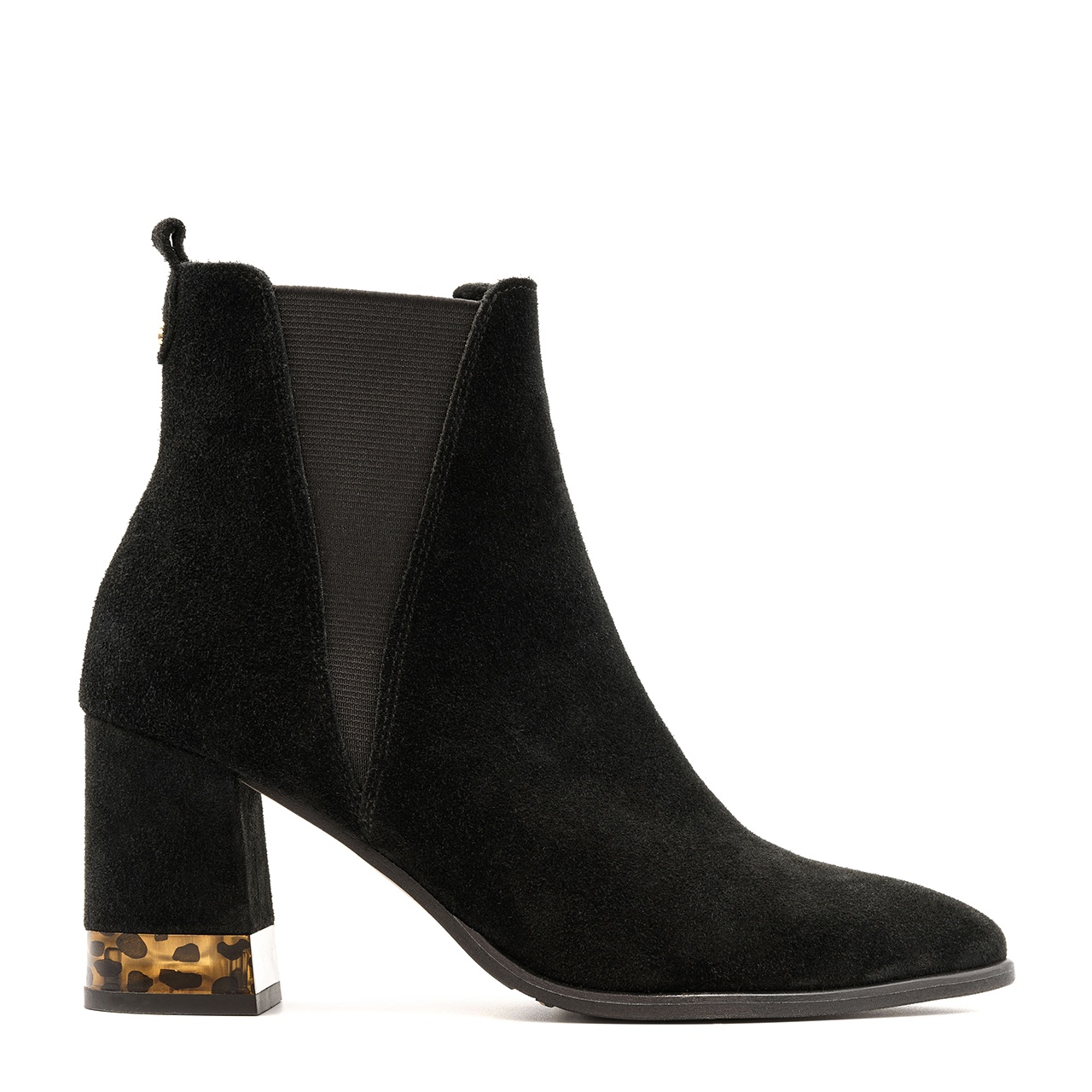 Czarne botki, które wykonano ze skóry welurowej. Obcas w butach wynosi 8 cm, a podeszwa 0,5 cm. Botki mają lekko delikatny szpic. Obcas ozdobiony elementem z półprzezroczystego brązowego tworzywa w panterkę obleczono skórą welurową. Do cholewki wszyto gumkę, która ułatwia zakładanie obuwia. Szerokość cholewki na górze około 24 cm po rozciągnięciu około 32, a jej wysokość mierzona od obcasa wynosi około 14 cm. Podszewkę i wkładkę wykonano z filcu. Wymiary podawane na kartach produktów to wymiary orientacyjne i odnoszą się do rozmiaru 37.