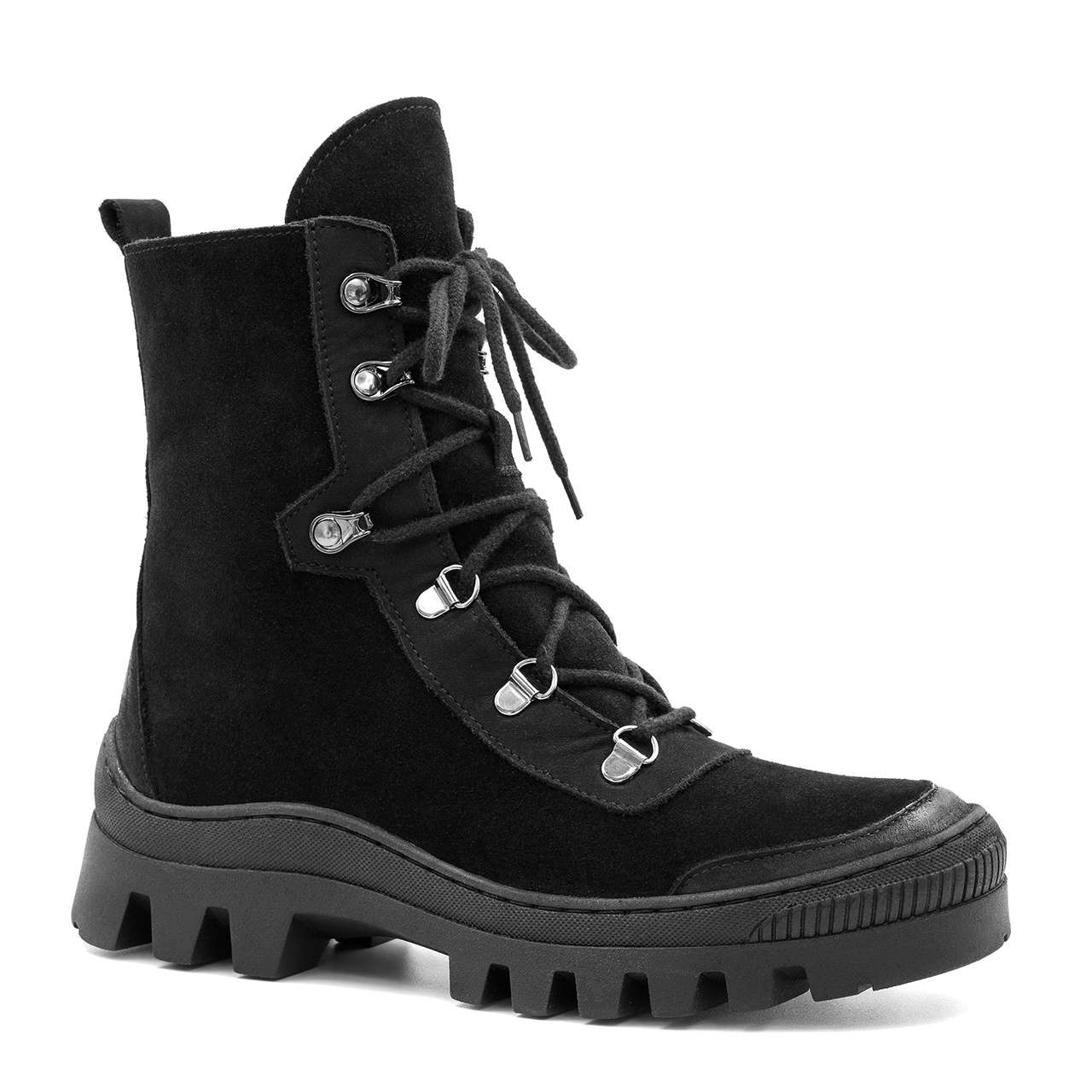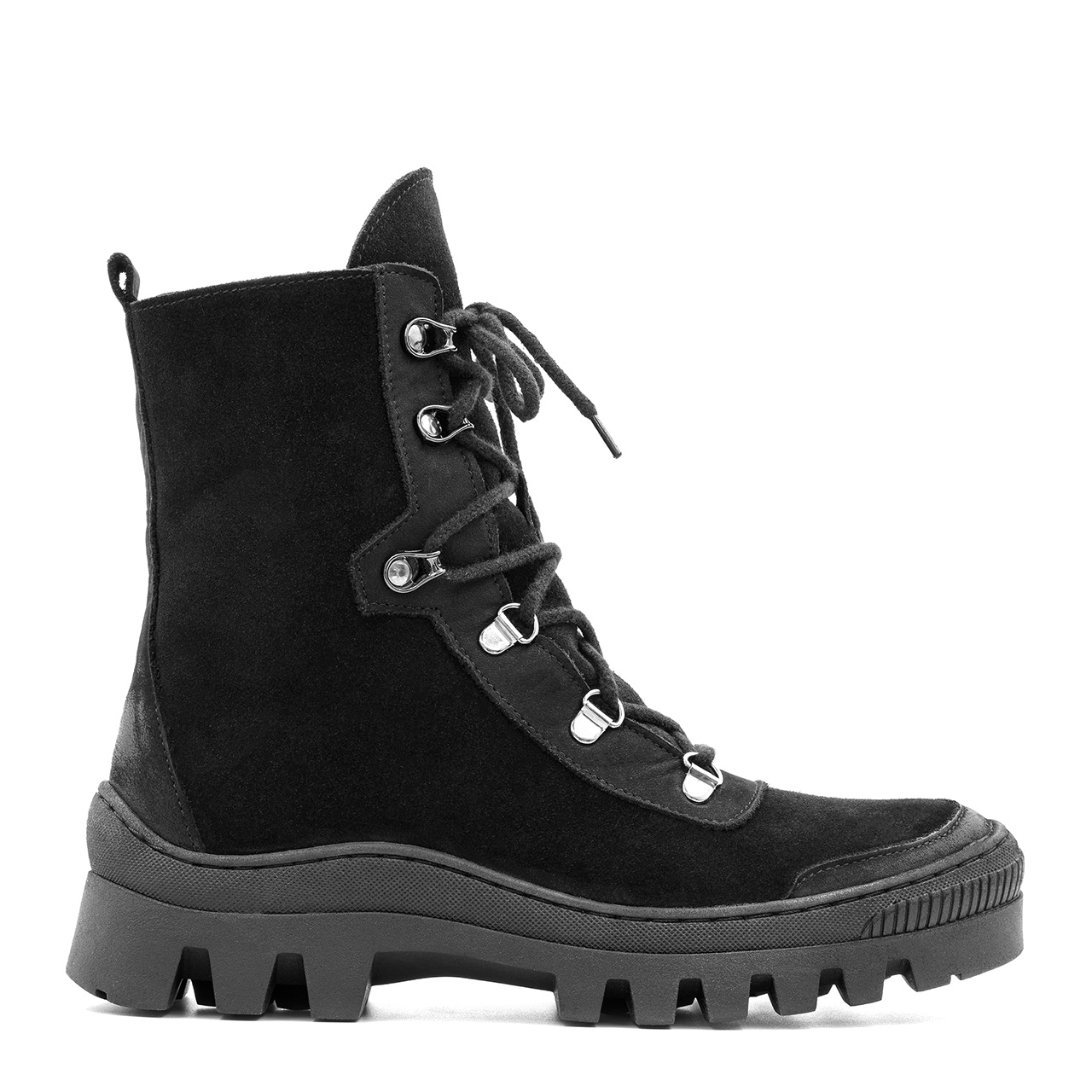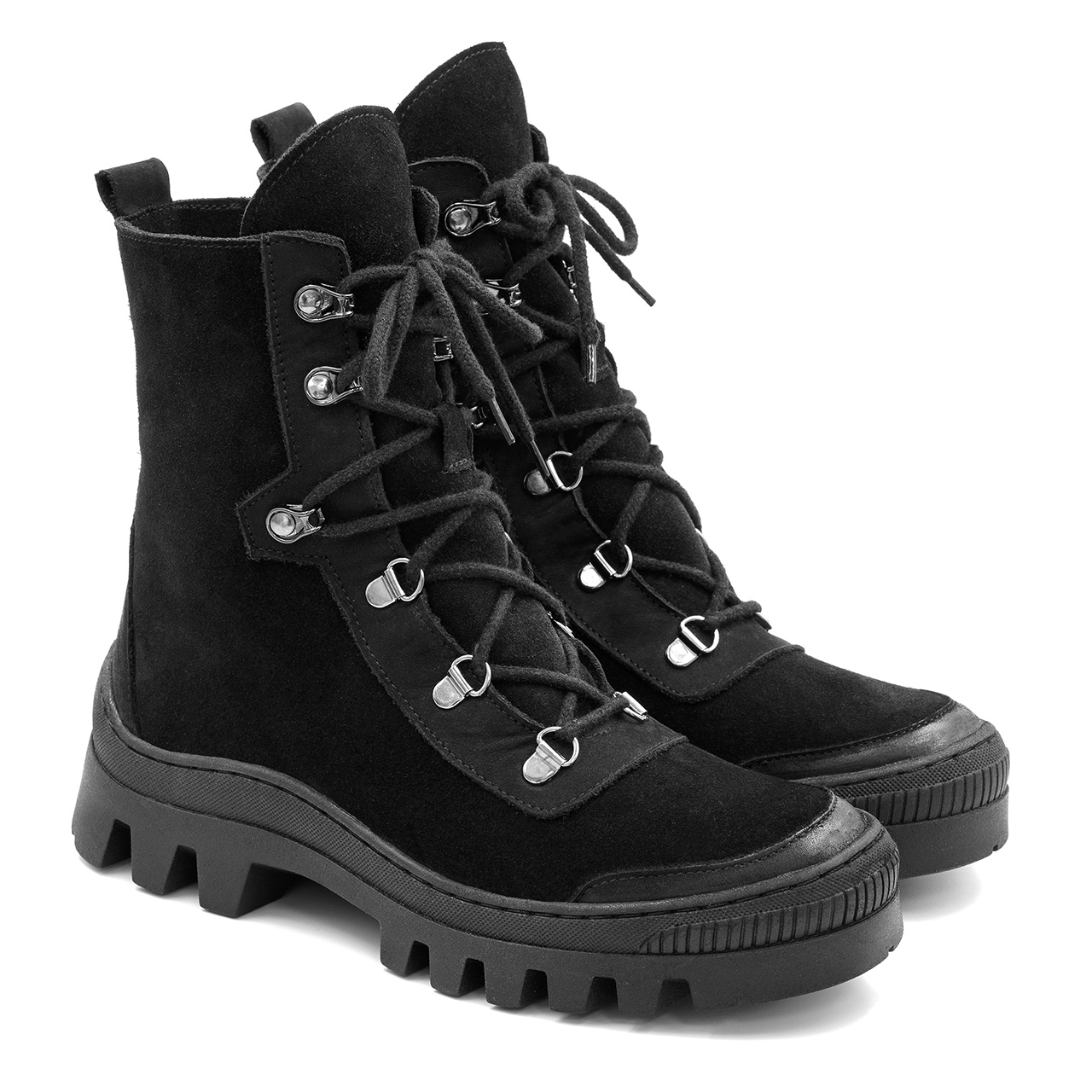 Czarne sznurowane botki na grubej podeszwie. Obuwie wykonano z połączenia naturalnej skóry welurowej i nubukowej. Grubość podeszwy z przodu buta wynosi około 3 cm, z tyłu około 4 cm. Buty posiadają z boku cholewki suwak. Przód buta zaokrąglony. Podszewka i wkładka wykonane są z filcu. Szerokość cholewki na górze około 23 cm, a jej wysokość mierzona od obcasa wynosi około 15,5 cm.W rozmiarze 37.