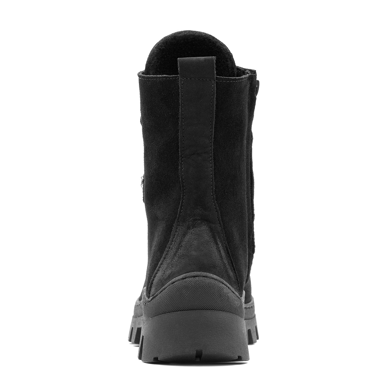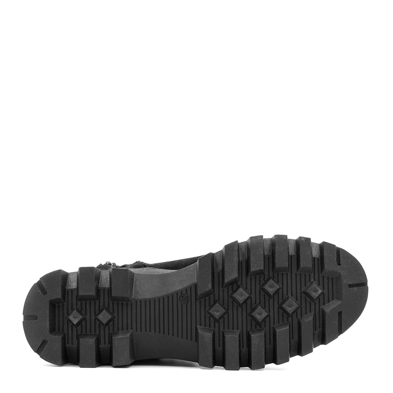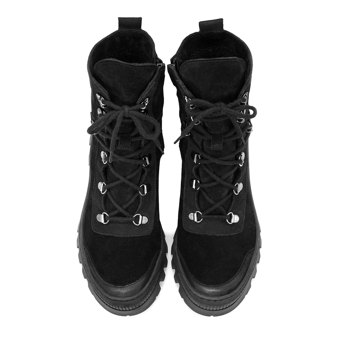 Czarne sznurowane botki na grubej podeszwie. Obuwie wykonano z połączenia naturalnej skóry welurowej i nubukowej. Grubość podeszwy z przodu buta wynosi około 3 cm, z tyłu około 4 cm. Buty posiadają z boku cholewki suwak. Przód buta zaokrąglony. Podszewka i wkładka wykonane są z filcu. Szerokość cholewki na górze około 23 cm, a jej wysokość mierzona od obcasa wynosi około 15,5 cm.W rozmiarze 37.