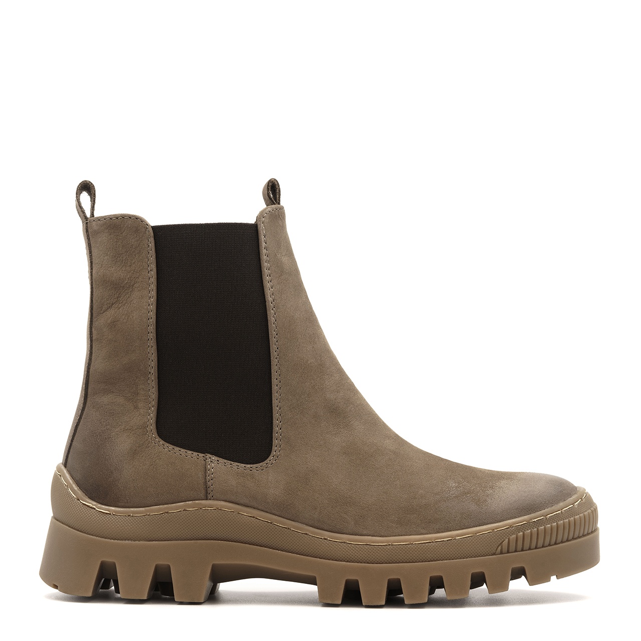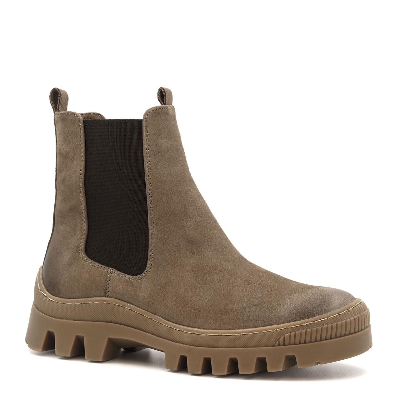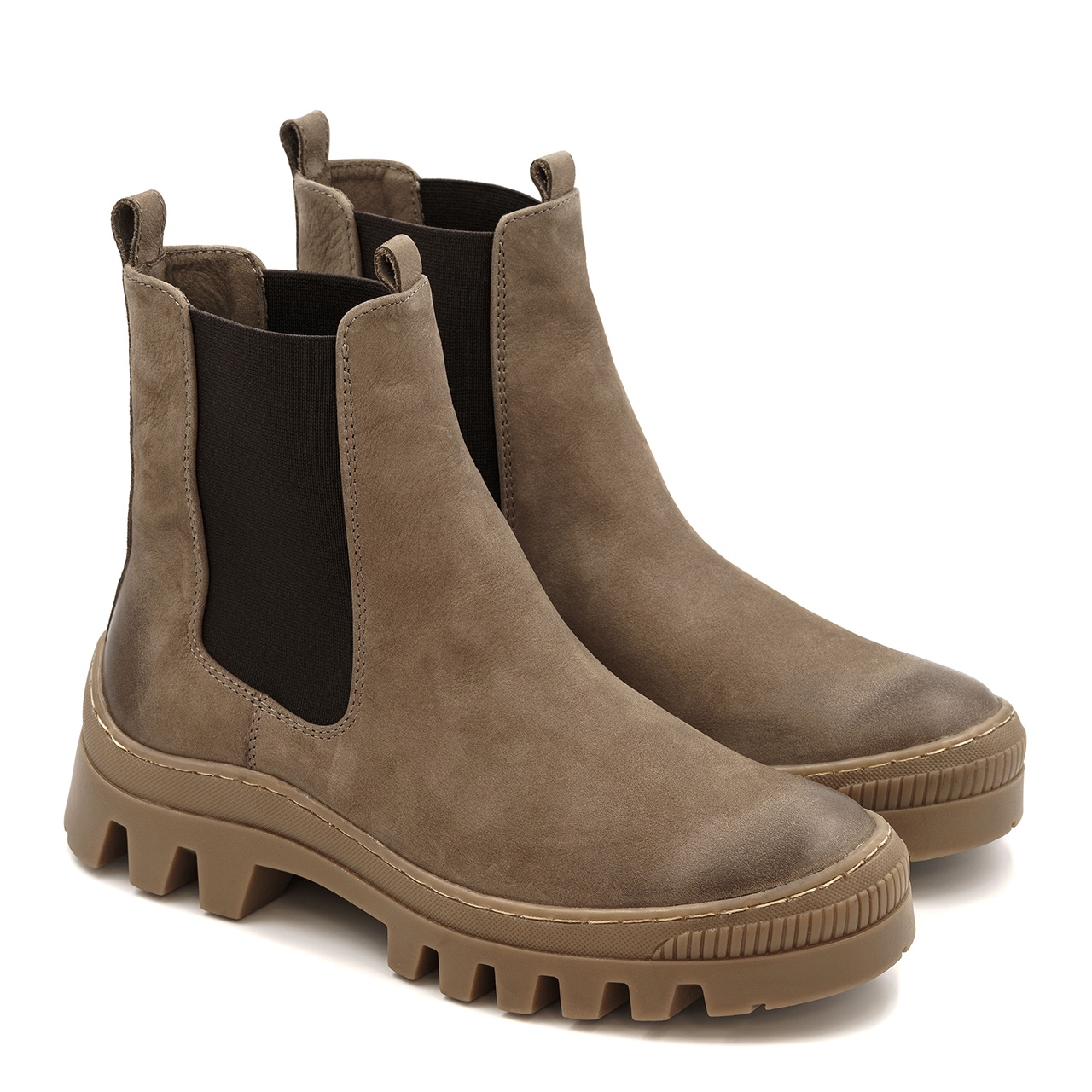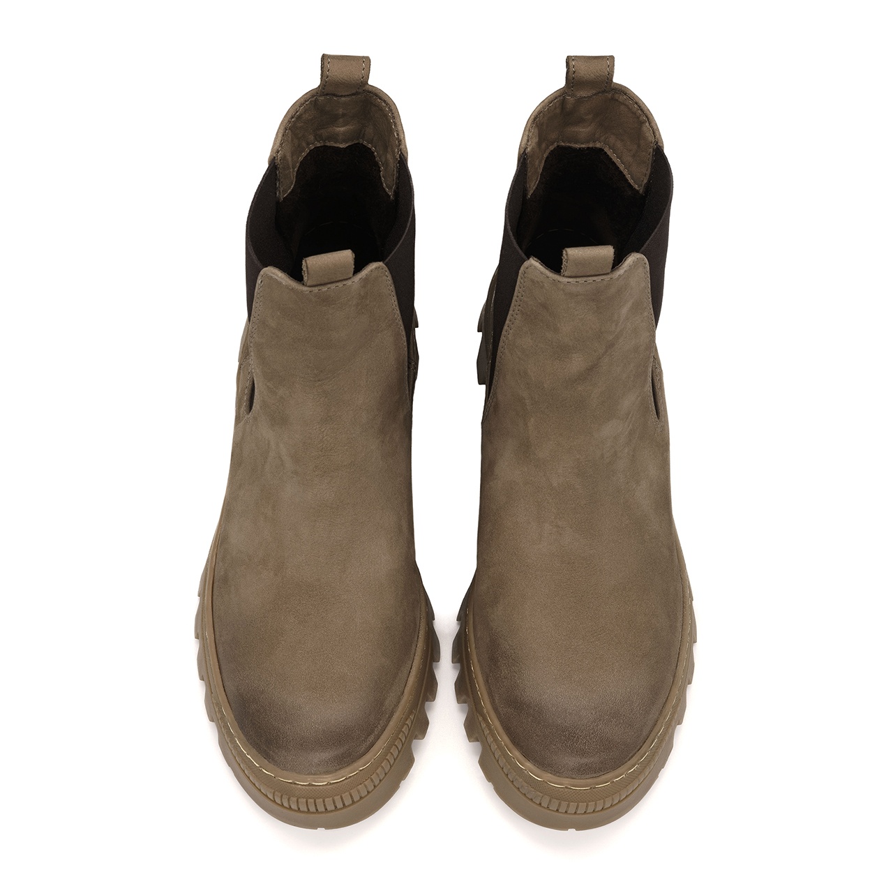 Kawowe botki na podeszwie z wysokim bieżnikiem wykonano naturalnej skóry nubukowej z lekkimi przyciemnionymi noskami i piętą. Grubość podeszwy z przodu buta wynosi około 3 cm, z tyłu około 4 cm. Po bokach cholewki wszyto szeroką gumę. Przód buta zaokrąglony. Podszewka i wkładka wykonane są z filcu. Szerokość cholewki na górze około 24 cm po rozciągnięciu około 32, a jej wysokość mierzona od obcasa wynosi około 13 cm. Wymiary podawane na kartach produktów to wymiary orientacyjne i odnoszą się do rozmiaru 37.