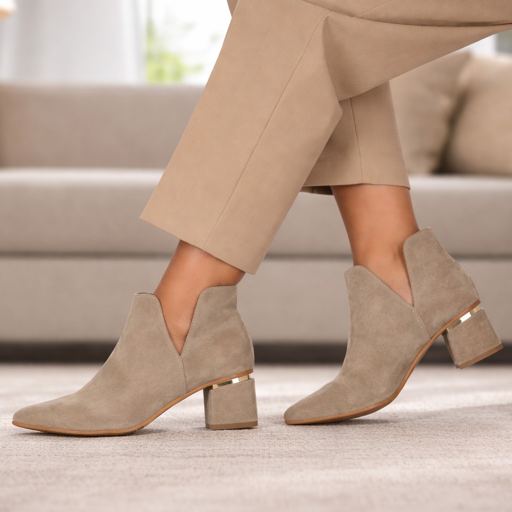 Beżowe botki bez zamka z rozcięciem na bokach wyprodukowano z naturalnej skóry welurowej. Niski 6 cm obcas z charakterystyczną złotą lamówką obleczono skórą welurową. Przód buta w szpic. Podszewkę w botkach wykonano z materiału tekstylnego, wkładkę z naturalnej skóry. Szerokość cholewki na górze to około 29 cm, a jej wysokość mierzona od obcasa wynosi około 9,5 cm. Wymiary podawane na kartach produktów to wymiary orientacyjne i odnoszą się do rozmiaru 37.
