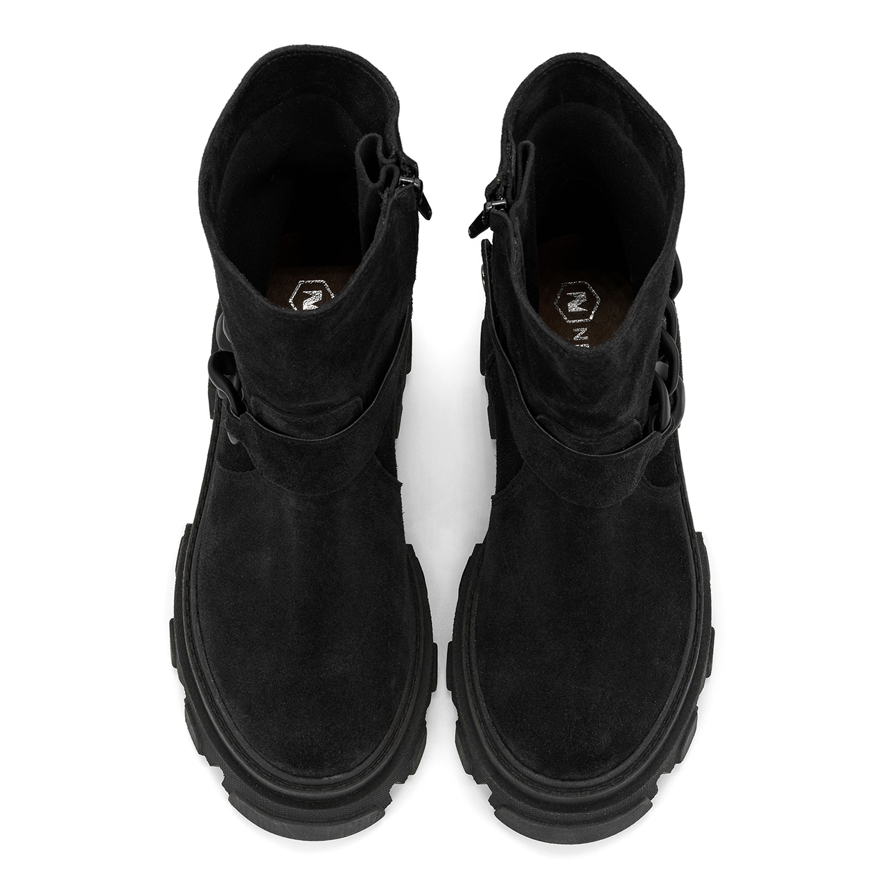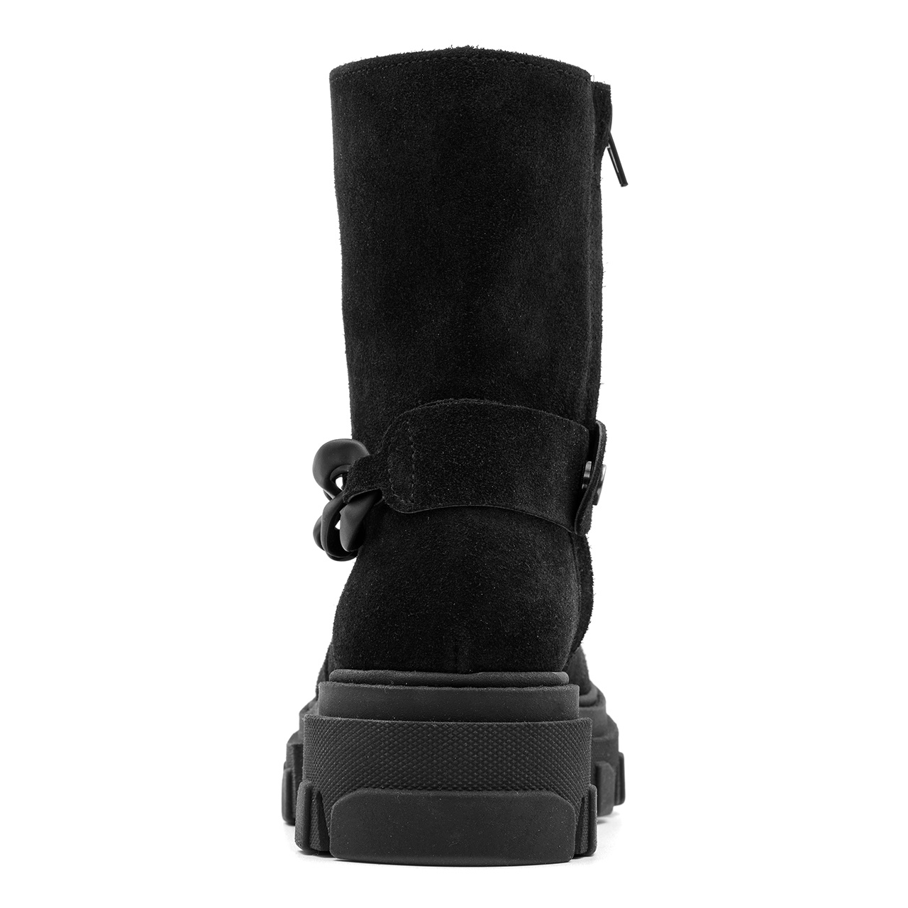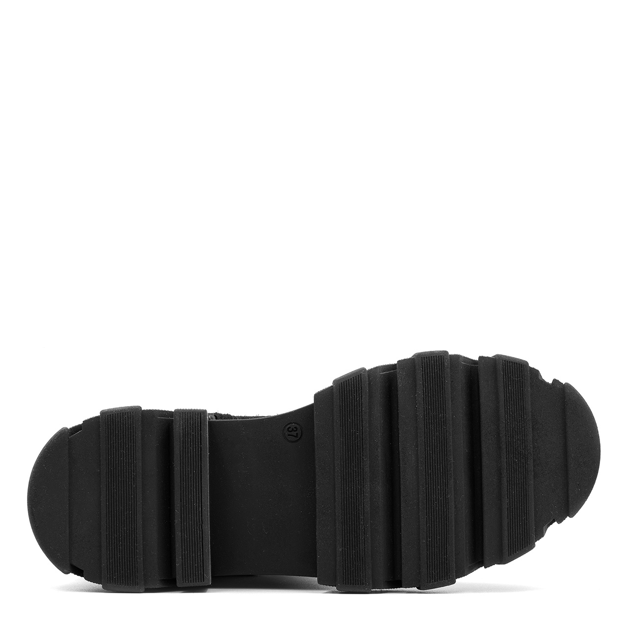 Czarne, wsuwane botki na grubej podeszwie z naturalnej skóry welurowej. Grubość podeszwy z przodu buta wynosi około 3,5 cm, z tyłu około 5 cm. Model wzbogacony został o odpinany pasek z lekkim, czarnym łańcuchem oraz boczny zamek, który pełni funkcję estetyczną i funkcjonalną. Przód buta zaokrąglony. Podszewkę uszyto z materiału wkładkę w botkach wykonano z naturalnej skóry. Szerokość cholewki na górze około 31 cm, a jej wysokość mierzona od obcasa wynosi około 17 cm. Wymiary podawane na kartach produktów to wymiary orientacyjne i odnoszą się do rozmiaru 37.