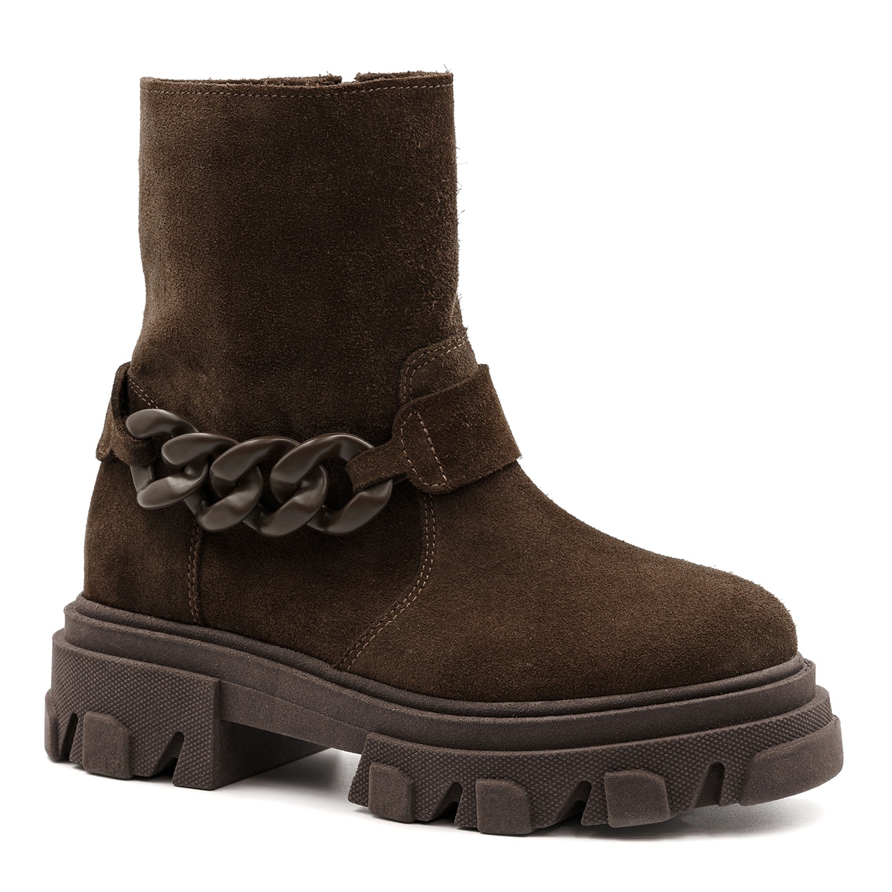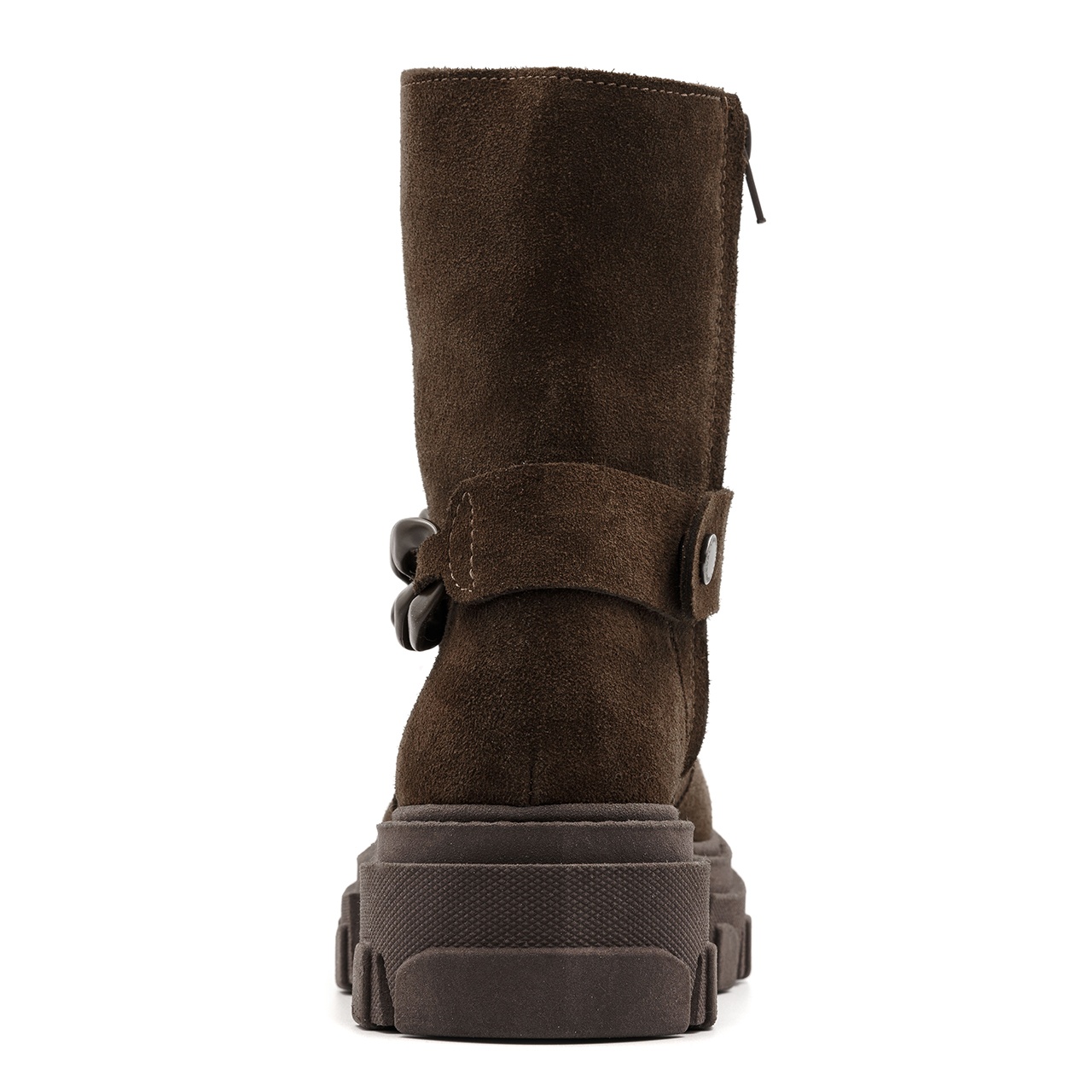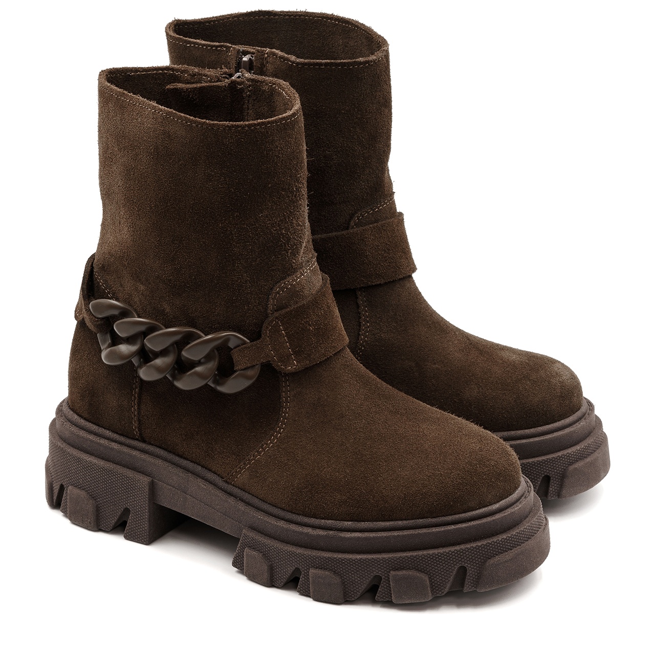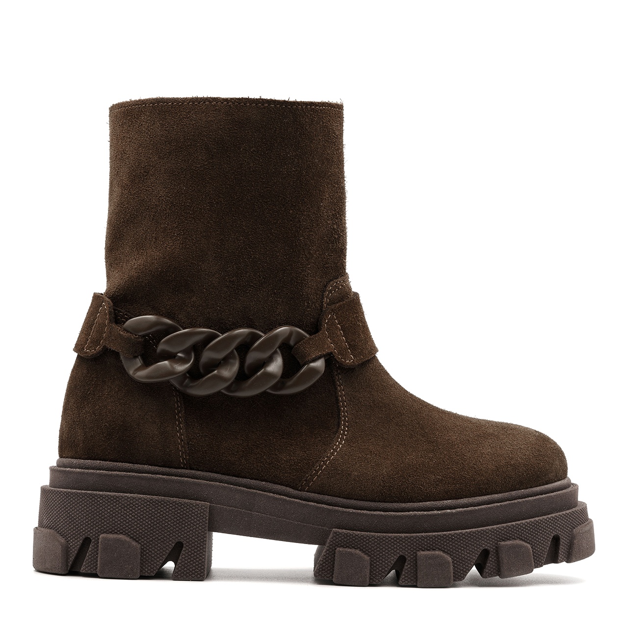 Brązowe welurowe botki z brązowym łańcuchem 241D
