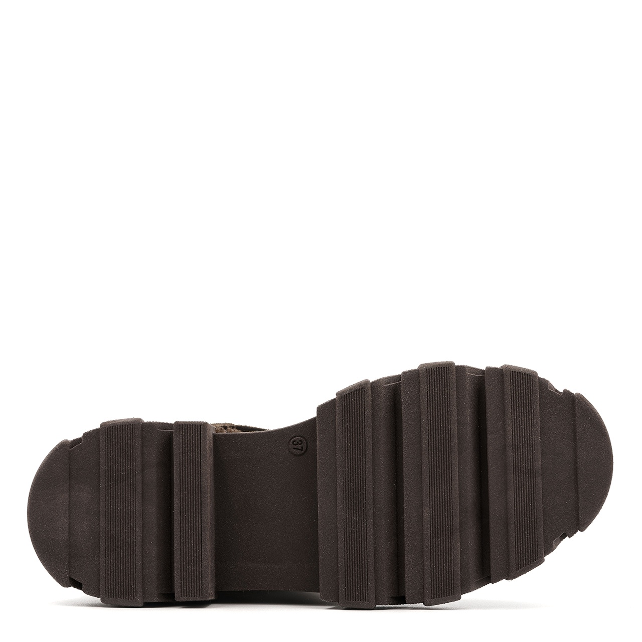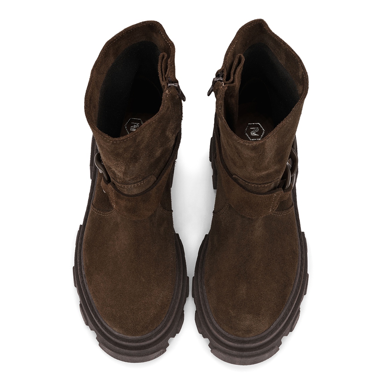 Brązowe, wsuwane botki na grubej podeszwie z naturalnej skóry welurowej. Grubość podeszwy z przodu buta wynosi około 3,5 cm, z tyłu około 5 cm. Model wzbogacony został o odpinany pasek z lekkim, brązowym łańcuchem oraz boczny zamek, który pełni funkcję estetyczną i funkcjonalną. Przód buta zaokrąglony. Podszewkę uszyto z materiału wkładkę w botkach wykonano z naturalnej skóry. Szerokość cholewki na górze około 31 cm, a jej wysokość mierzona od obcasa wynosi około 17 cm. Wymiary podawane na kartach produktów to wymiary orientacyjne i odnoszą się do rozmiaru 37.