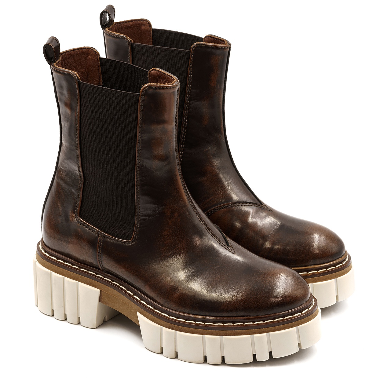 Brązowe, botki na grubej podeszwie wykonano z naturalnej skóry, który może różnić się w nieznacznym stopniu od modelu przedstawionego na zdjęciach. Wysokość podeszwy z przodu buta wynosi około 3 cm, z tyłu około 5,5 cm. Po bokach ocieplonej cholewki wszyto szeroką, brązową gumę. Przód buta zaokrąglony. Podszewka i wkładka wykonane są z filcu. Szerokość cholewki na górze około 27 cm po rozciągnięciu 37, a jej wysokość mierzona od obcasa wynosi około 16 cm. Wymiary podawane na kartach produktów to wymiary orientacyjne i odnoszą się do rozmiaru 37.