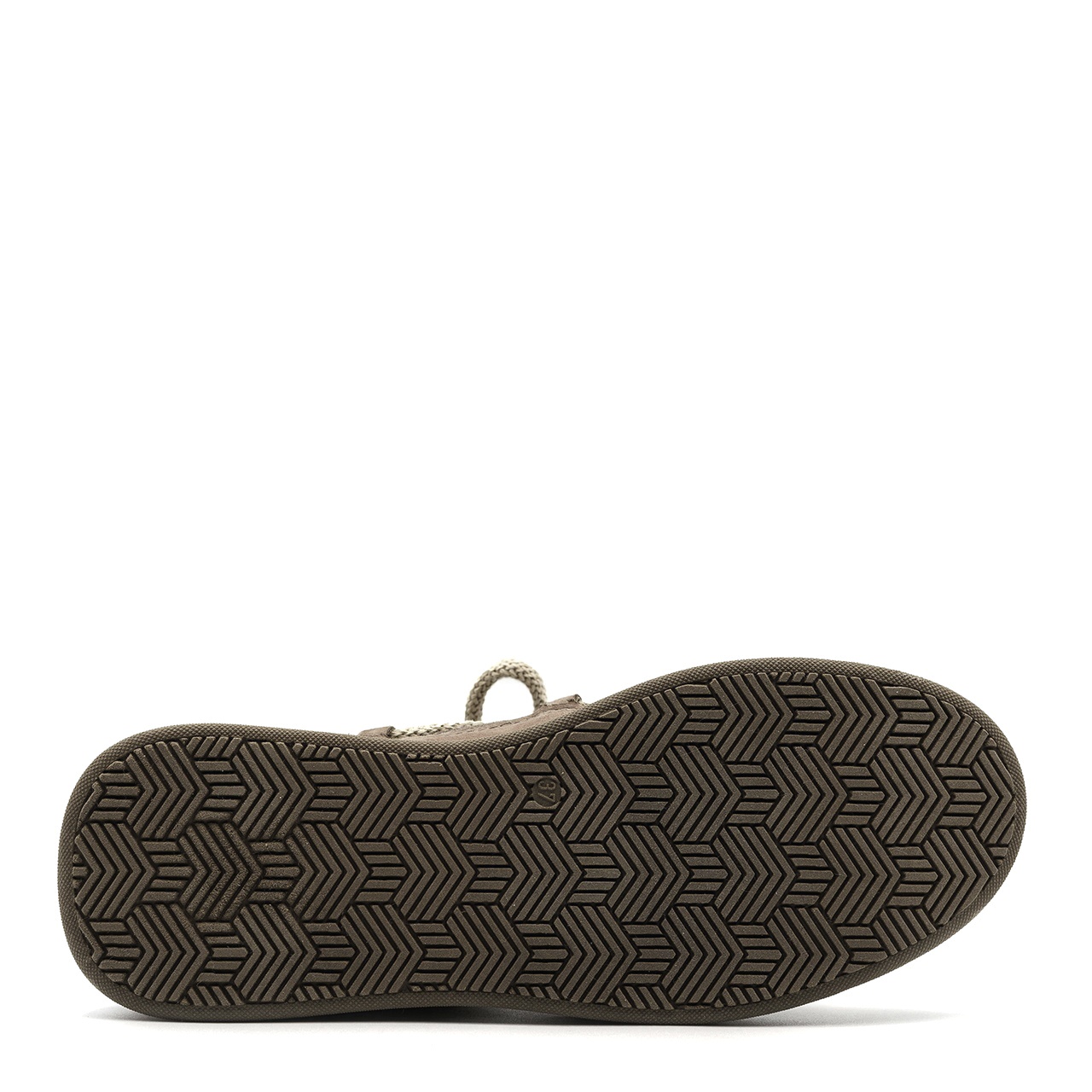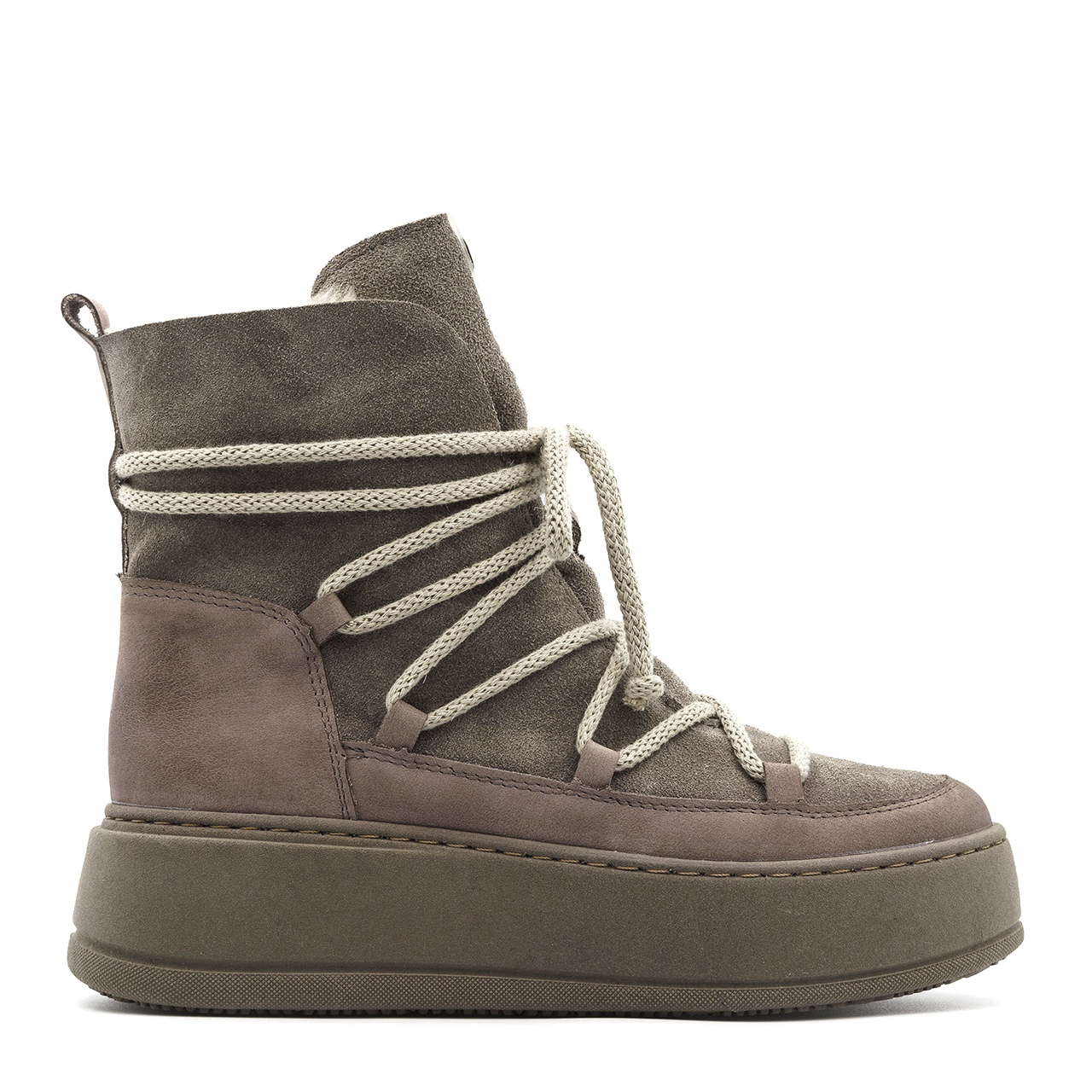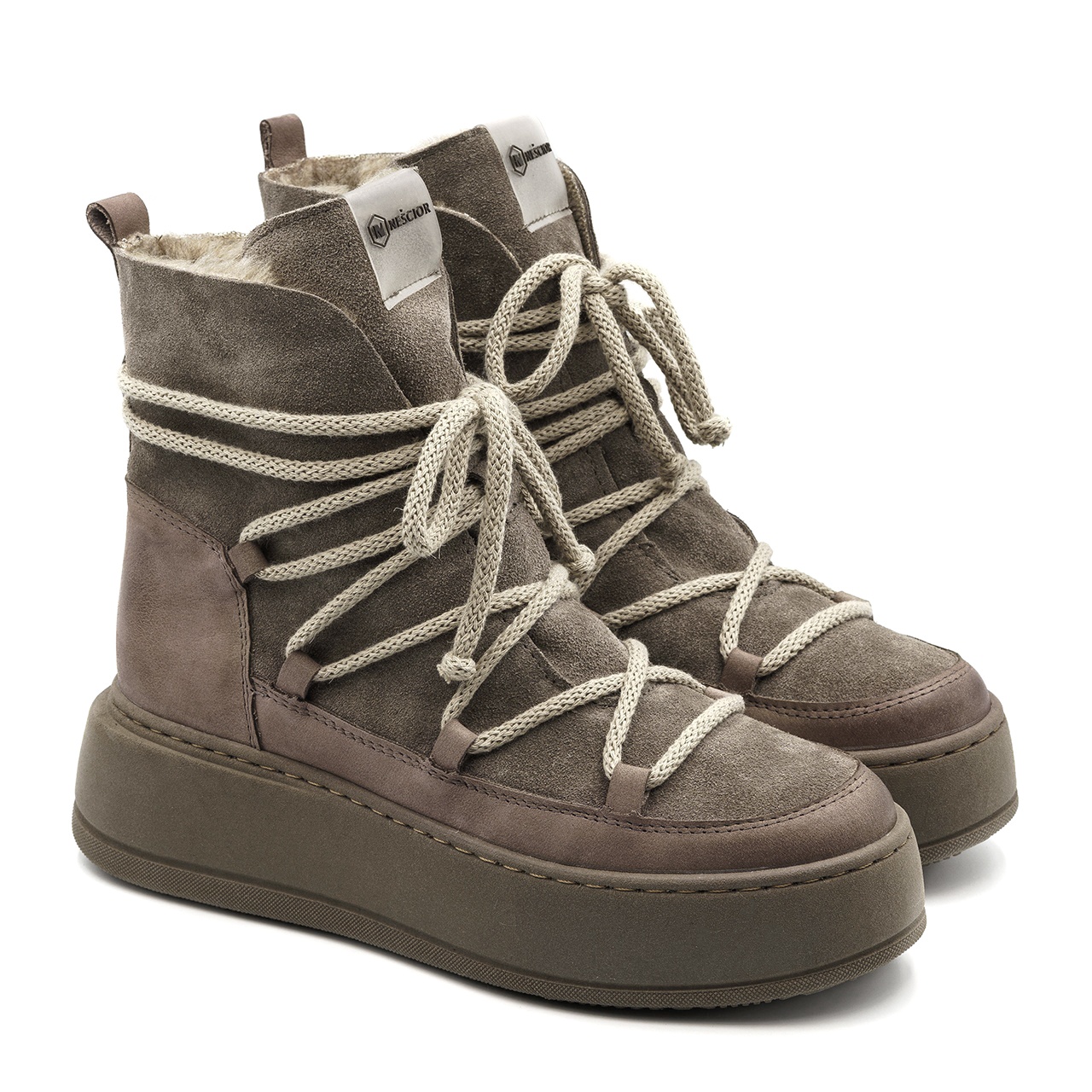 Kawowe, sznurowane botki wyprodukowano z połączenia naturalnej skóry welurowej i naturalnego nubuku. Cholewkę przyklejono i przyszyto do podeszwy, której wysokość z przodu buta wynosi około 3,5 cm, z tyłu około 5 cm. Na języku botków przyszyta transparentna naszywka z logo firmy Neścior. Buty ocieplono sztucznym futerkiem. Wkładkę wykonano z filcu. Orientacyjne wymiary dla rozmiaru 37 to: szerokość cholewki na górze około 25 cm, a jej wysokość mierzona od podeszwy wynosi około 13 cm.
