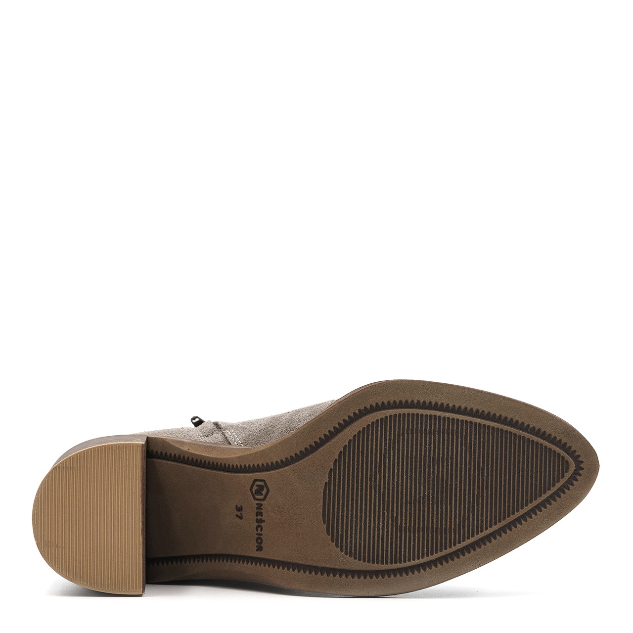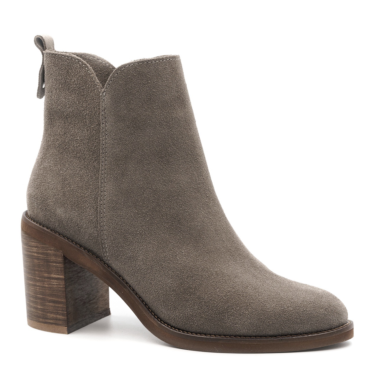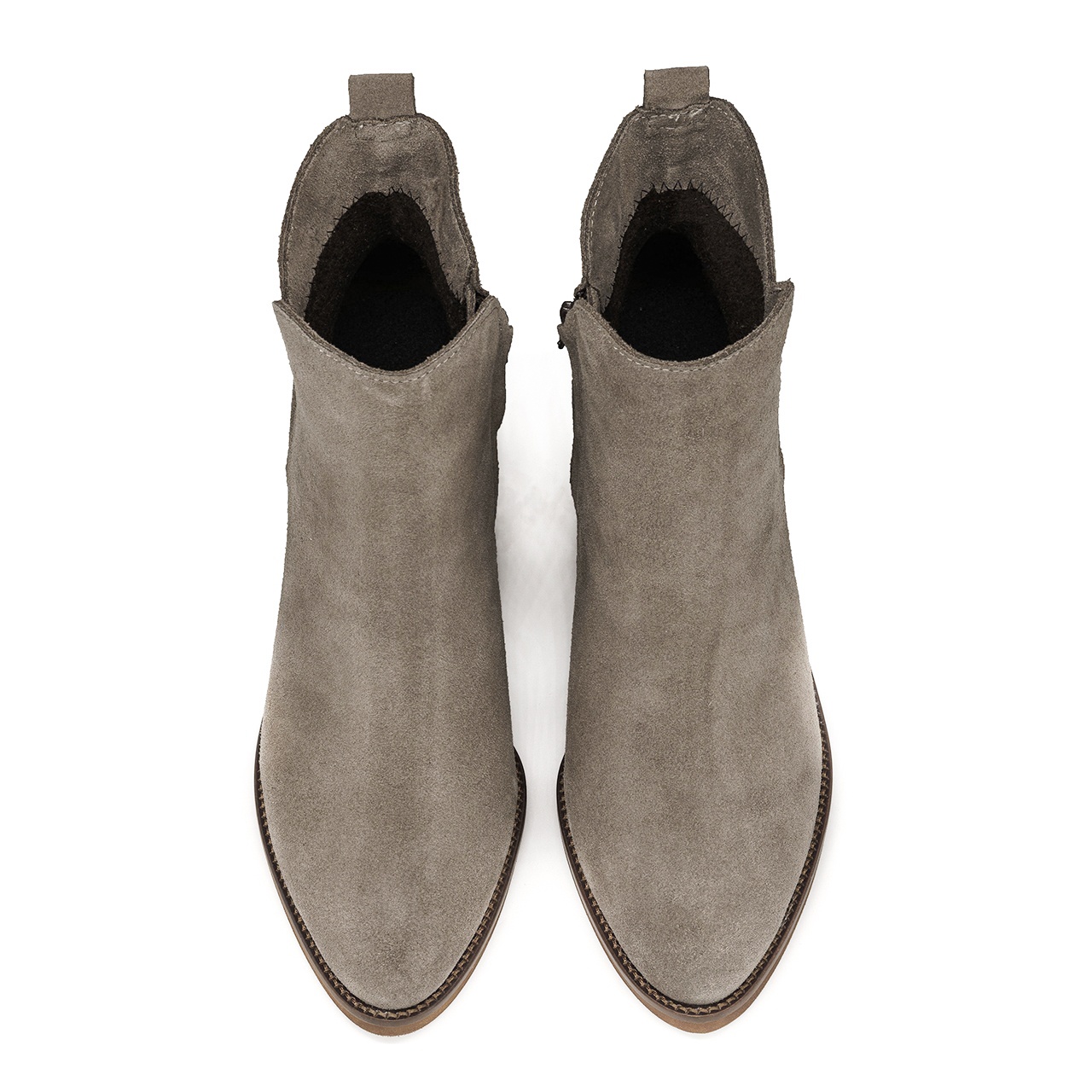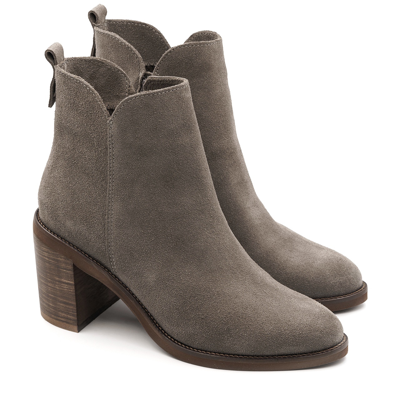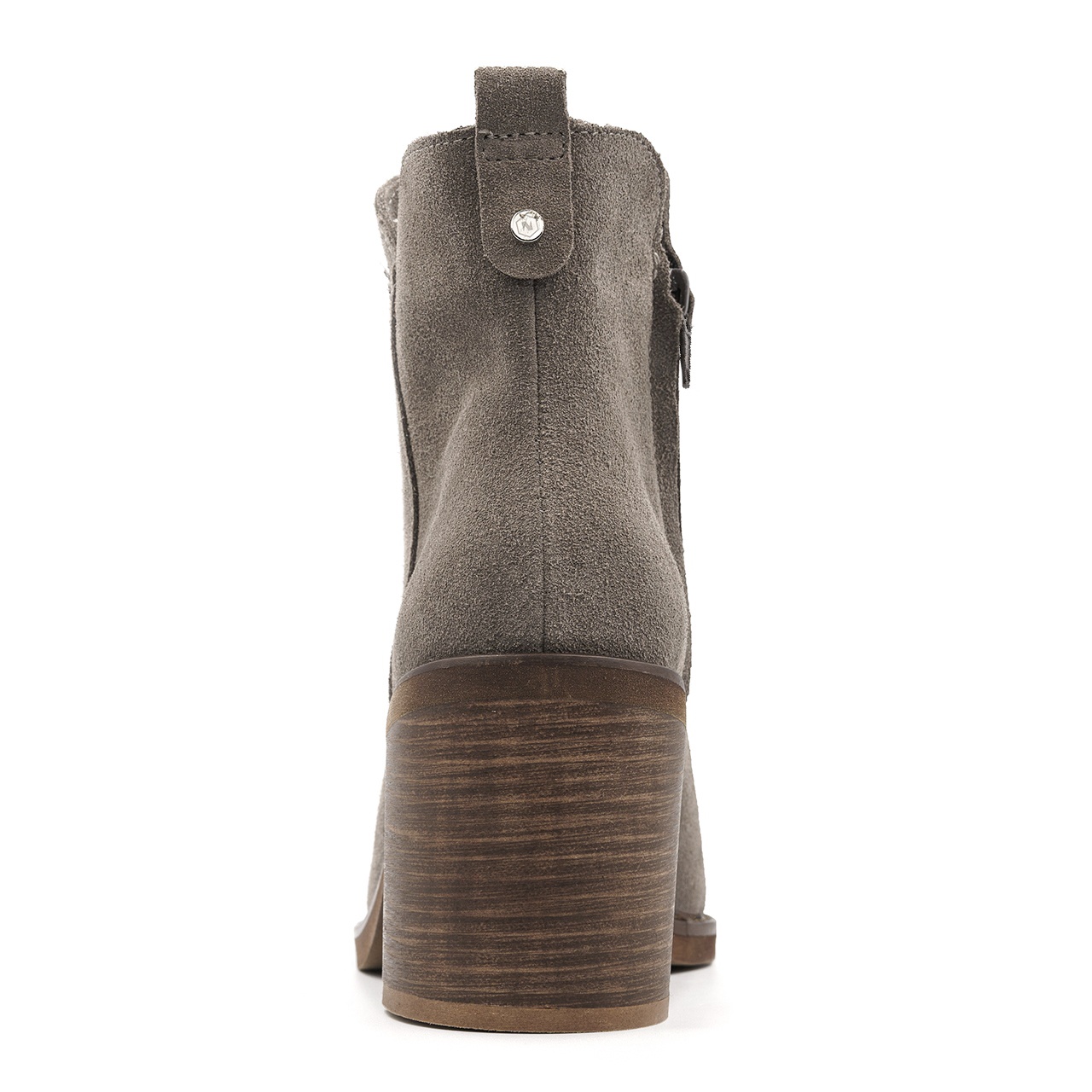 Kawowe botki na grubym 7,5 cm obcasie o kształcie klocka. Buty wykonano z naturalnej skóry welurowej. Od wewnętrznej strony cholewki wszyto suwak. Wkładkę wykonano z filcu. Podeszwa wynosi 1 cm grubości. Orientacyjne wymiary dla rozmiaru 37 to: szerokość cholewki na górze około 27 cm, a jej wysokość mierzona od podeszwy wynosi około 13 cm.