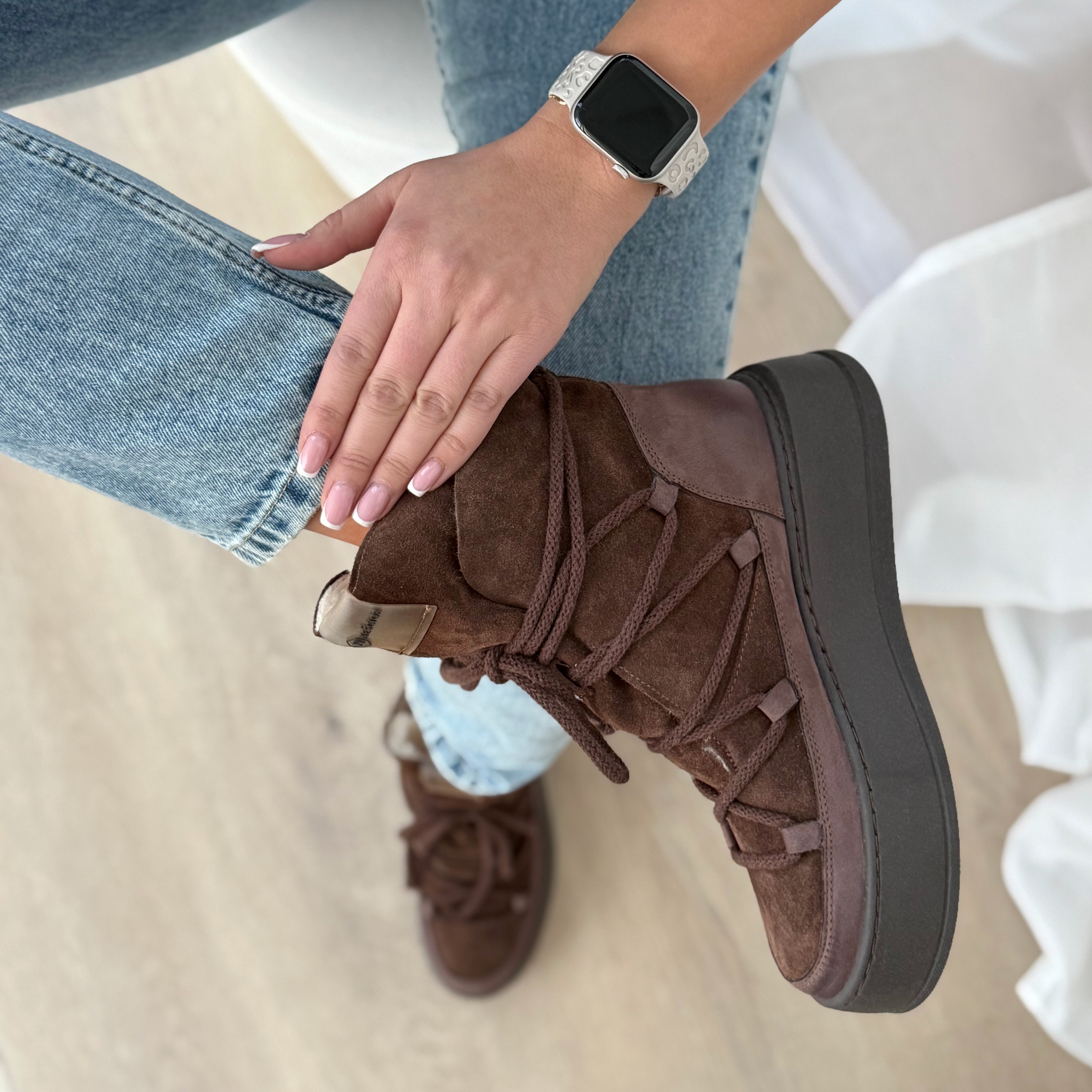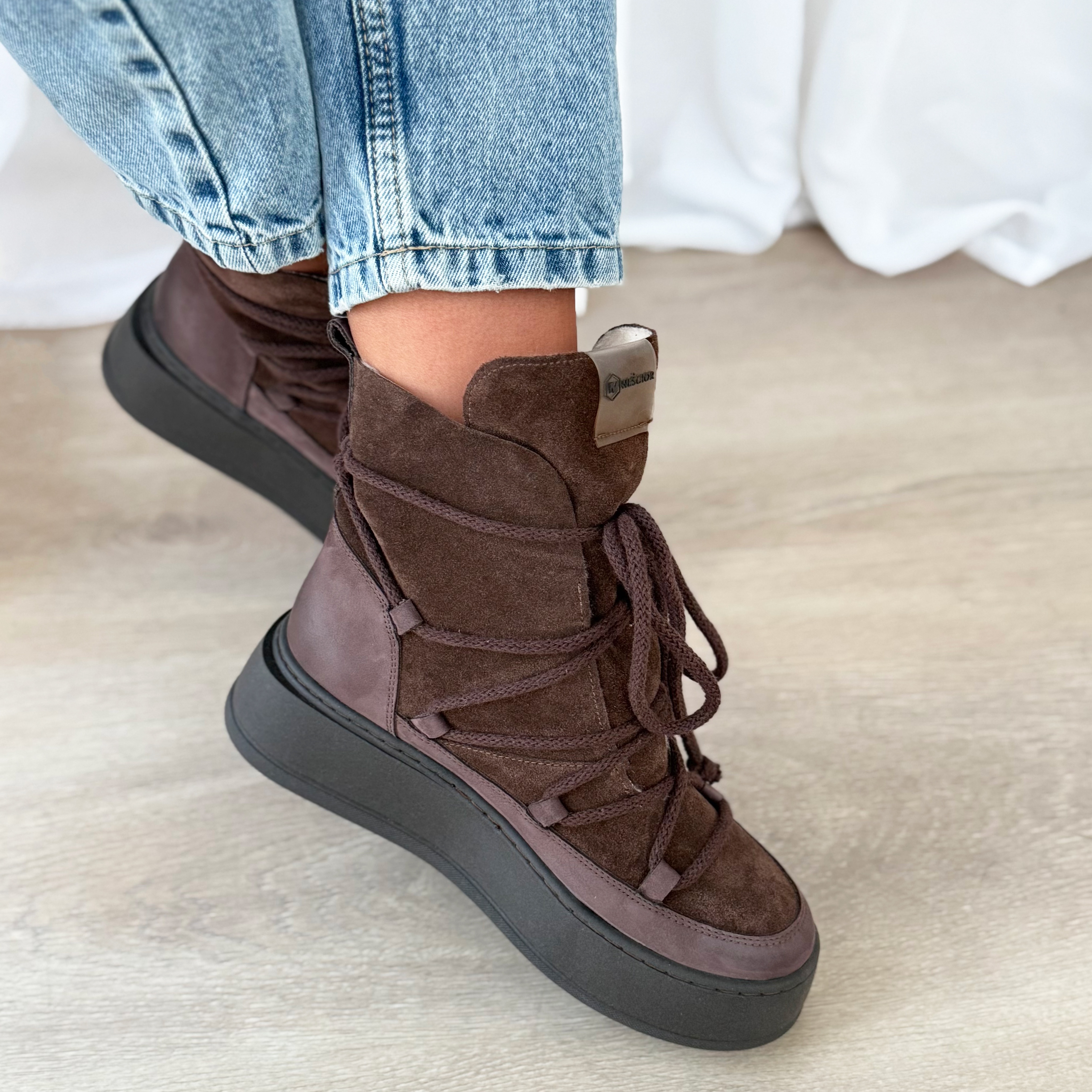 Czekoladowe, sznurowane botki wyprodukowano z połączenia naturalnej skóry welurowej i naturalnego nubuku. Cholewkę przyklejono i przyszyto do podeszwy, której wysokość z przodu buta wynosi około 3,5 cm, z tyłu około 5 cm. Na języku botków przyszyta transparentna naszywka z logo firmy Neścior. Buty ocieplono sztucznym futerkiem. Wkładkę wykonano z filcu. Orientacyjne wymiary dla rozmiaru 37 to: szerokość cholewki na górze około 25 cm, a jej wysokość mierzona od podeszwy wynosi około 13 cm.