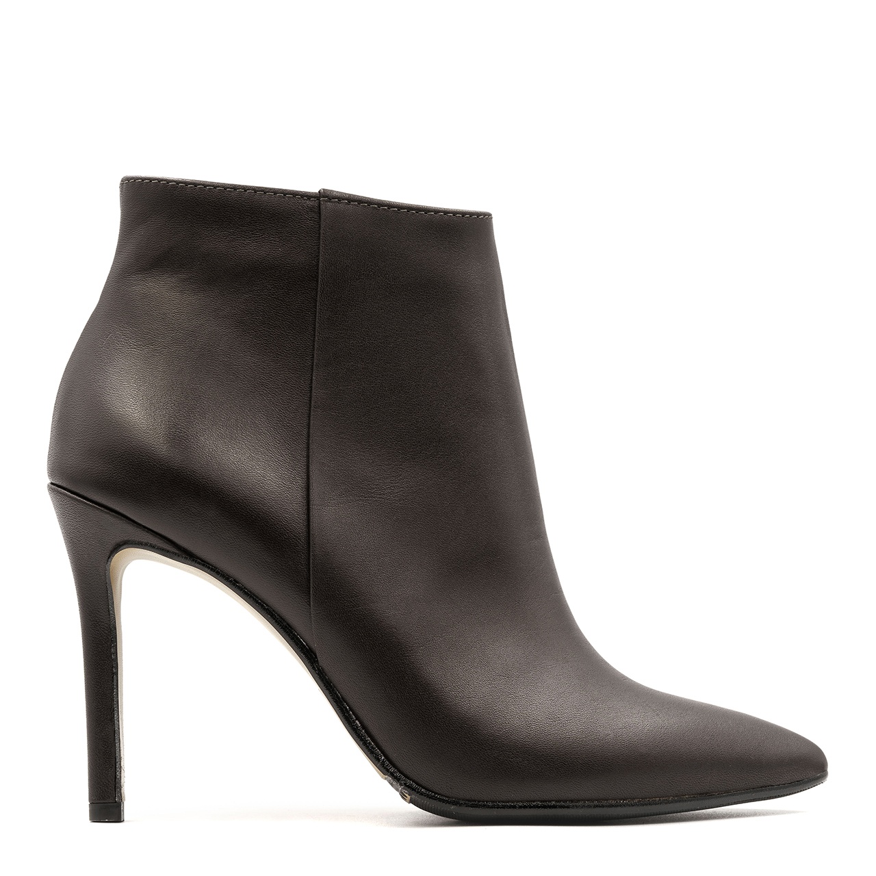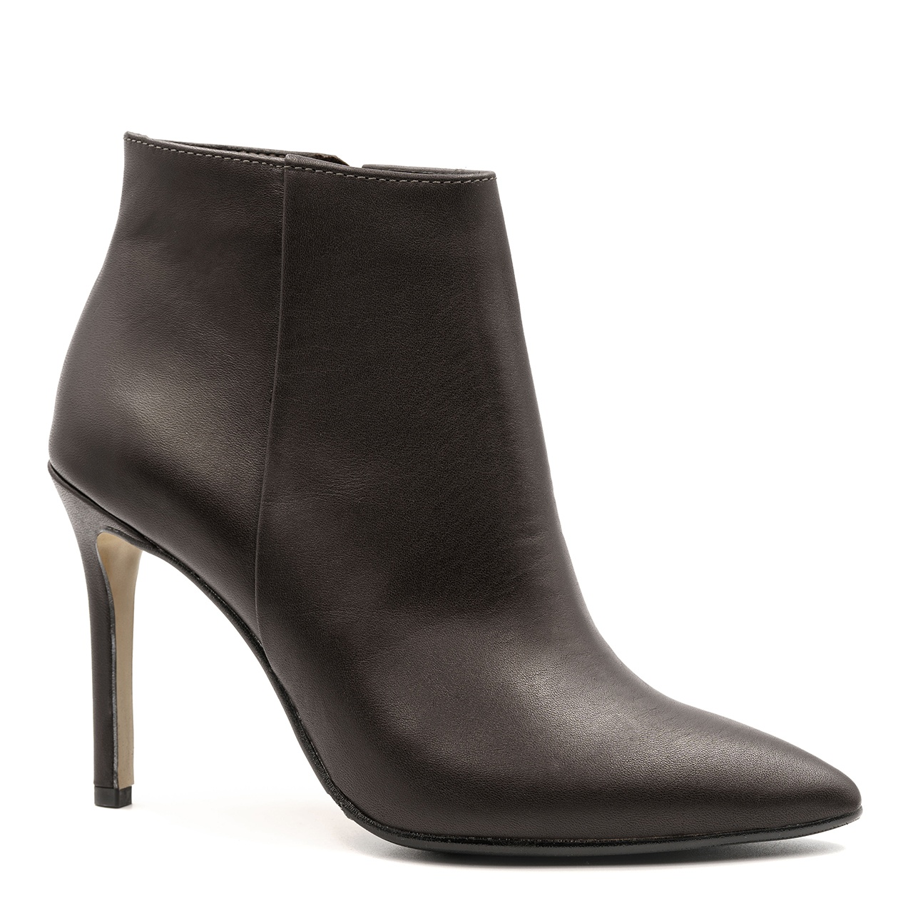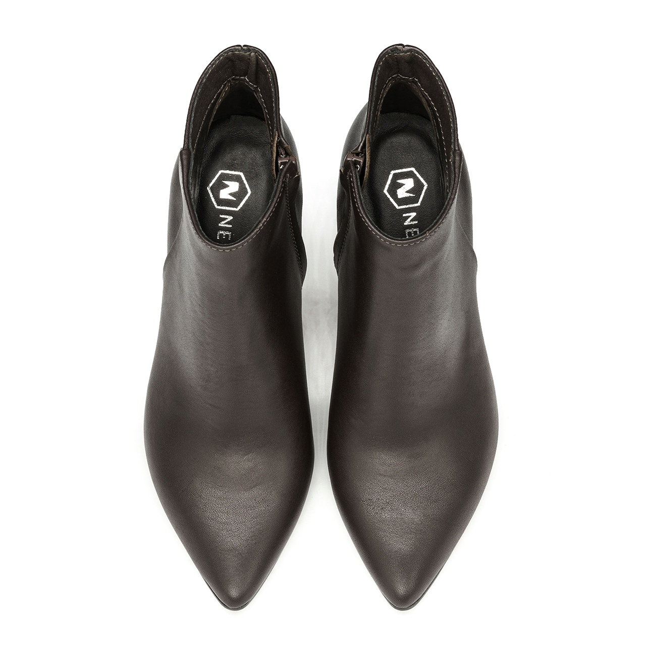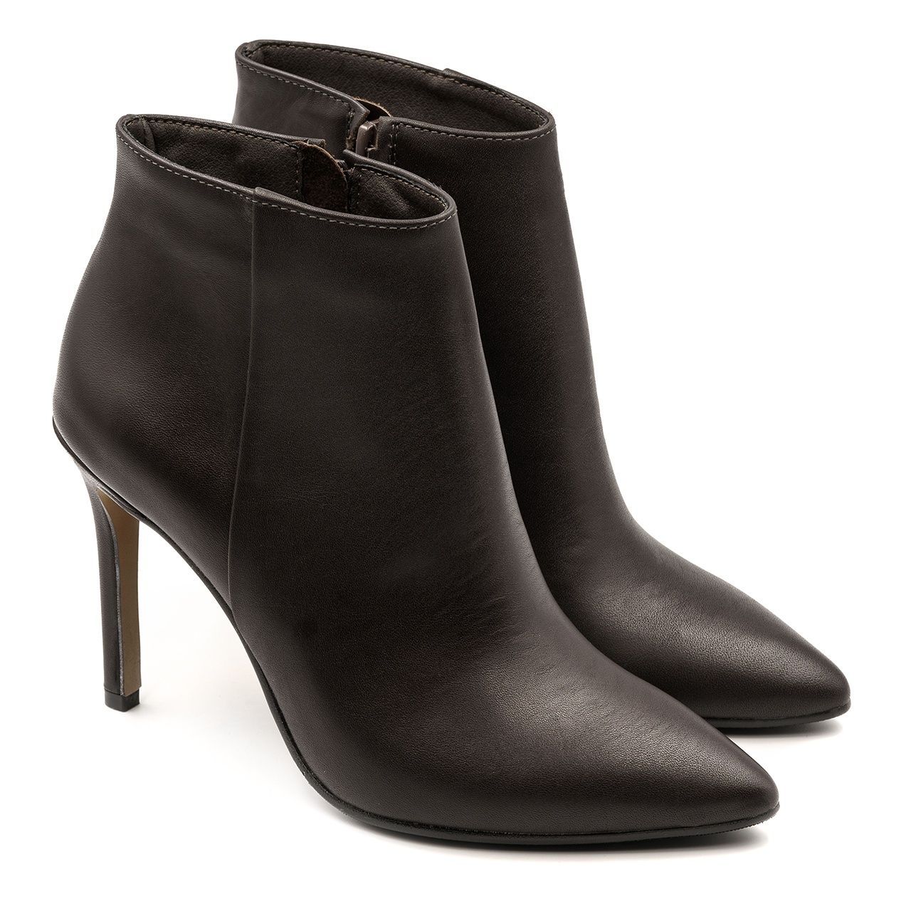 Botki skórzane w kolorze czekolady na wysokiej 9,5 cm szpilce. Buty wyprodukowano z naturalnej skóry licowej. Przód buta w szpic. Od wewnętrznej strony cholewki wszyto suwak. Wkładkę wykonano ze skóry. Szerokość cholewki na górze około 24 cm, a jej wysokość mierzona od obcasa wynosi około 9 cm. Wymiary podawane na kartach produktów to wymiary orientacyjne i odnoszą się do rozmiaru 37.