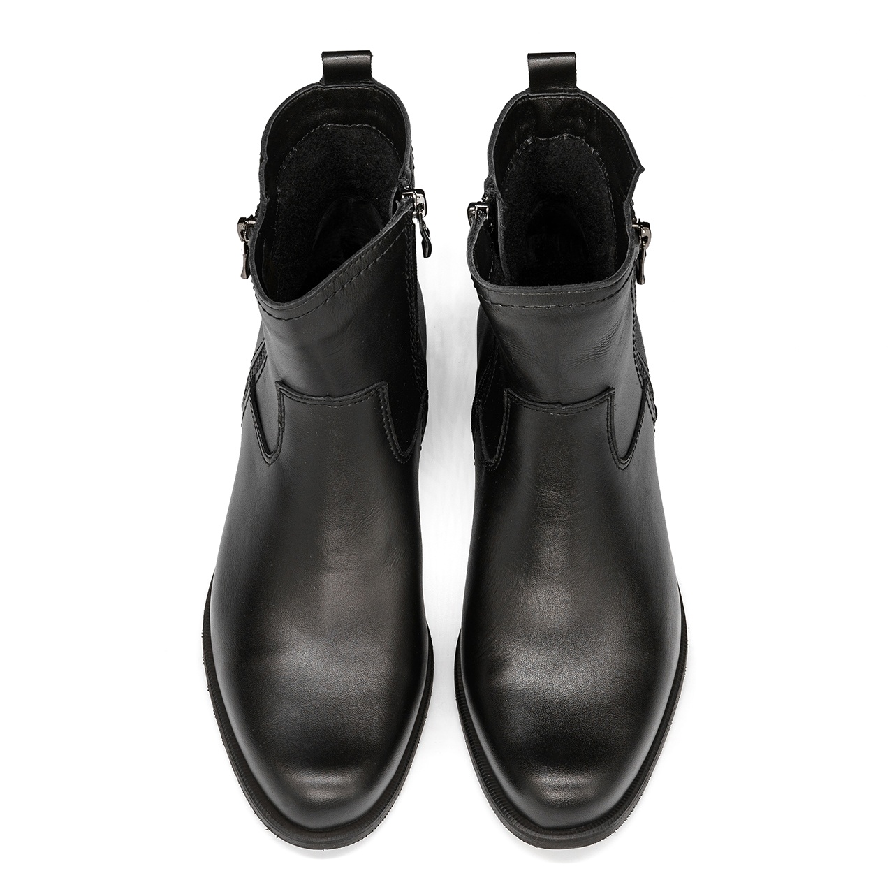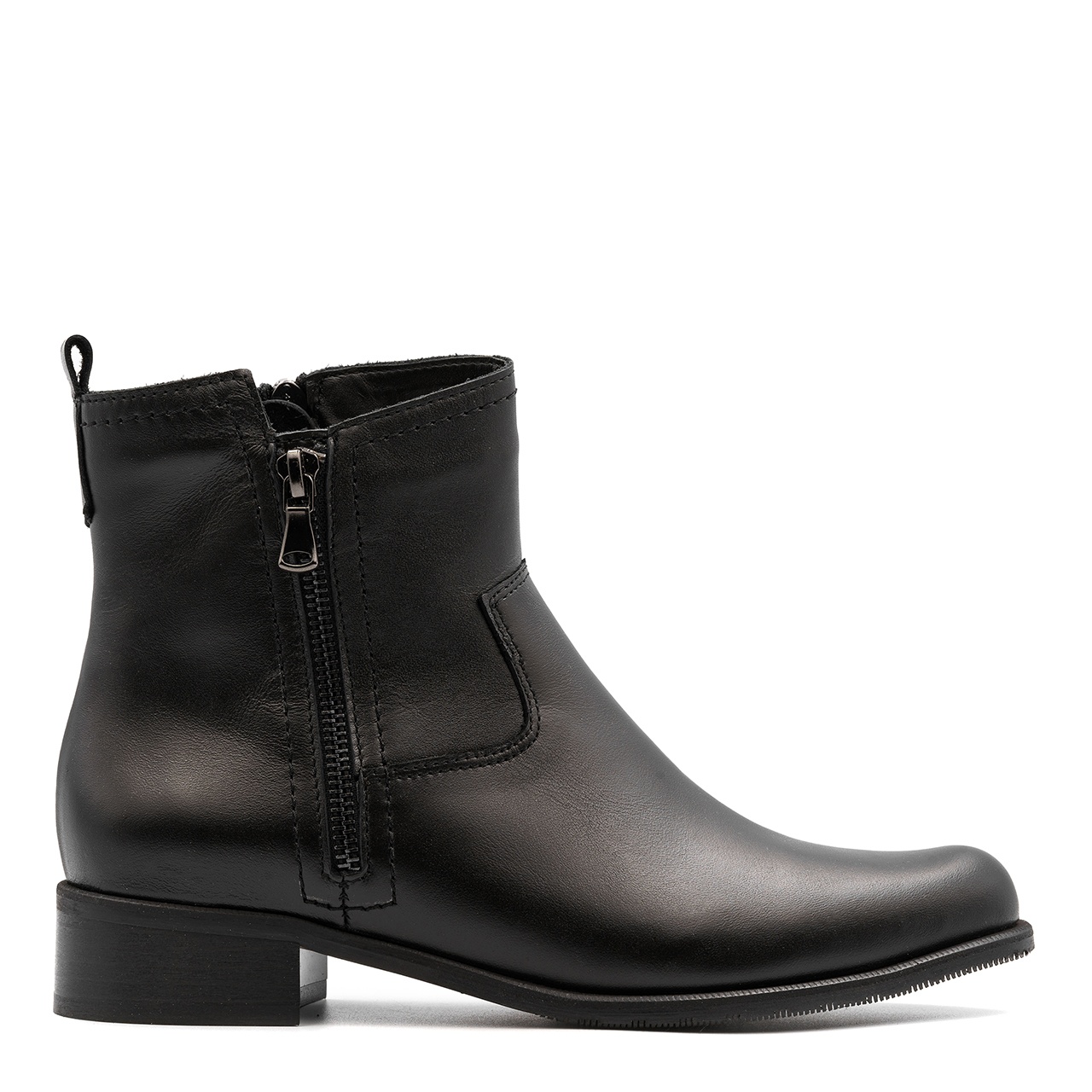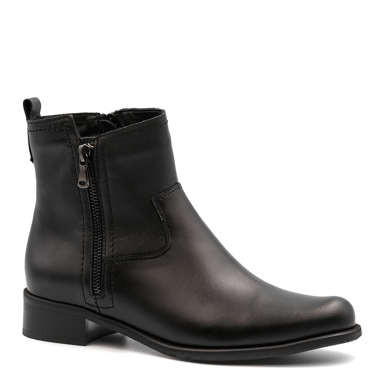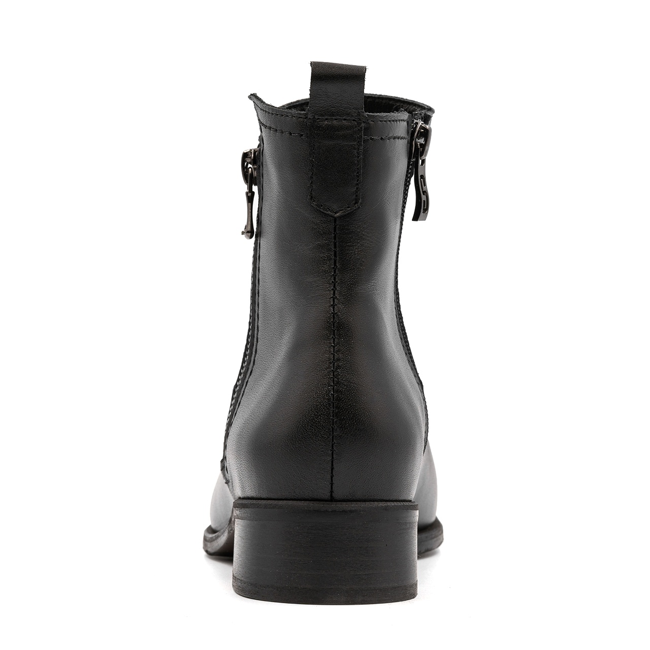 Czarne botki na niskim 3 cm obcasie. Obuwie wyprodukowano z naturalnej skóry licowej. Przód buta delikatnie okrągły. Od wewnętrznej strony cholewki wszyto suwak. Zamek od zewnętrznej strony pełni rolę ozdoby. Wkładkę i podszewkę wykonano z ciepłego filcu. Szerokość cholewki na górze około 26 cm, a wysokość mierzona od podeszwy wynosi około 14,5 cm. Wymiary podawane na kartach produktów to wymiary orientacyjne i odnoszą się do rozmiaru 37.
