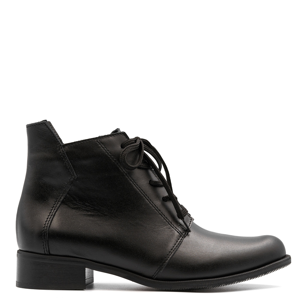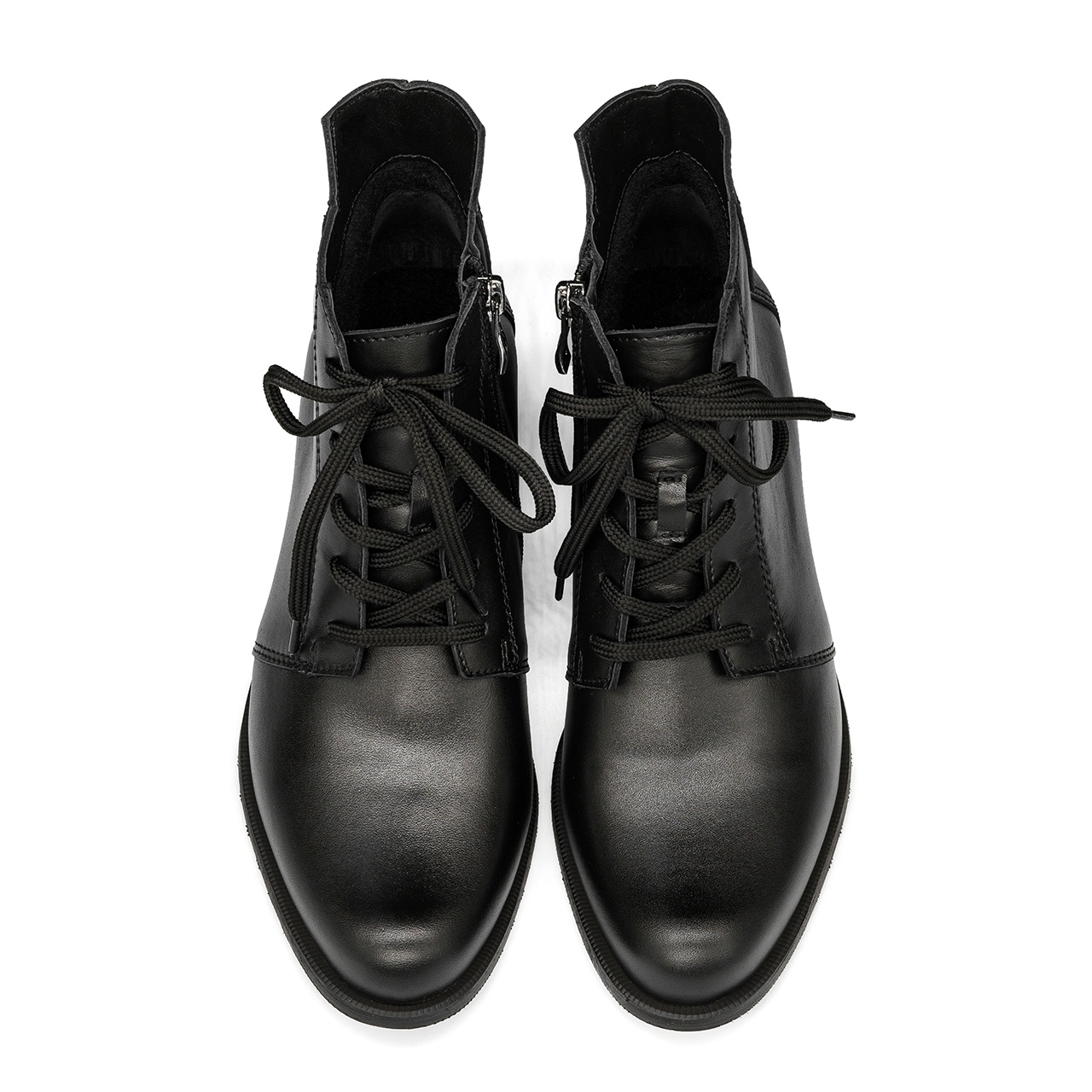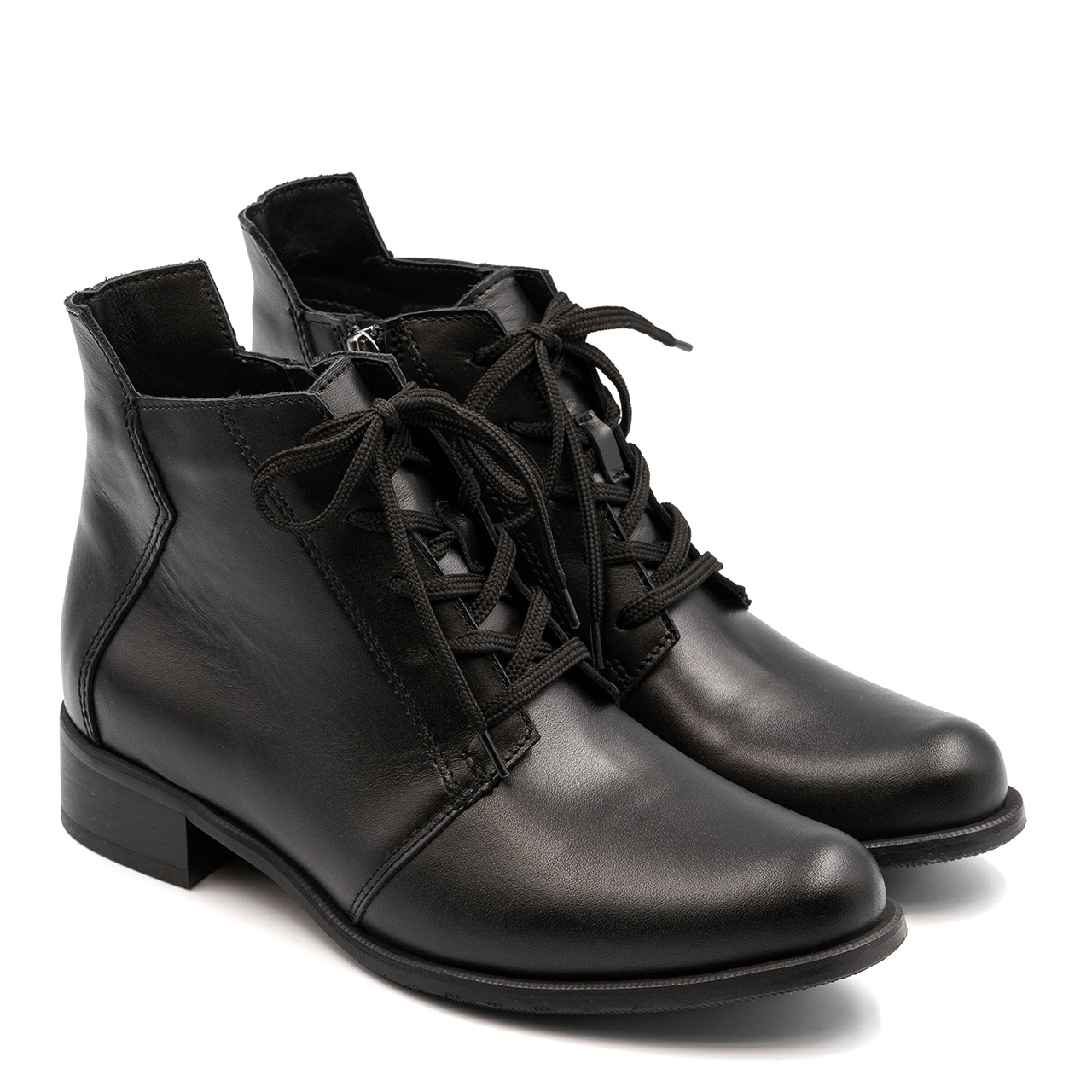 Czarne botki na niskim 3 cm obcasie. Obuwie wyprodukowano z naturalnej skóry licowej. Przód buta delikatnie okrągły. Od wewnętrznej strony cholewki wszyto suwak. Na przodzie obuwia umieszczono sznurowadła, które ułatwiają w założeniu obuwia. Wkładkę i podszewkę wykonano z ciepłego filcu. Szerokość cholewki na górze około 23 cm, a jej wysokość mierzona od podeszwy wynosi około 12 cm. Wymiary podawane na kartach produktów to wymiary orientacyjne i odnoszą się do rozmiaru 37.