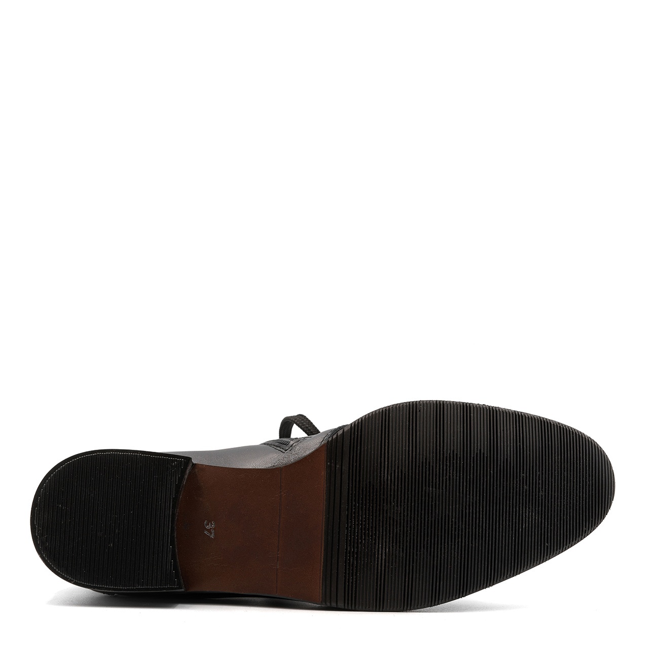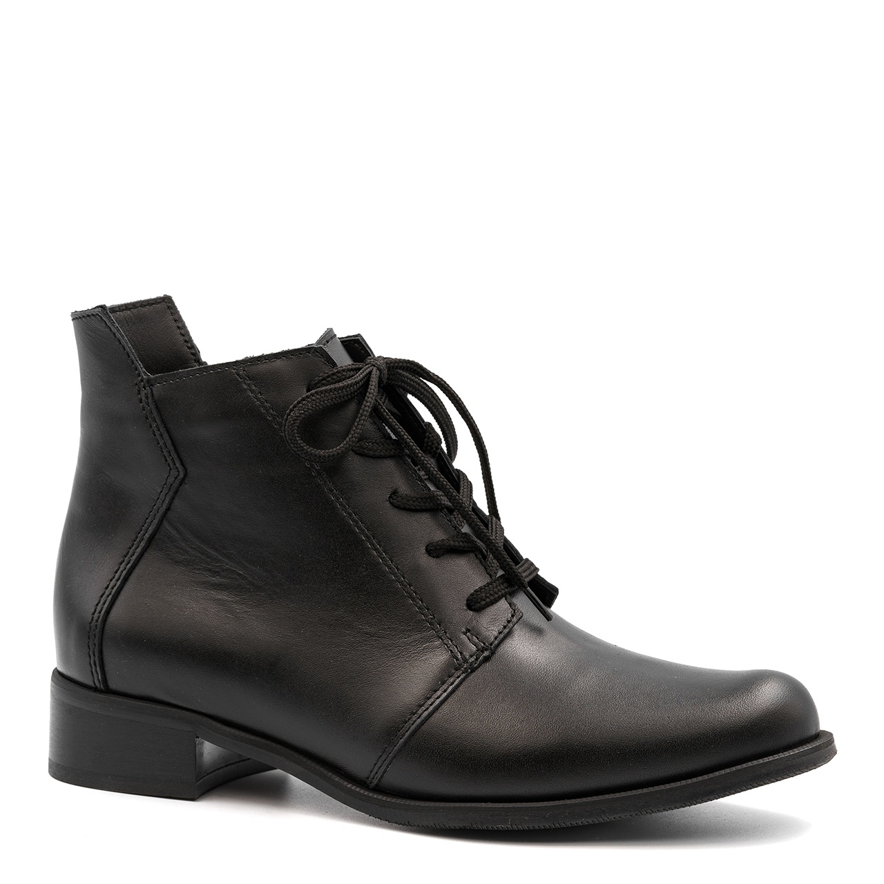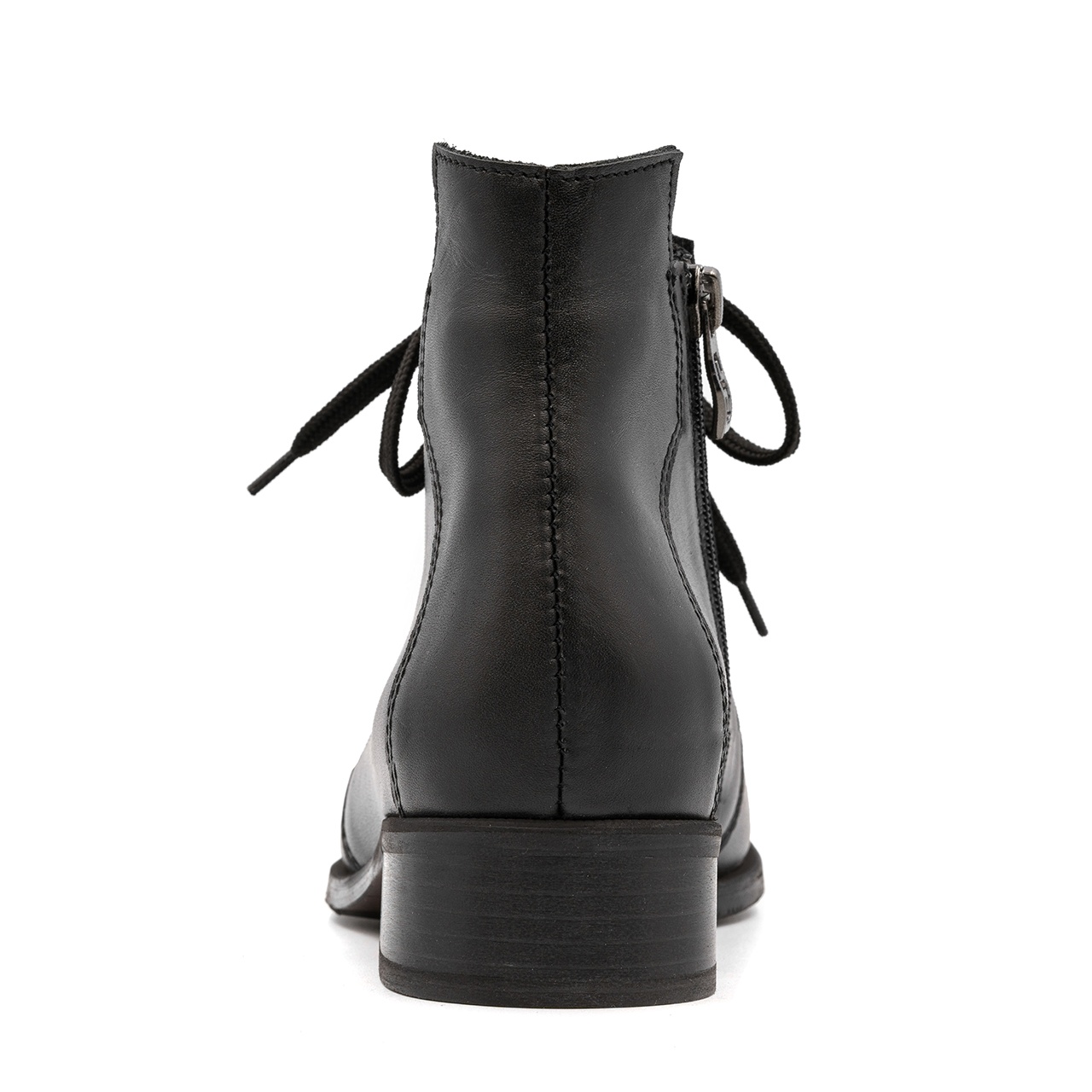 Czarne botki na niskim 3 cm obcasie. Obuwie wyprodukowano z naturalnej skóry licowej. Przód buta delikatnie okrągły. Od wewnętrznej strony cholewki wszyto suwak. Na przodzie obuwia umieszczono sznurowadła, które ułatwiają w założeniu obuwia. Wkładkę i podszewkę wykonano z ciepłego filcu. Szerokość cholewki na górze około 23 cm, a jej wysokość mierzona od podeszwy wynosi około 12 cm. Wymiary podawane na kartach produktów to wymiary orientacyjne i odnoszą się do rozmiaru 37.