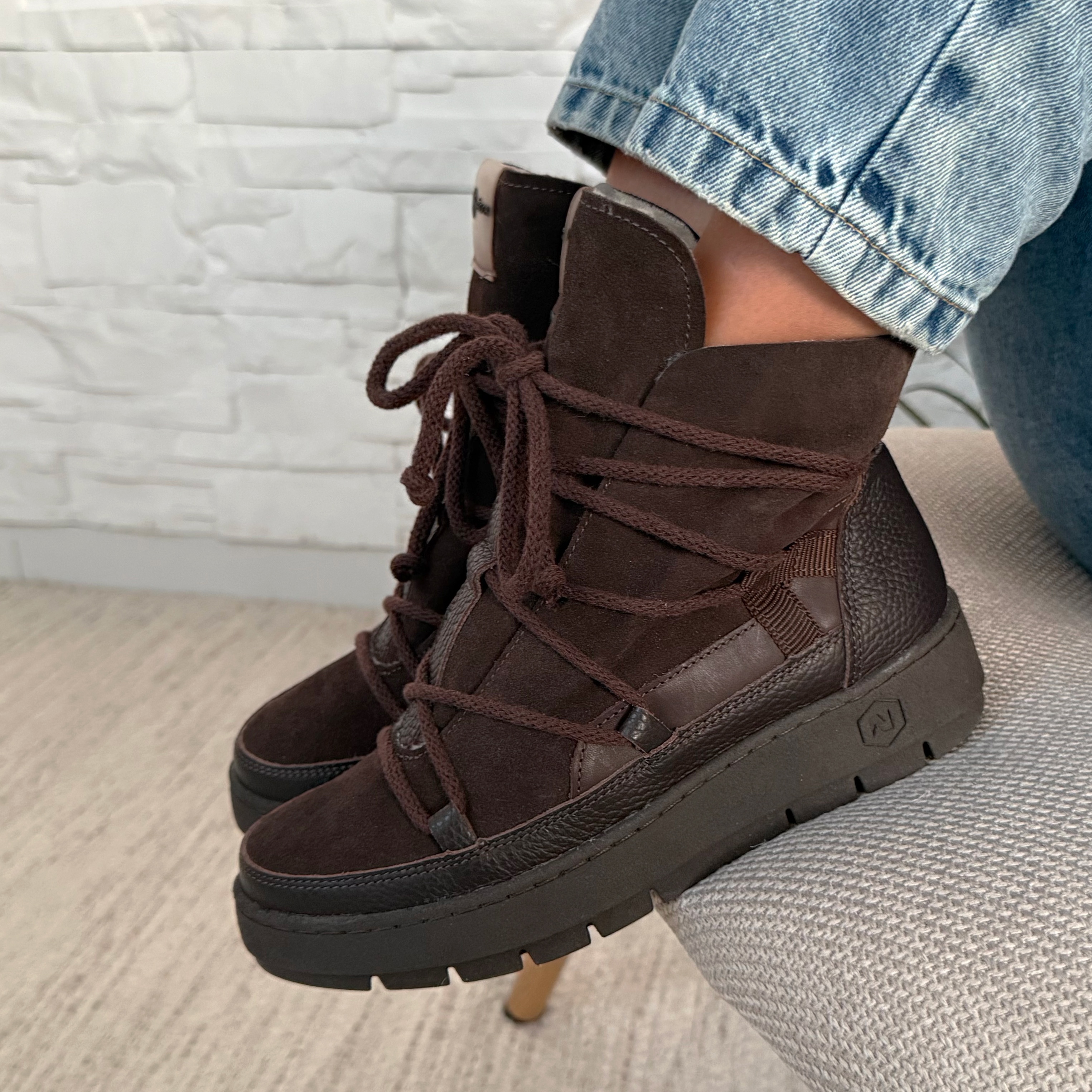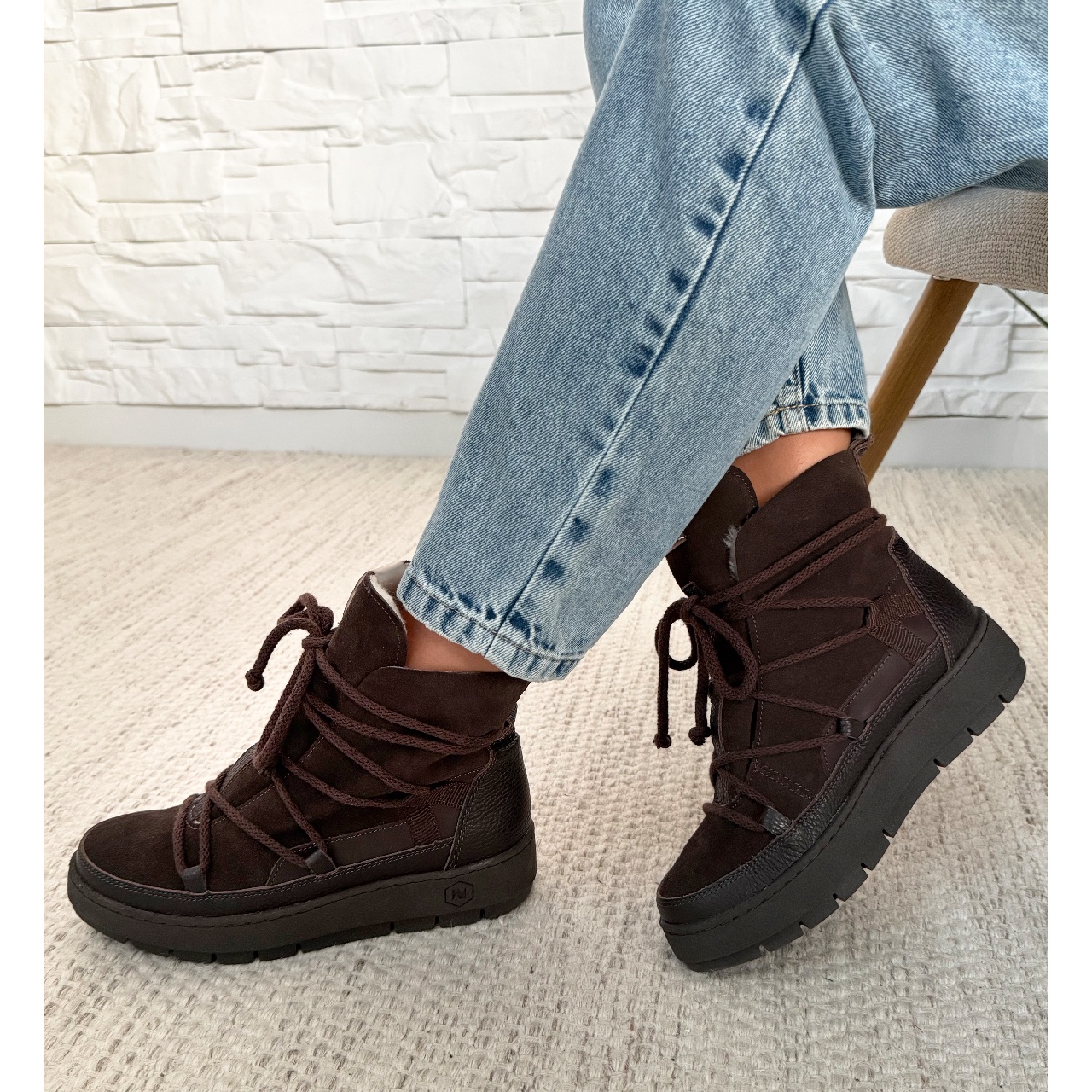 Ciemnobrązowe sznurowane botki wyprodukowano z połączenia naturalnej skóry welurowej i licowej skóry z widocznym uziarnieniem. Cholewkę przyklejono i przyszyto do płaskiej podeszwy z logo firmy Neścior. Wysokość podeszwy z przodu buta wynosi około 3 cm, z tyłu około 4 cm. Buty ocieplono sztucznym futerkiem. Wkładkę wykonano z filcu. Orientacyjna wysokość cholewki mierzona od podeszwy wynosi około 13 cm.
