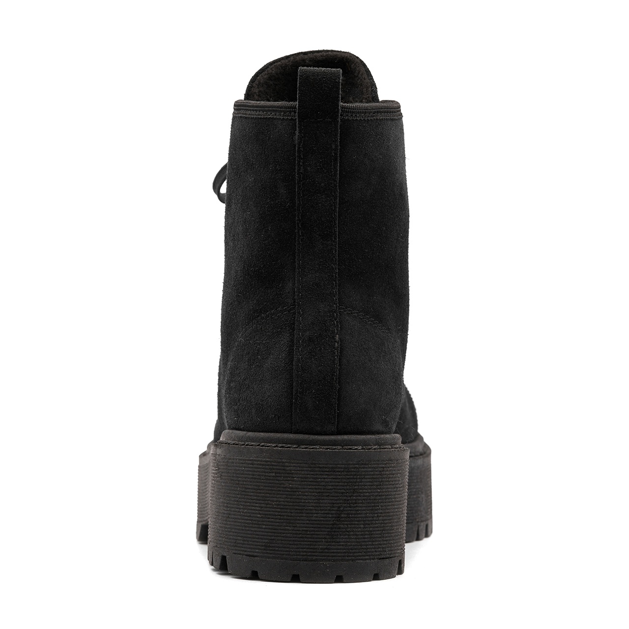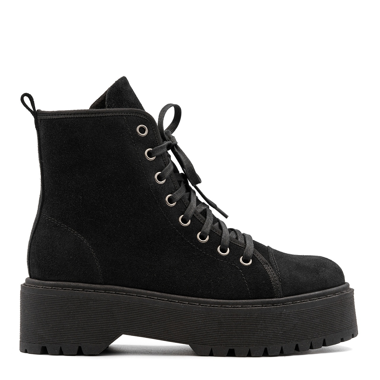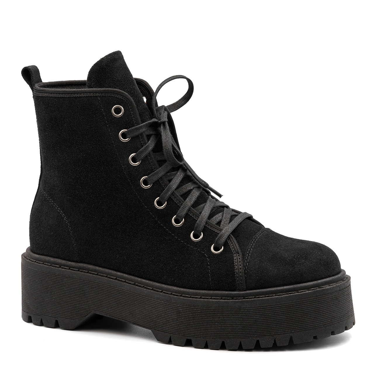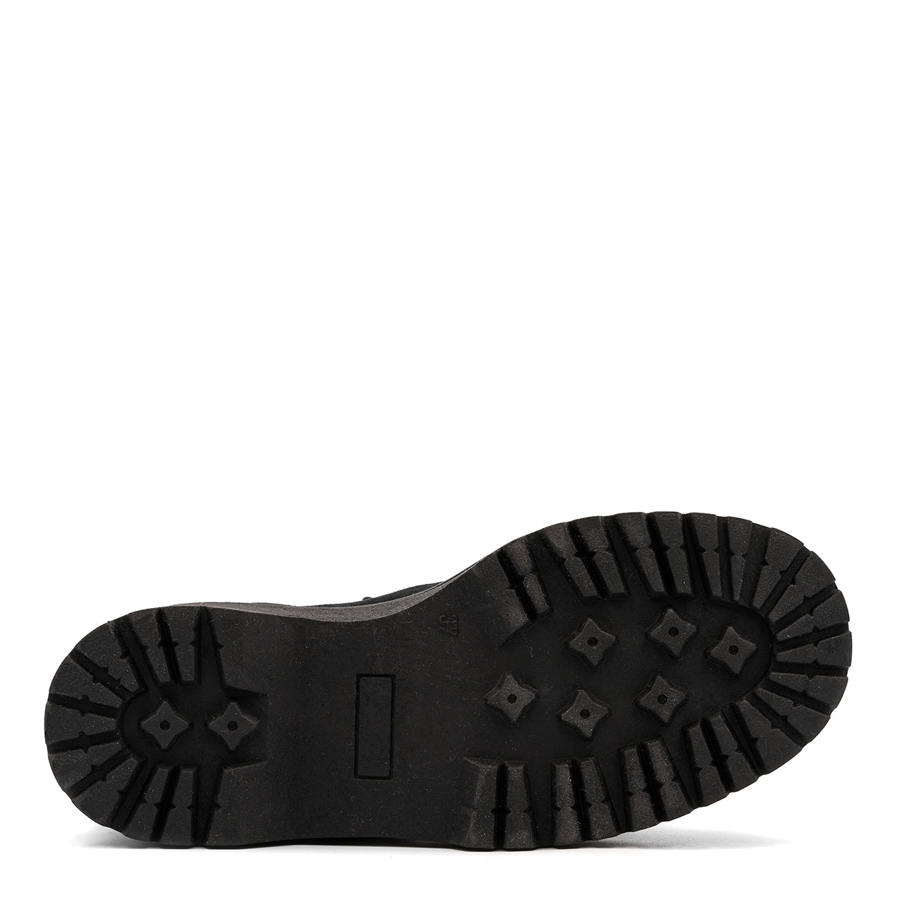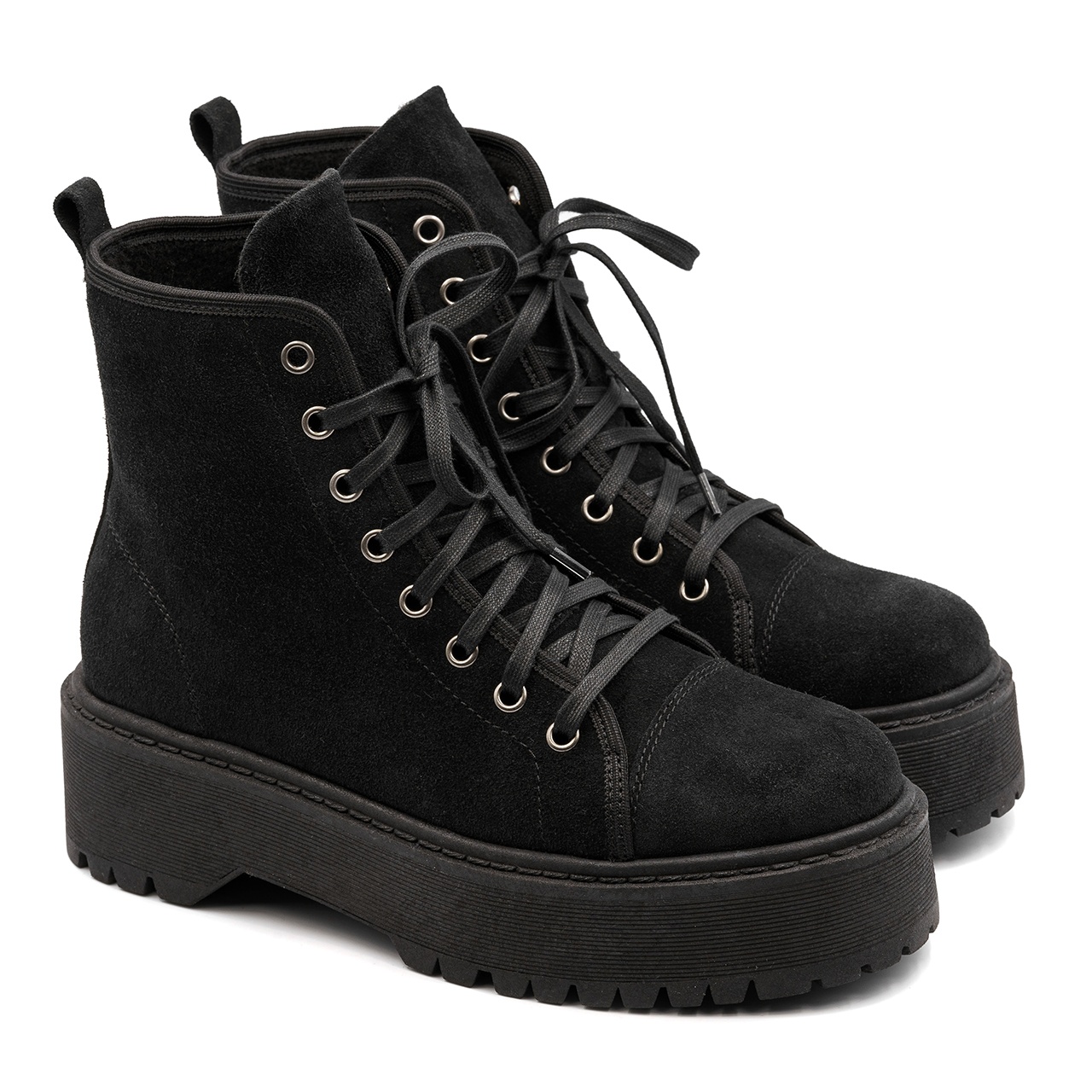Czarne sznurowane botki - workery za kostkę, na grubej podeszwie. Cholewkę w butach wykonano z naturalnej skóry welurowej. Noski botków zaokrąglone. Grubość podeszwy z przodu buta wynosi około 4 cm, z tyłu około 5,5 cm. Buty nie posiadają zamka. Podszewkę i wkładkę wykonano z filcu. Szerokość cholewki na górze około 24 cm, a jej wysokość mierzona od obcasa wynosi około 14,5 cm. Wymiary podawane na kartach produktów to wymiary orientacyjne i odnoszą się do rozmiaru 37.