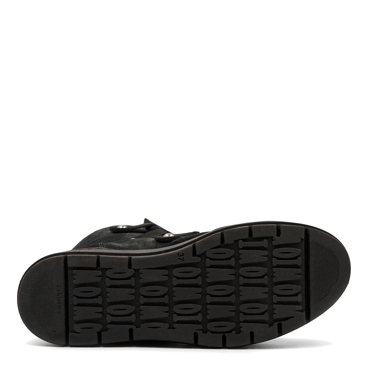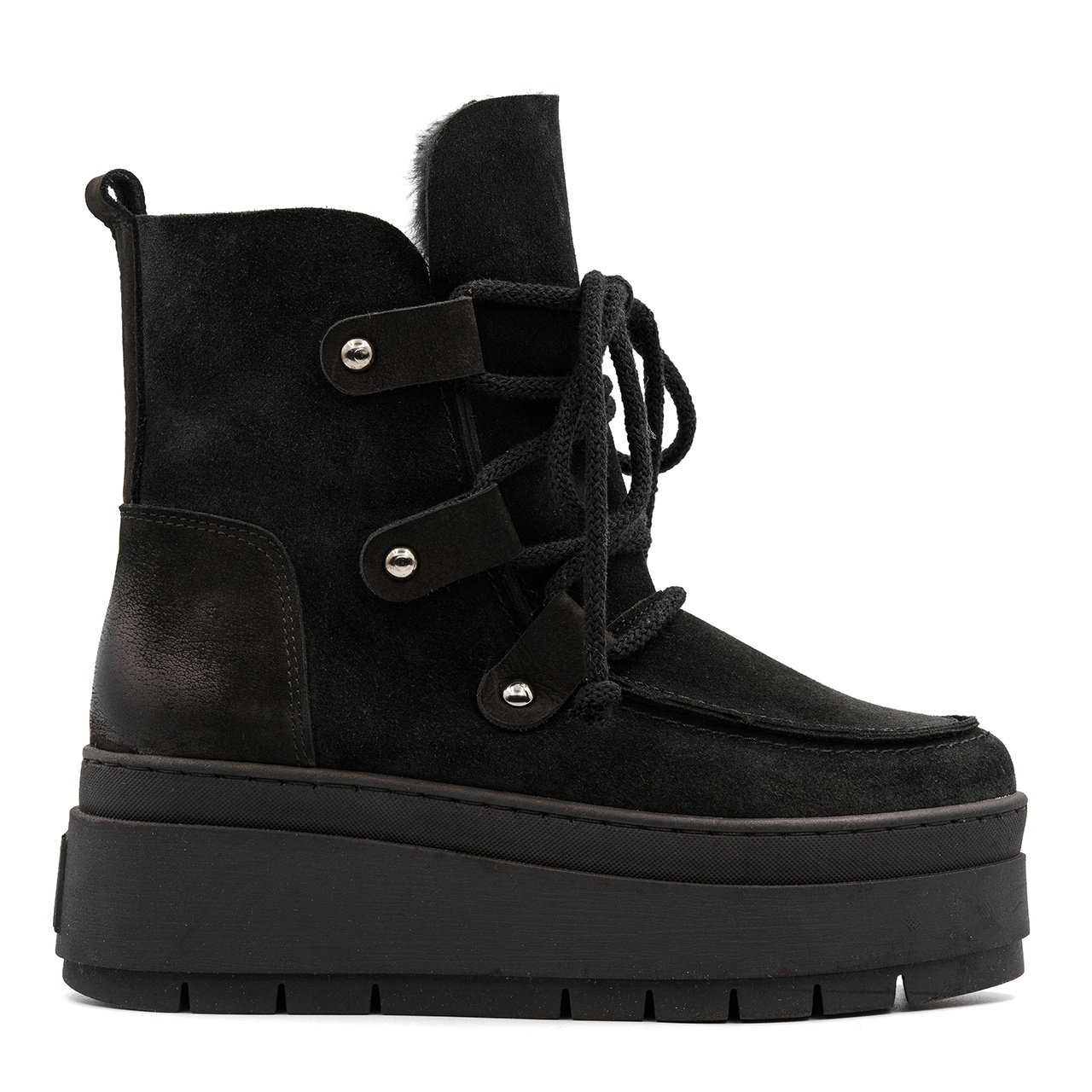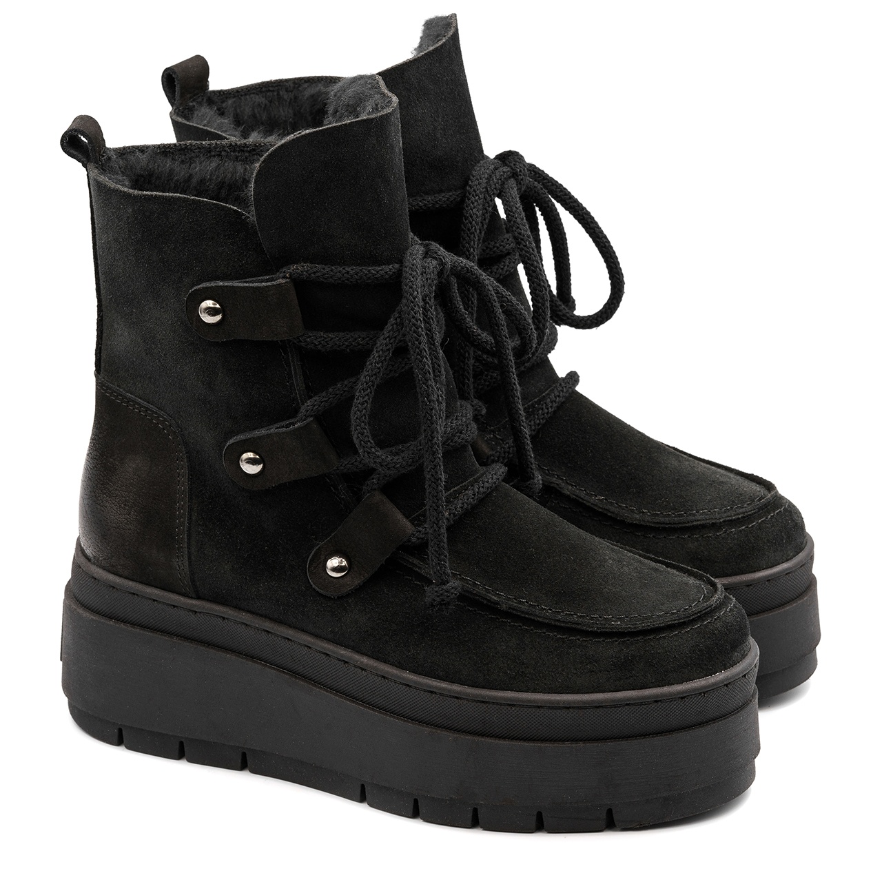 Czarne sznurowane botki sohimmo na grubej platformie. Buty wyprodukowano z połączenia skóry welurowej i nubukowej. Wysokość podeszwy z przodu buta wynosi około 5 cm, z tyłu około 6,5 cm. Buty ocieplono sztucznym futerkiem. Wkładkę wykonano z filcu. Język został przyszyty do cholewki. Szerokość cholewki na górze około 29 cm, a jej wysokość mierzona od podeszwy wynosi około 16,5 cm. Wymiary podawane na kartach produktów to wymiary orientacyjne i odnoszą się do rozmiaru 37. Rozmiarówka w tym modelu jest zawyżona zalecamy wybór mniejszego rozmiaru.