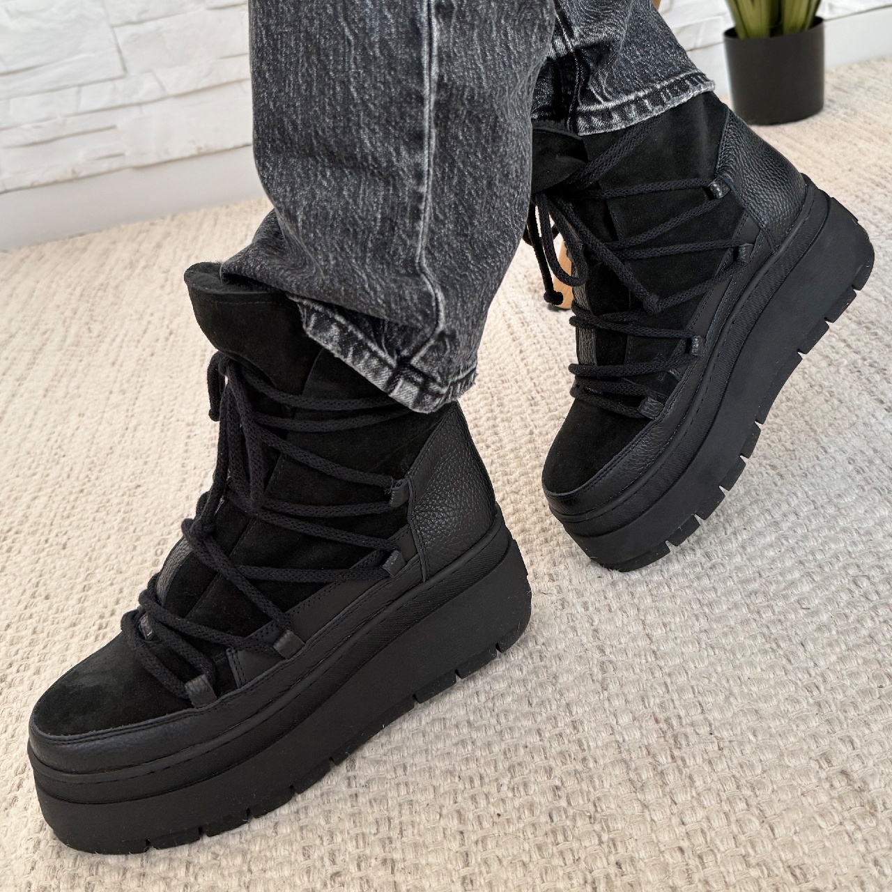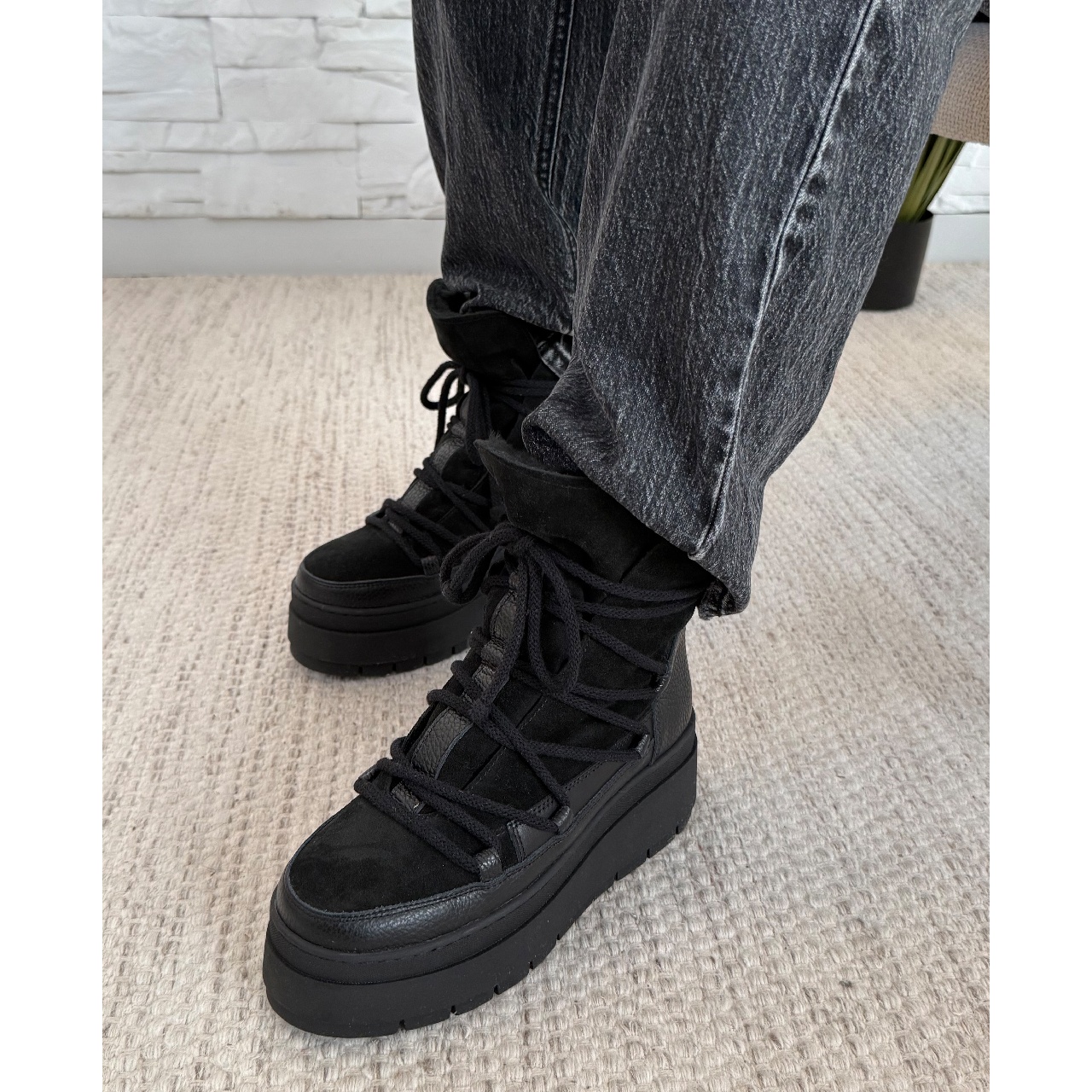 Czarne sznurowane botki sohimmo na grubej platformie. Buty wyprodukowano z połączenia skóry licowej z widocznym uziarnieniem i skóry welurowej. Wysokość podeszwy z przodu buta wynosi około 5 cm, z tyłu około 6,5 cm. Buty ocieplono sztucznym futerkiem. Wkładkę wykonano z filcu. Szerokość cholewki na górze około 24 cm, a jej wysokość mierzona od podeszwy wynosi około 16,5 cm. Wymiary podawane na kartach produktów to wymiary orientacyjne i odnoszą się do rozmiaru 37. Rozmiarówka w tym modelu jest zawyżona zalecamy wybór mniejszego rozmiaru.