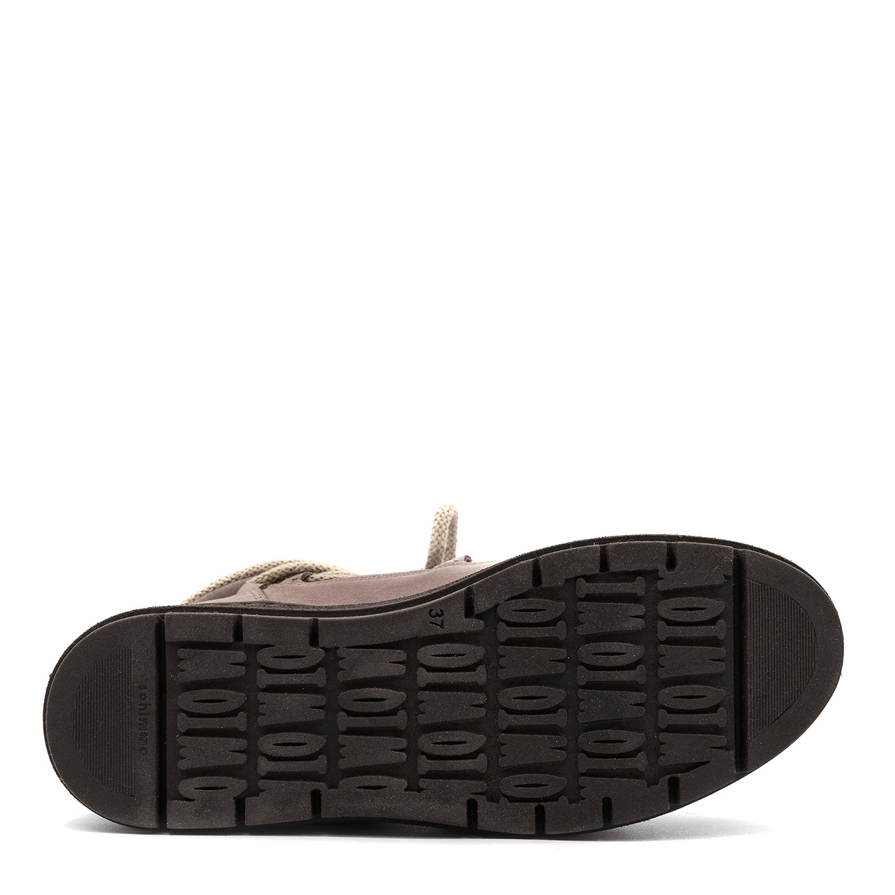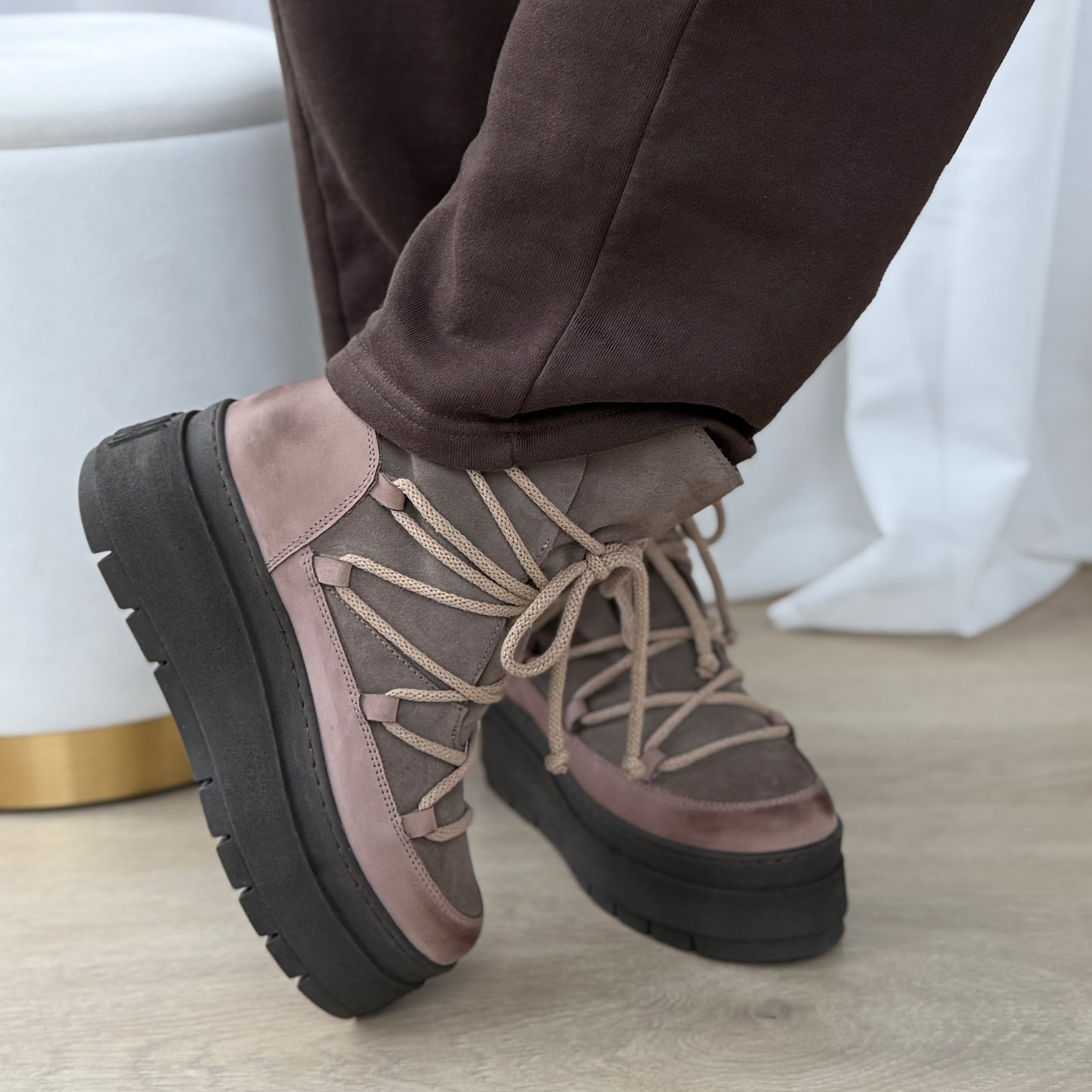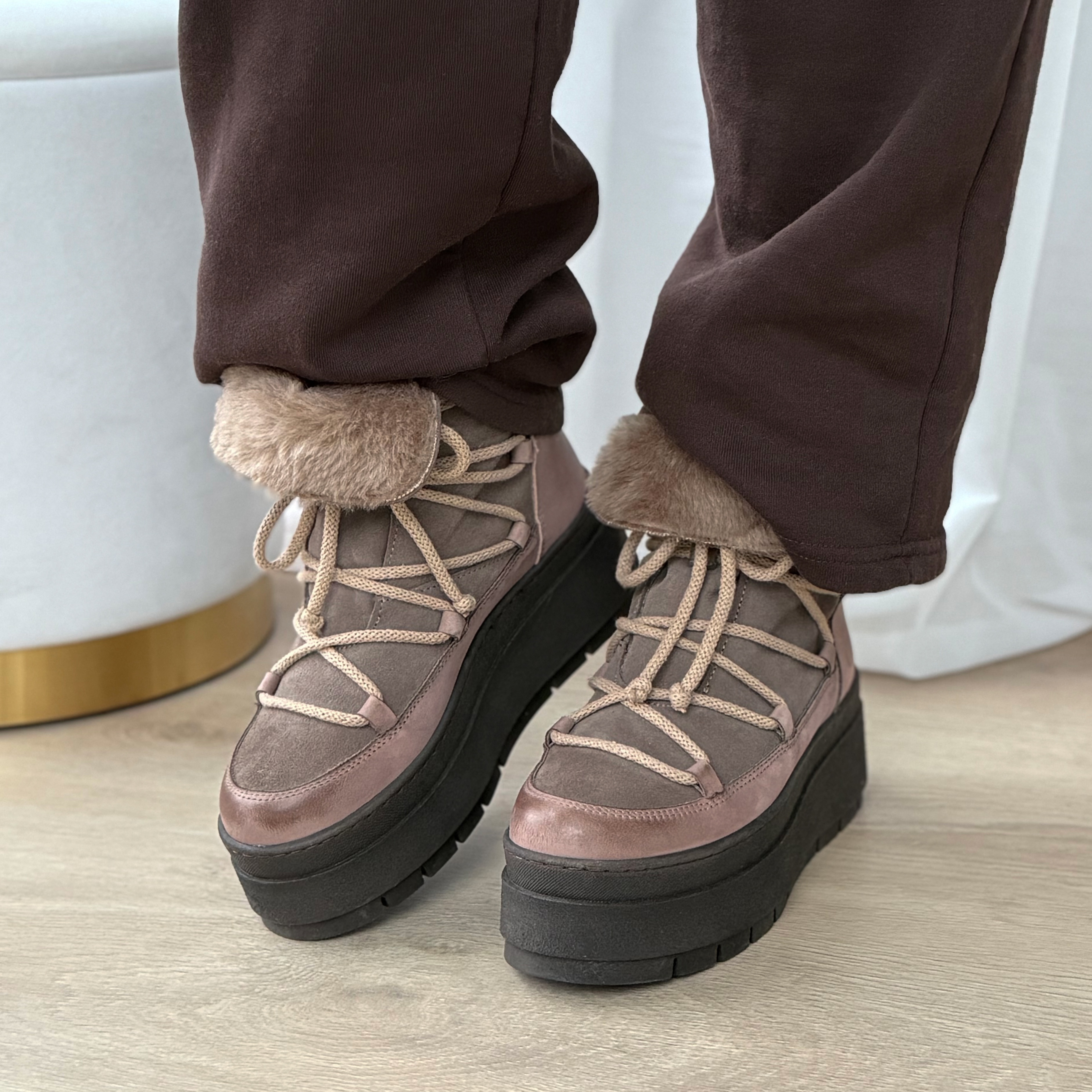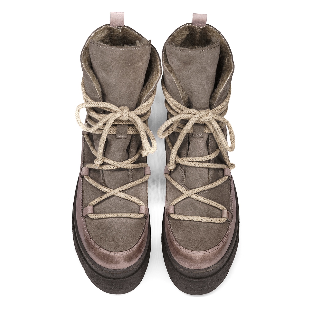Kawowe sznurowane botki sohimmo na grubej platformie. Buty wyprodukowano z połączenia skóry welurowej i nubukowej z lekko przyciemnionymi noskami i piętą. Wysokość podeszwy z przodu buta wynosi około 5 cm, z tyłu około 6,5 cm. Buty ocieplono sztucznym futerkiem. Wkładkę wykonano z filcu. Szerokość cholewki na górze około 24 cm, a jej wysokość mierzona od podeszwy wynosi około 15 cm. Wymiary podawane na kartach produktów to wymiary orientacyjne i odnoszą się do rozmiaru 37. Rozmiarówka w tym modelu jest zawyżona zalecamy wybór mniejszego rozmiaru.
