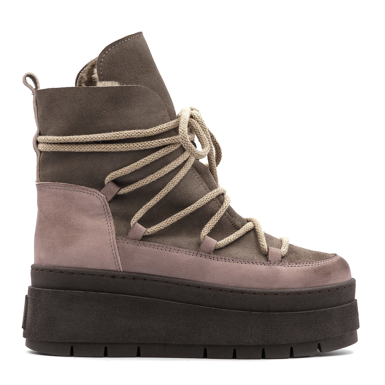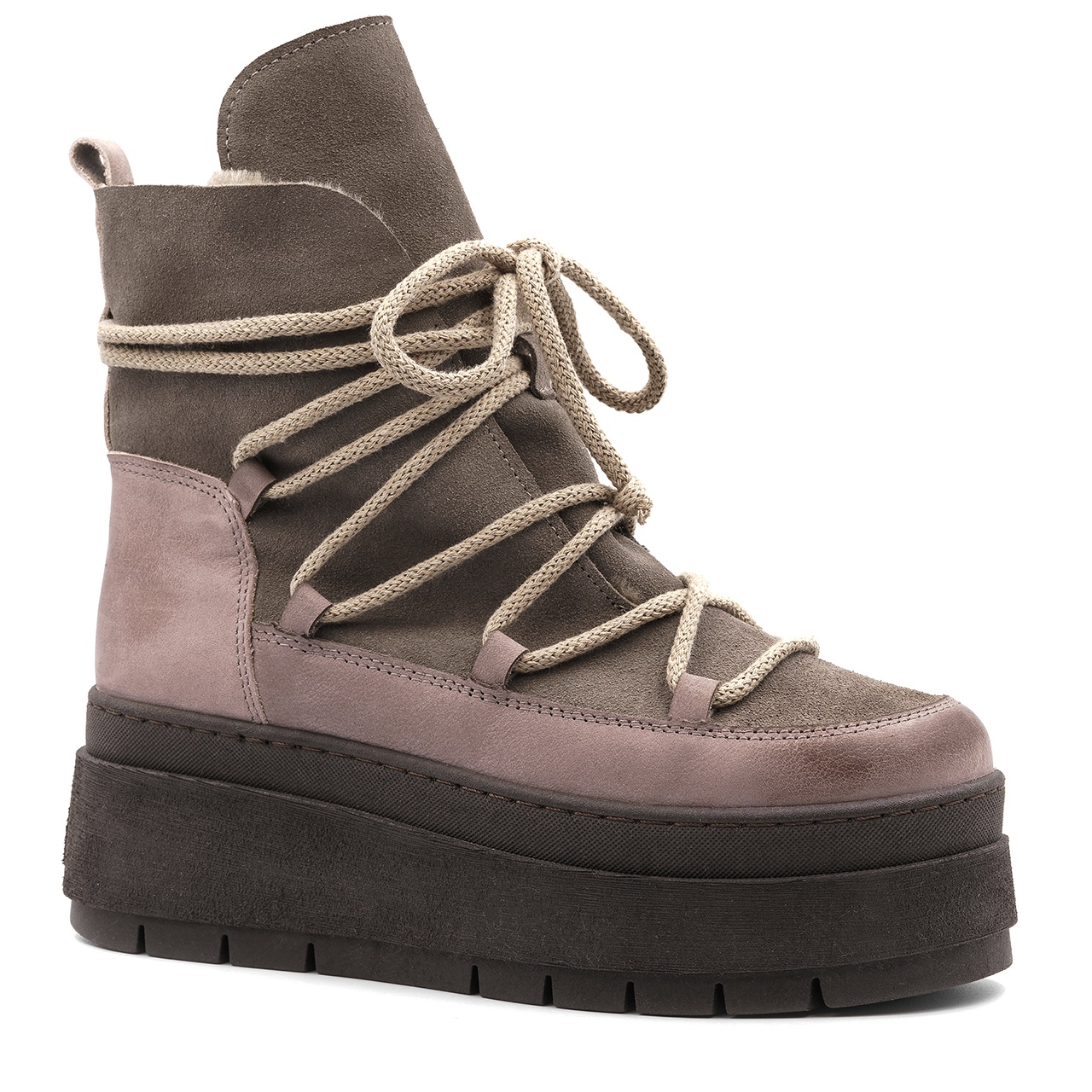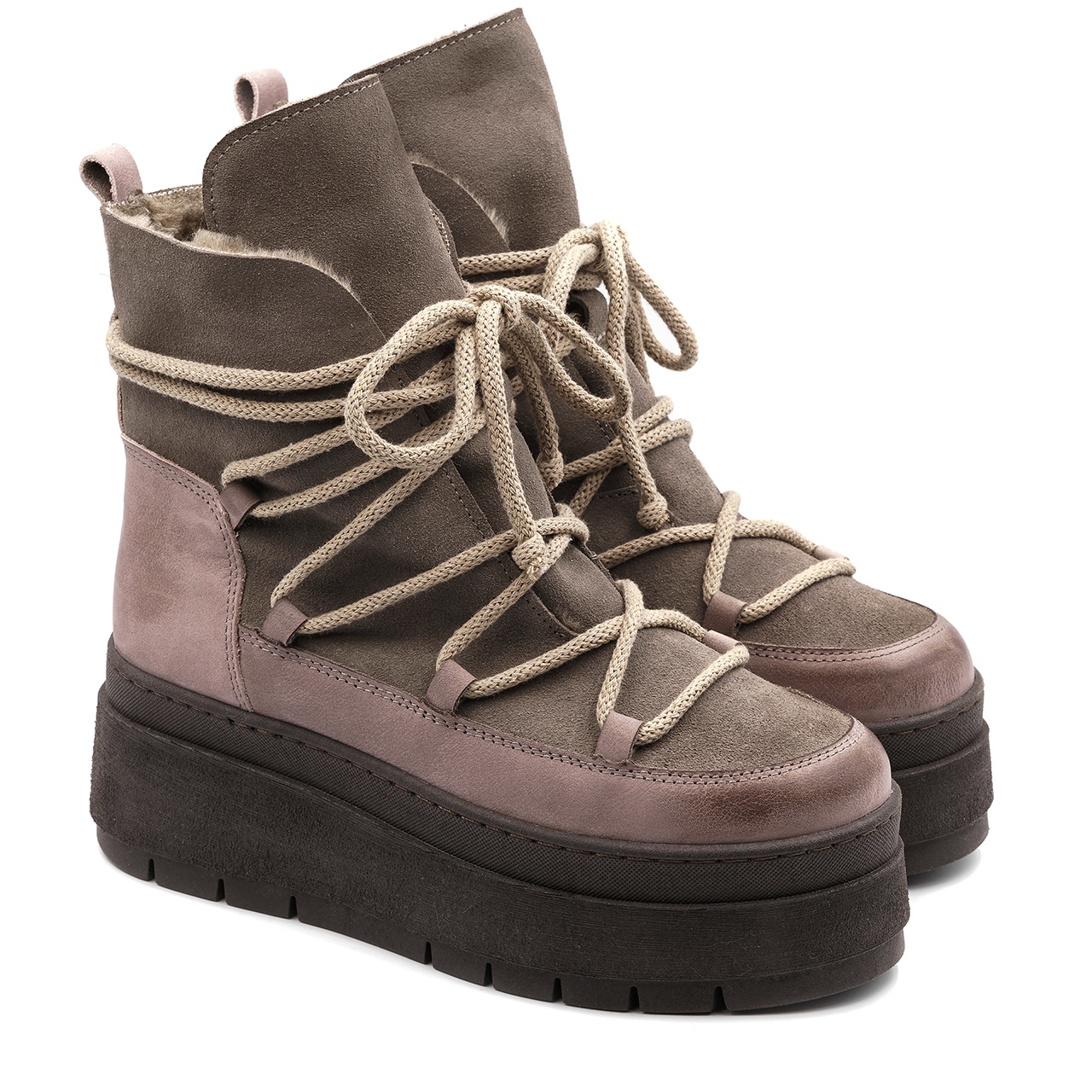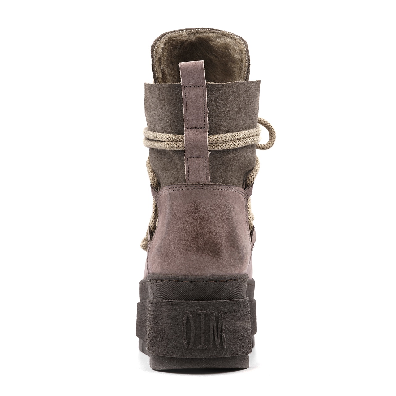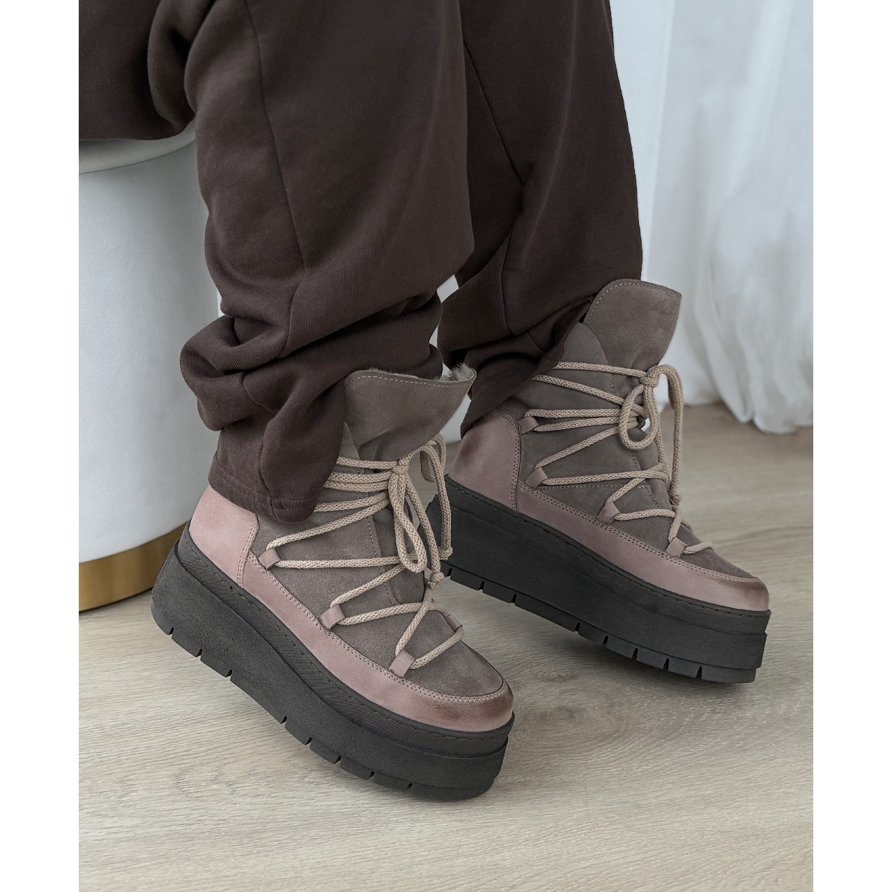 Kawowe sznurowane botki sohimmo na grubej platformie. Buty wyprodukowano z połączenia skóry welurowej i nubukowej z lekko przyciemnionymi noskami i piętą. Wysokość podeszwy z przodu buta wynosi około 5 cm, z tyłu około 6,5 cm. Buty ocieplono sztucznym futerkiem. Wkładkę wykonano z filcu. Szerokość cholewki na górze około 24 cm, a jej wysokość mierzona od podeszwy wynosi około 15 cm. Wymiary podawane na kartach produktów to wymiary orientacyjne i odnoszą się do rozmiaru 37. Rozmiarówka w tym modelu jest zawyżona zalecamy wybór mniejszego rozmiaru.