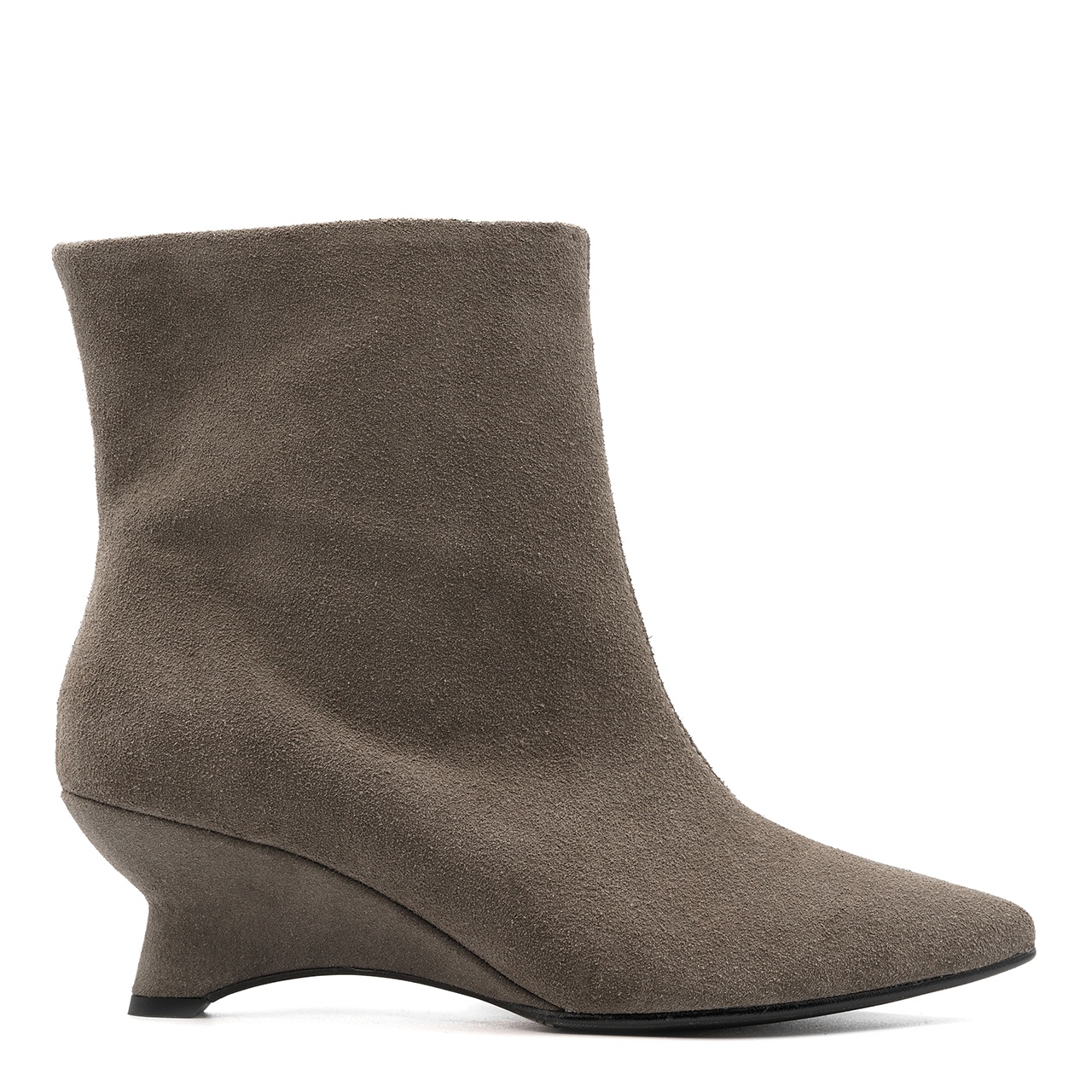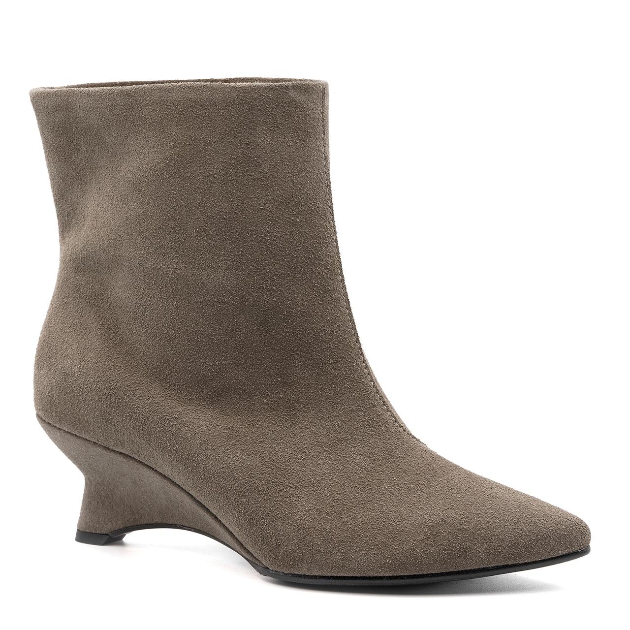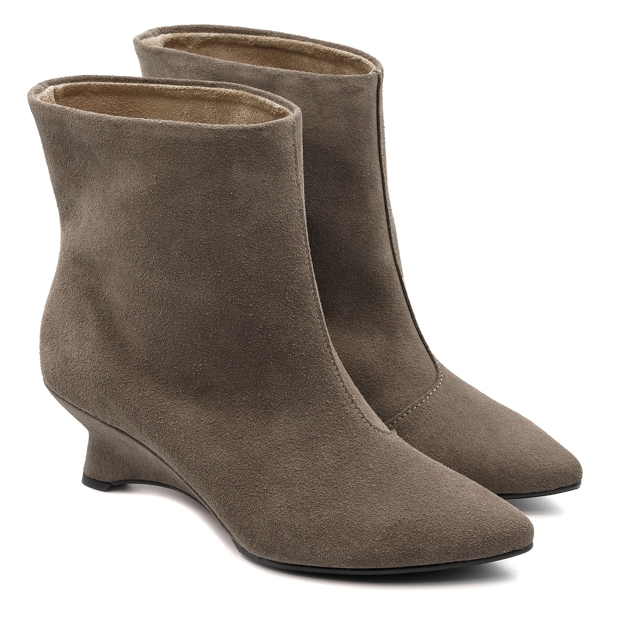 Kawowe welurowe botki z szeroką cholewką na niskim koturnie - obcasie. Obuwie wykonano ze skóry naturalnej welurowej. Charakterystyczny obcas dodaje elegancji. Botki to idealny wybór w każdej porze roku. Obcas w botkach wynosi około 6 cm. Noski butów w szpic. Obwód cholewki wynosi około 29 cm, a jej wysokość mierzona od obcasa wynosi około 14 cm. Podszewka wykonana z materiału, a wkładka ze skóry naturalnej. Wymiary podawane na kartach produktów to wymiary orientacyjne i odnoszą się do rozmiaru 37.