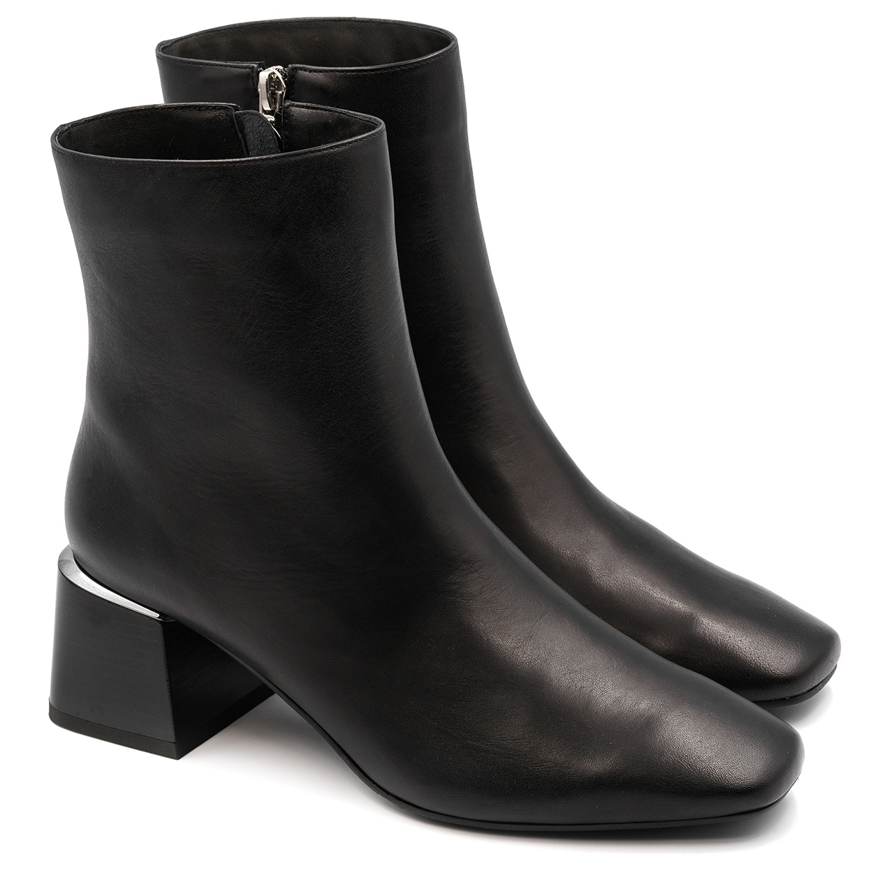 Czarne botki na ozdobnym obcasie z lamówką w kolorze niklu. Buty wyprodukowano z naturalnej skóry licowej. Wkładkę wykonano ze skóry naturalnej, podszewka z filcu. Buty posiadają zamek. Szerokość cholewki na górze 25 cm, a jej wysokość mierzona od obcasa wynosi około 14 cm. Wymiary podawane na kartach produktów to wymiary orientacyjne i odnoszą się do rozmiaru 37.