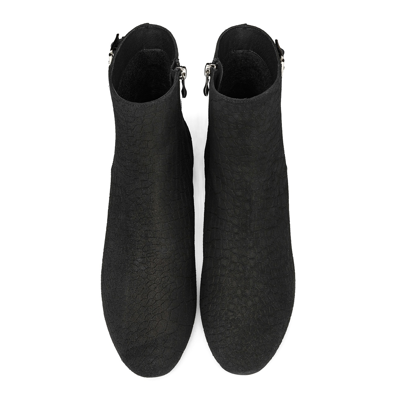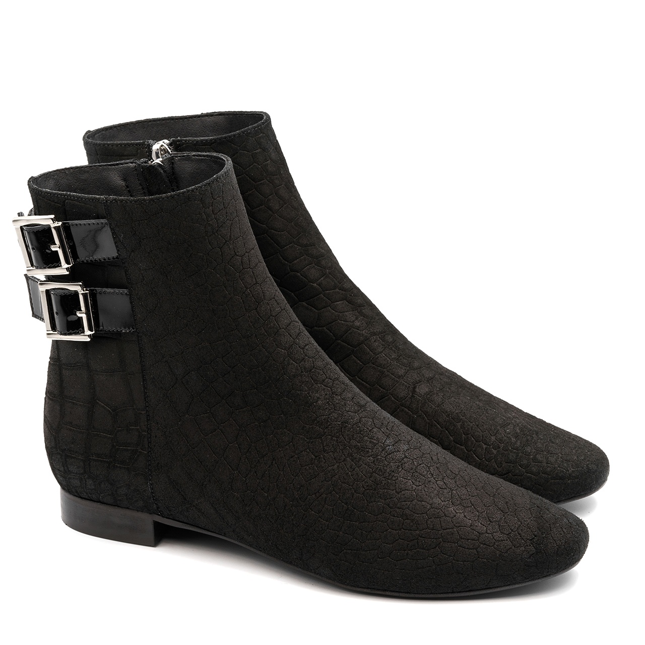 Czarne zamszowe botki z klamrami. Buty wyprodukowano z naturalnej skóry zamszowej z tłoczeniem w krokodyli wzór i z połączeniem skóry lakierowanej. Wkładkę wykonano ze skóry naturalnej, podszewka z filcu. Buty posiadają zamek. Orientacyjne wymiary dla rozmiaru 37 to: Szerokość cholewki na górze 24 cm, a jej wysokość mierzona od obcasa wynosi około 15 cm. Wymiary podawane na kartach produktów to wymiary orientacyjne i odnoszą się do rozmiaru 37.