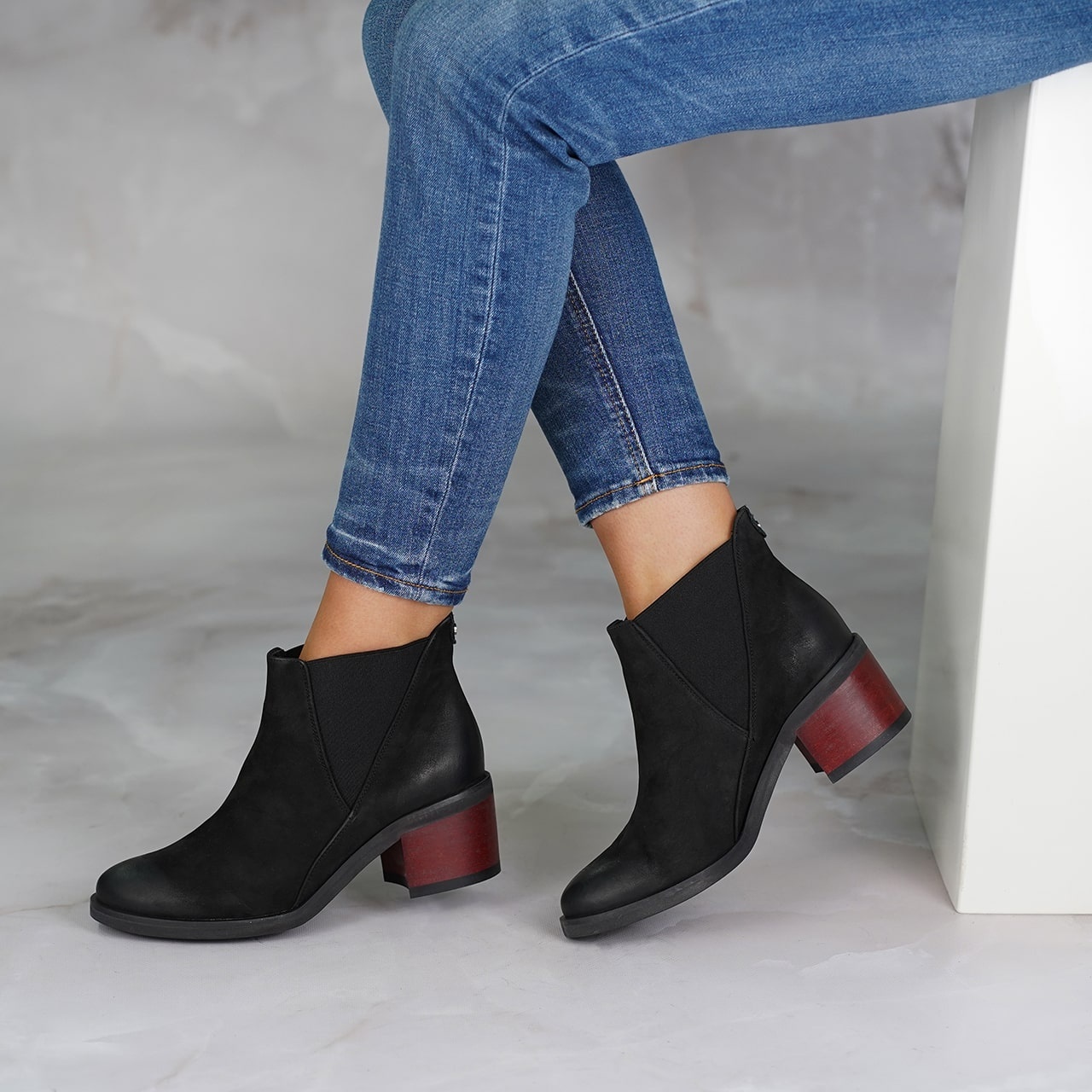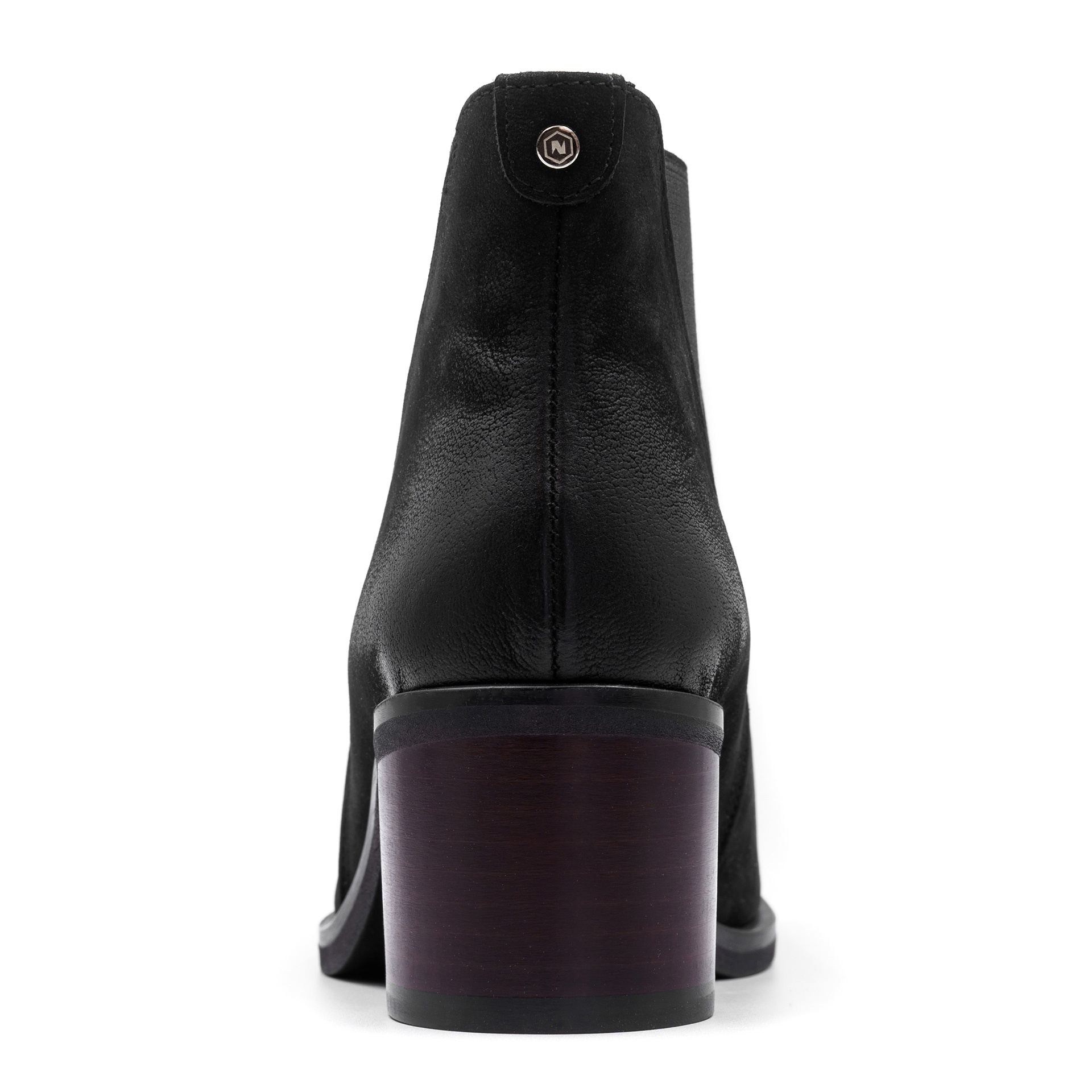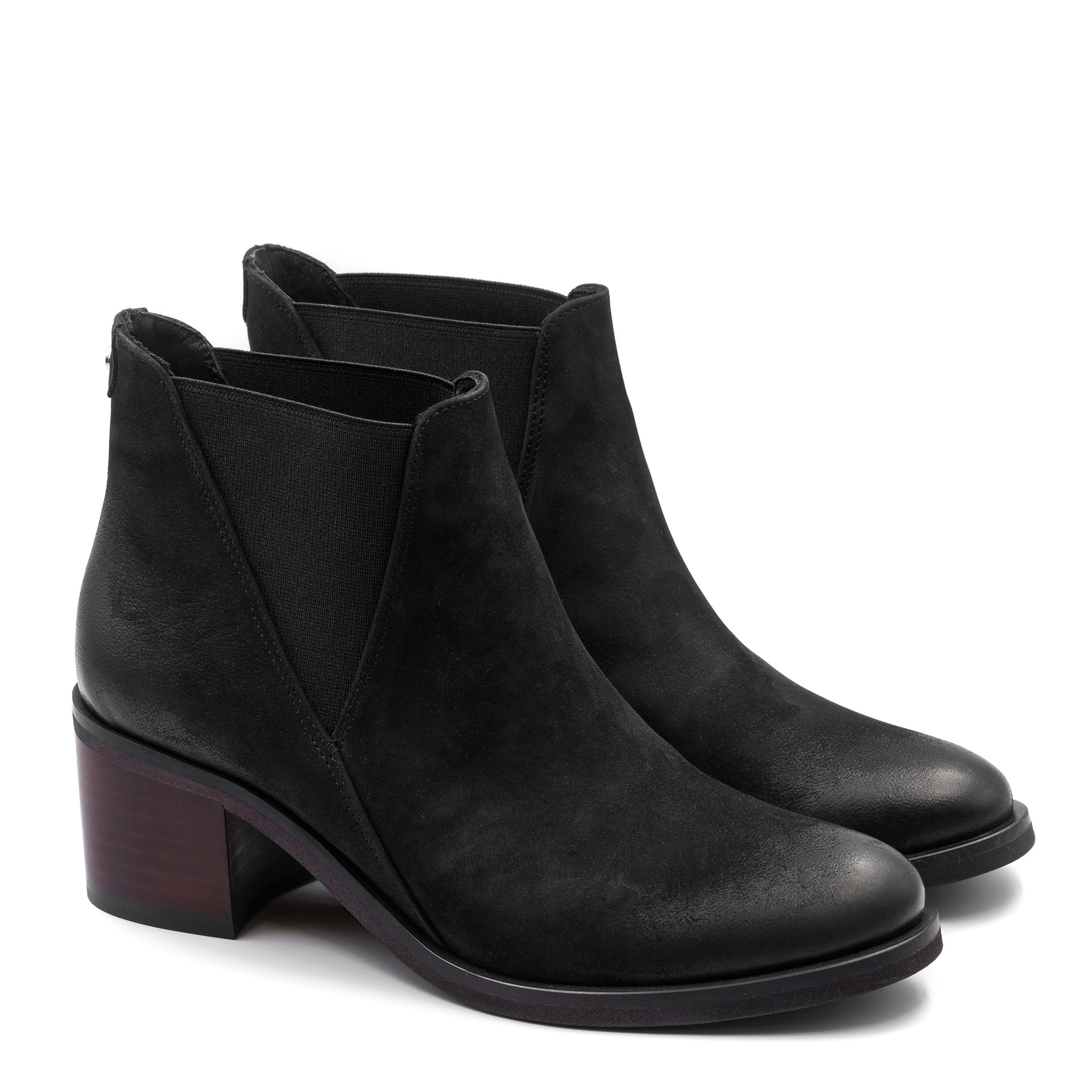 Czarne, sięgające do kostek botki na obcasie o kształcie klocka w kolorze bordowym. Botki wykonane są z naturalnej skóry nubukowej, mają lekko przetarte noski i piętę. Noski butów okrągłe. W skórzanej cholewce wszyte są gumy ułatwiające wkładanie butów. Szerokość cholewki na górze około 24 cm po rozciągnięciu około 31 cm, a jej wysokość mierzona od obcasa wynosi około 11 cm. Obcas wynosi około 5 cm, a podeszwa 1 cm. Wkładka wykonana jest z filcu, a podszewka z materiału. Wymiary podawane na kartach produktów to wymiary orientacyjne i odnoszą się do rozmiaru 37.