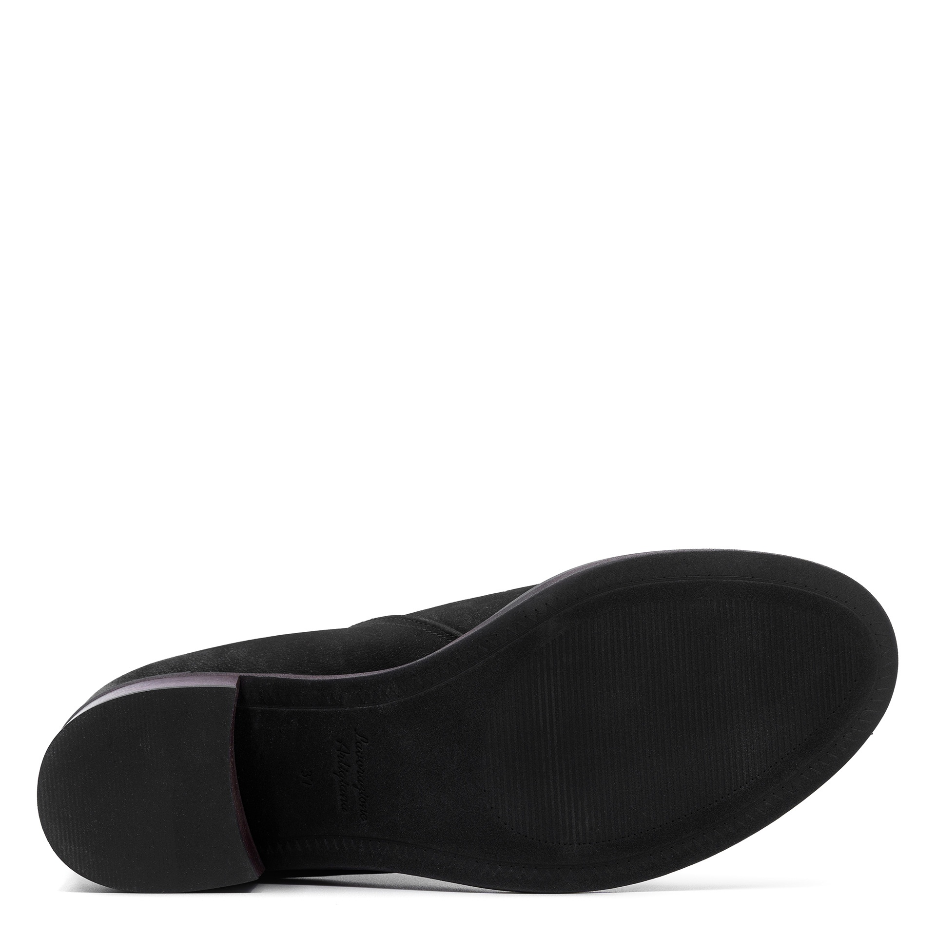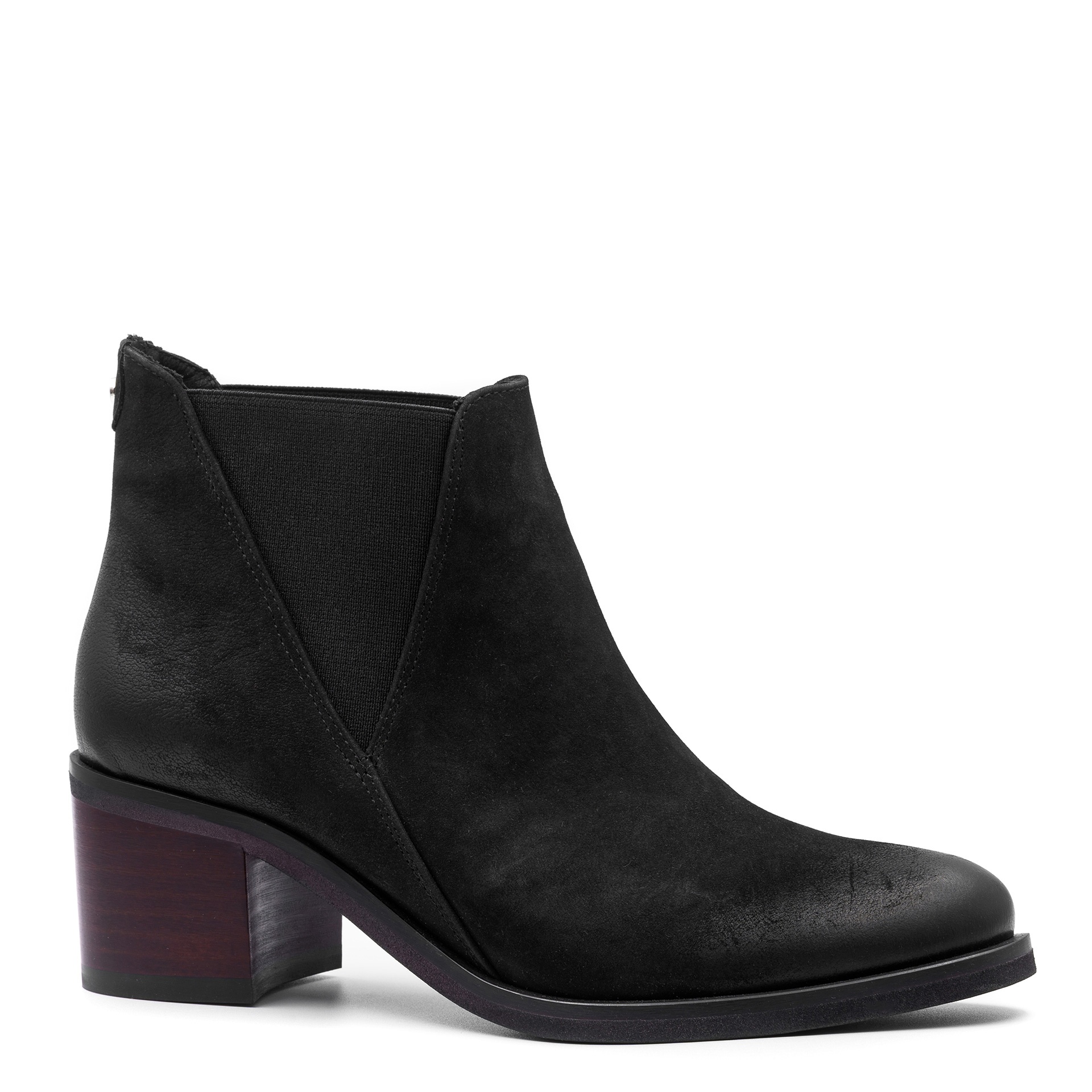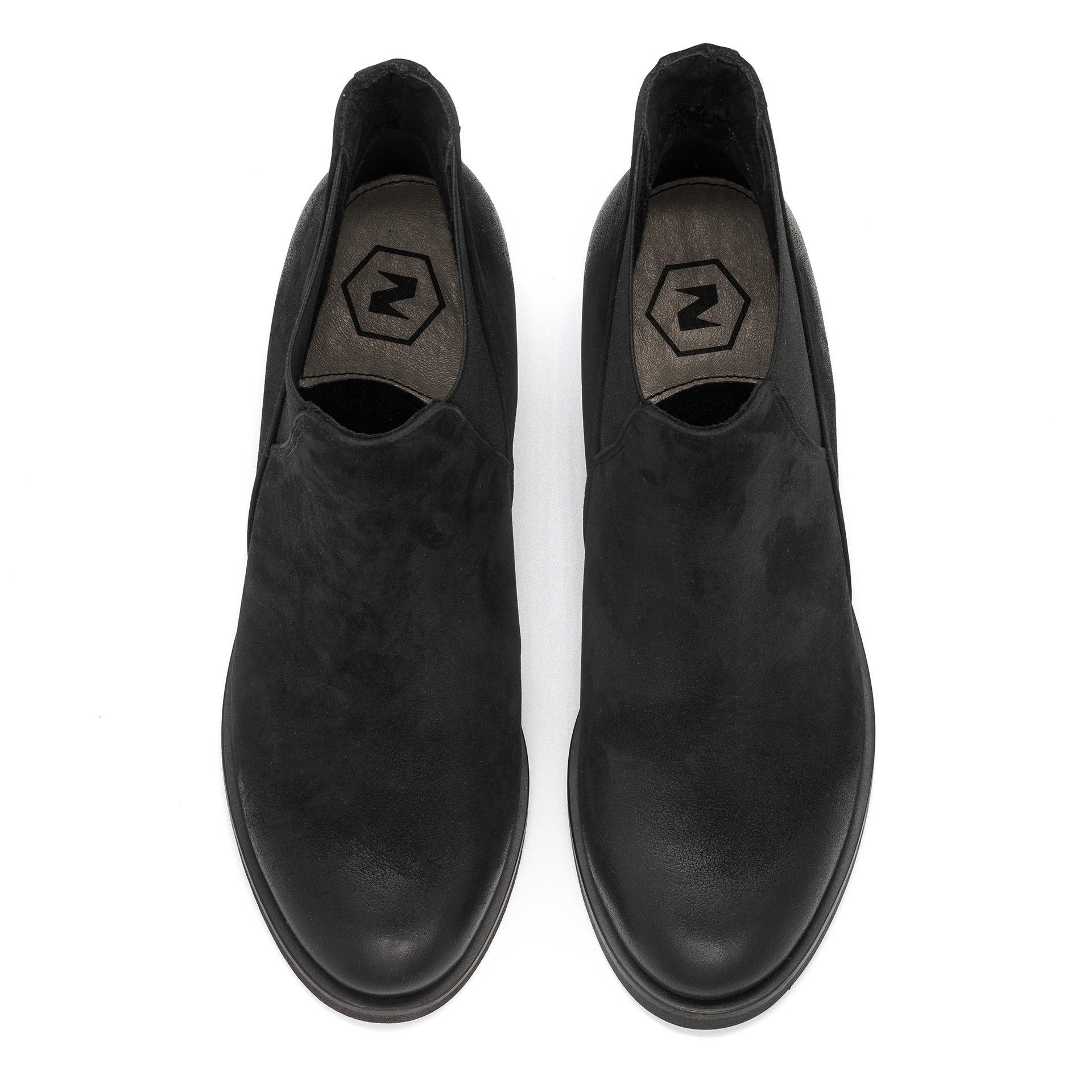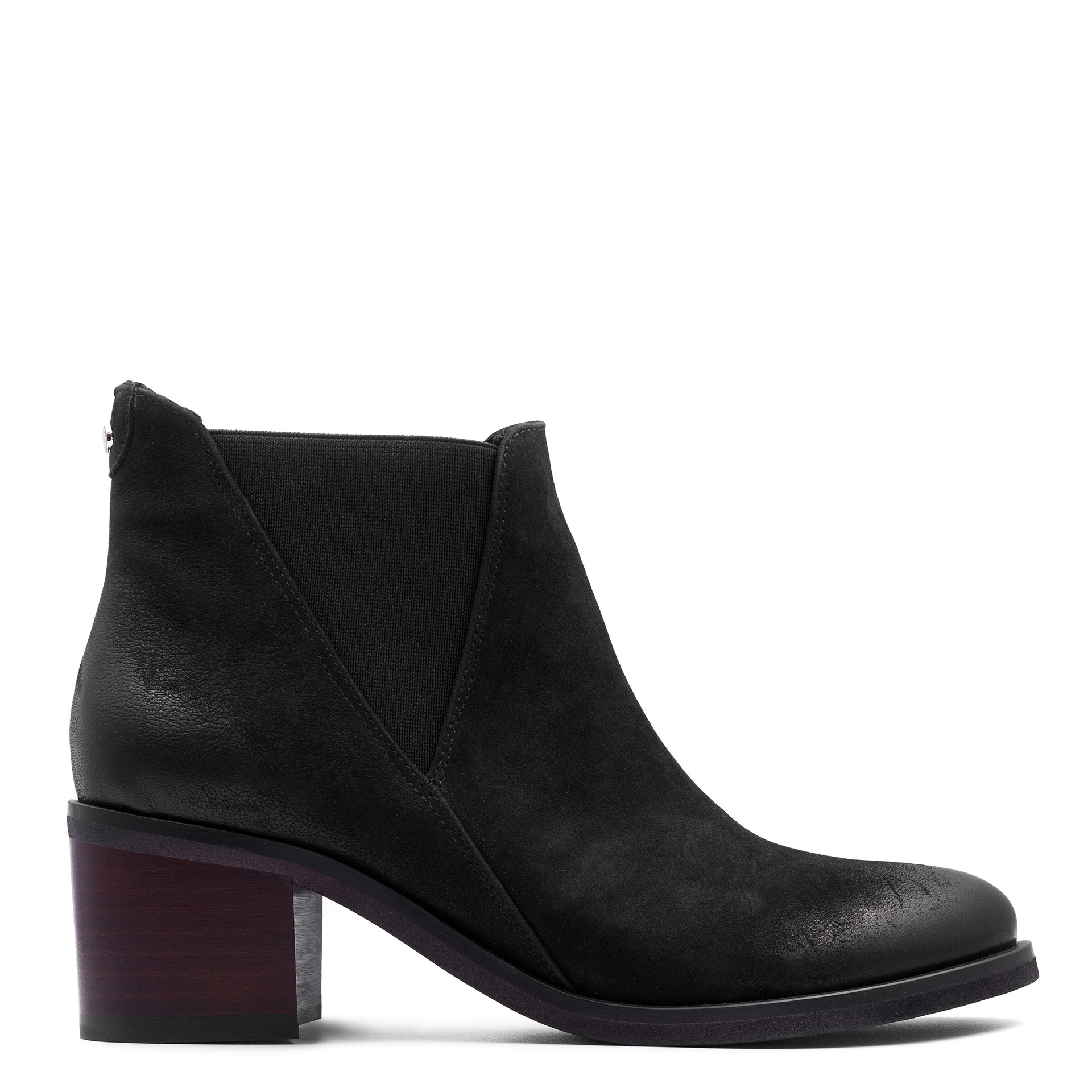 Czarne, sięgające do kostek botki na obcasie o kształcie klocka w kolorze bordowym. Botki wykonane są z naturalnej skóry nubukowej, mają lekko przetarte noski i piętę. Noski butów okrągłe. W skórzanej cholewce wszyte są gumy ułatwiające wkładanie butów. Szerokość cholewki na górze około 24 cm po rozciągnięciu około 31 cm, a jej wysokość mierzona od obcasa wynosi około 11 cm. Obcas wynosi około 5 cm, a podeszwa 1 cm. Wkładka wykonana jest z filcu, a podszewka z materiału. Wymiary podawane na kartach produktów to wymiary orientacyjne i odnoszą się do rozmiaru 37.