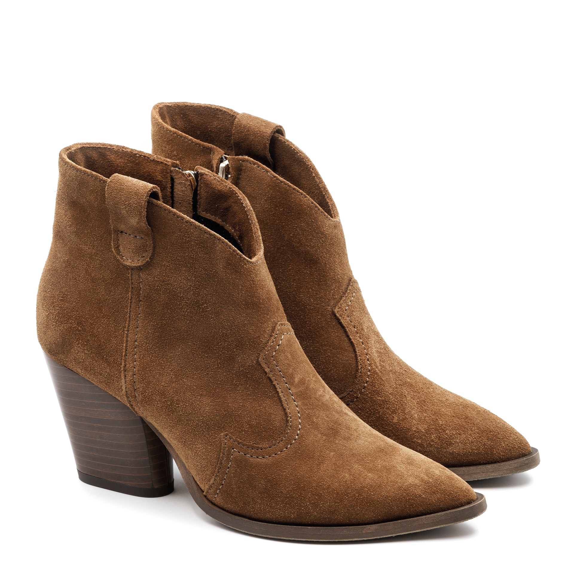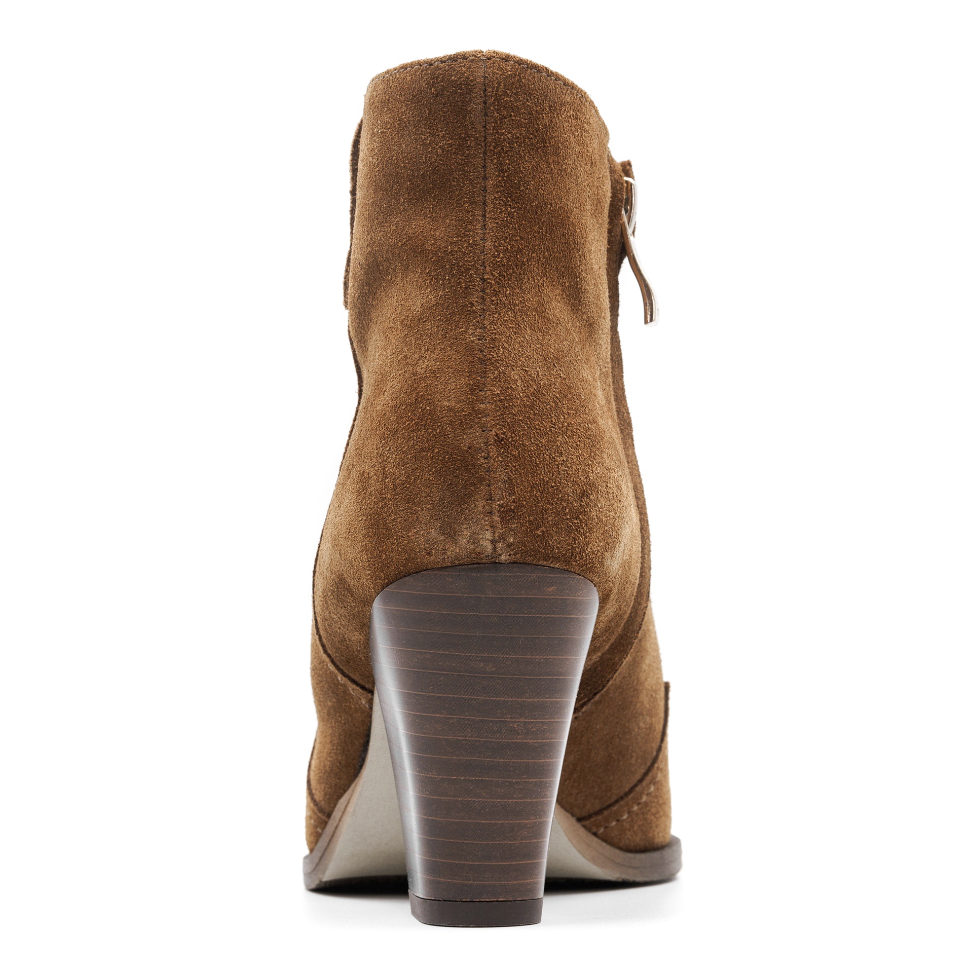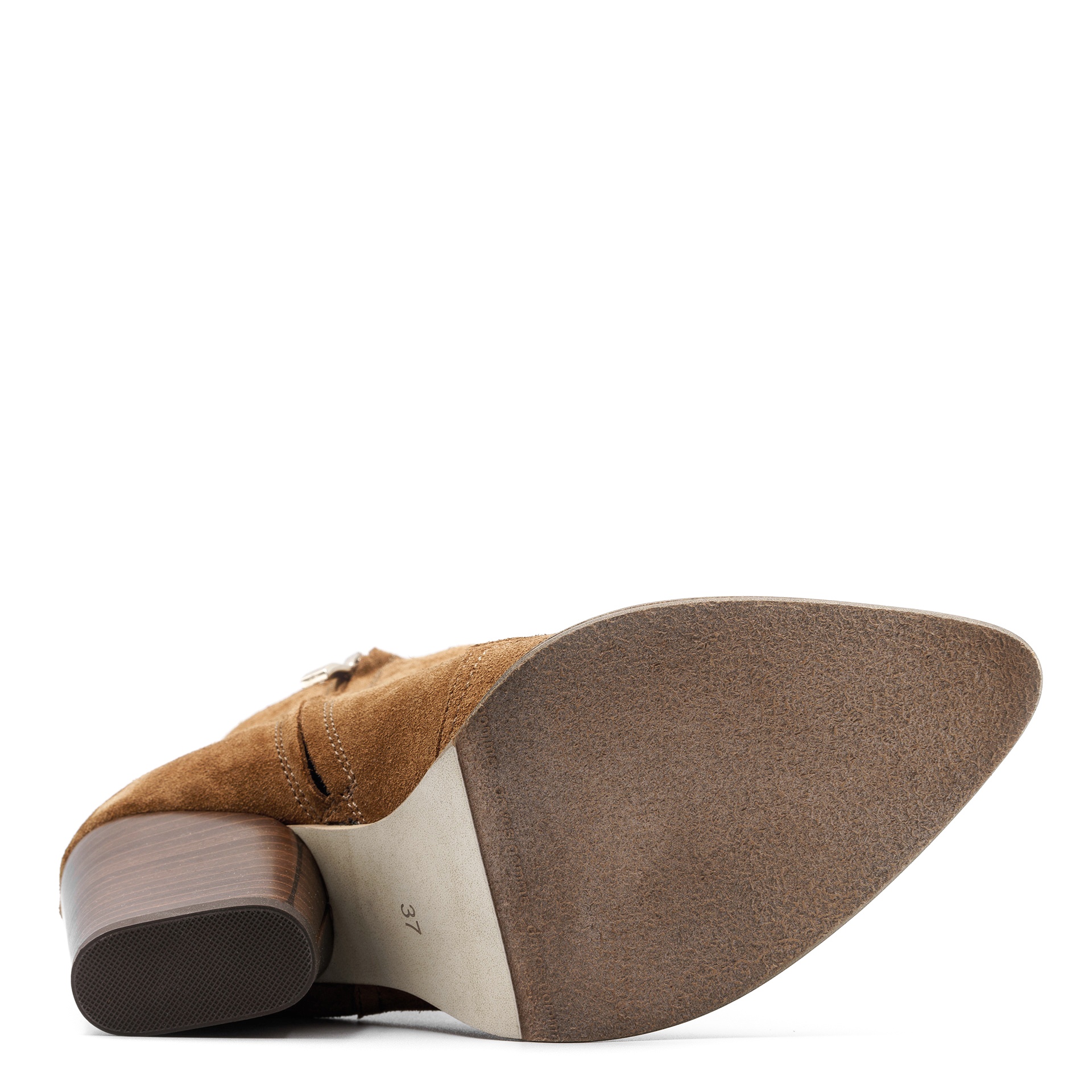 Koniakowe botki w stylu county sięgające do kostek. Obuwie wykonane jest ze skóry welurowej. Skośny obcas w butach wynosi 7,5 cm. Botki mają noski w szpic. Od wewnętrznej strony cholewki wszyto suwak. Wkładkę i podszewkę wykonano z filcu. Szerokość cholewki na górze około 24 cm, a jej wysokość mierzona od obcasa wynosi około 10 cm. Wymiary podawane na kartach produktów to wymiary orientacyjne i odnoszą się do rozmiaru 37.