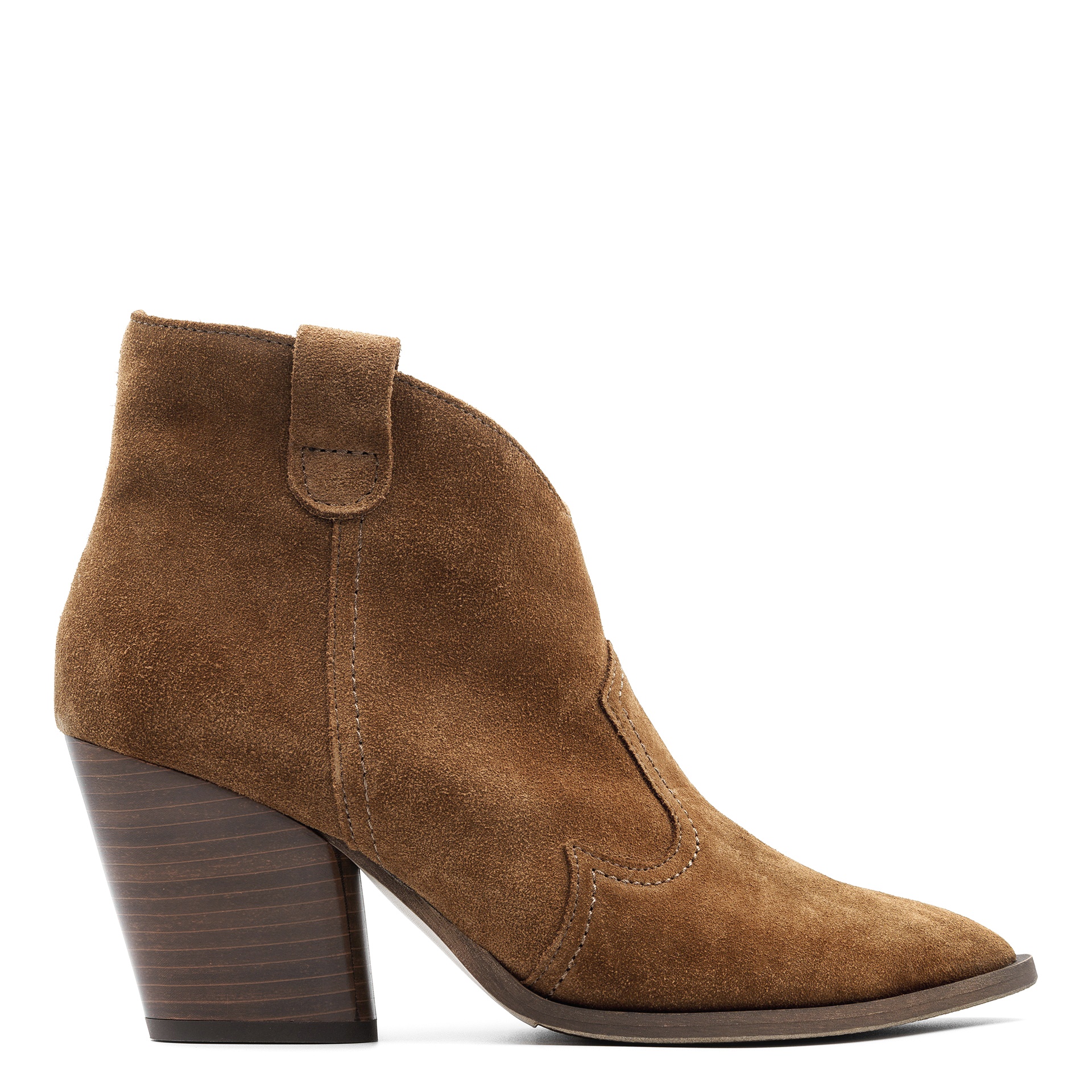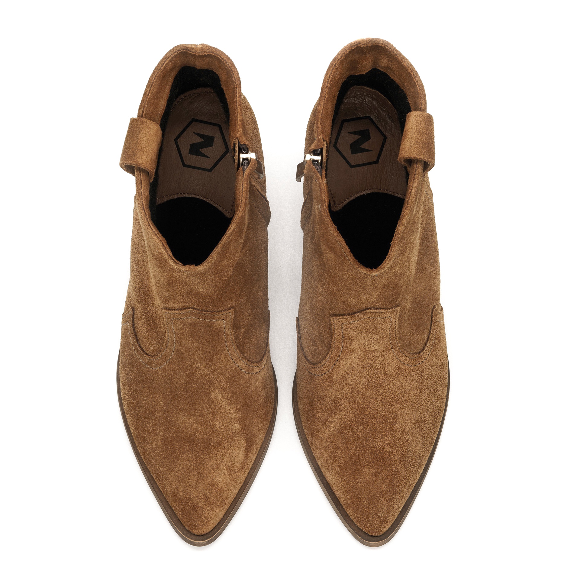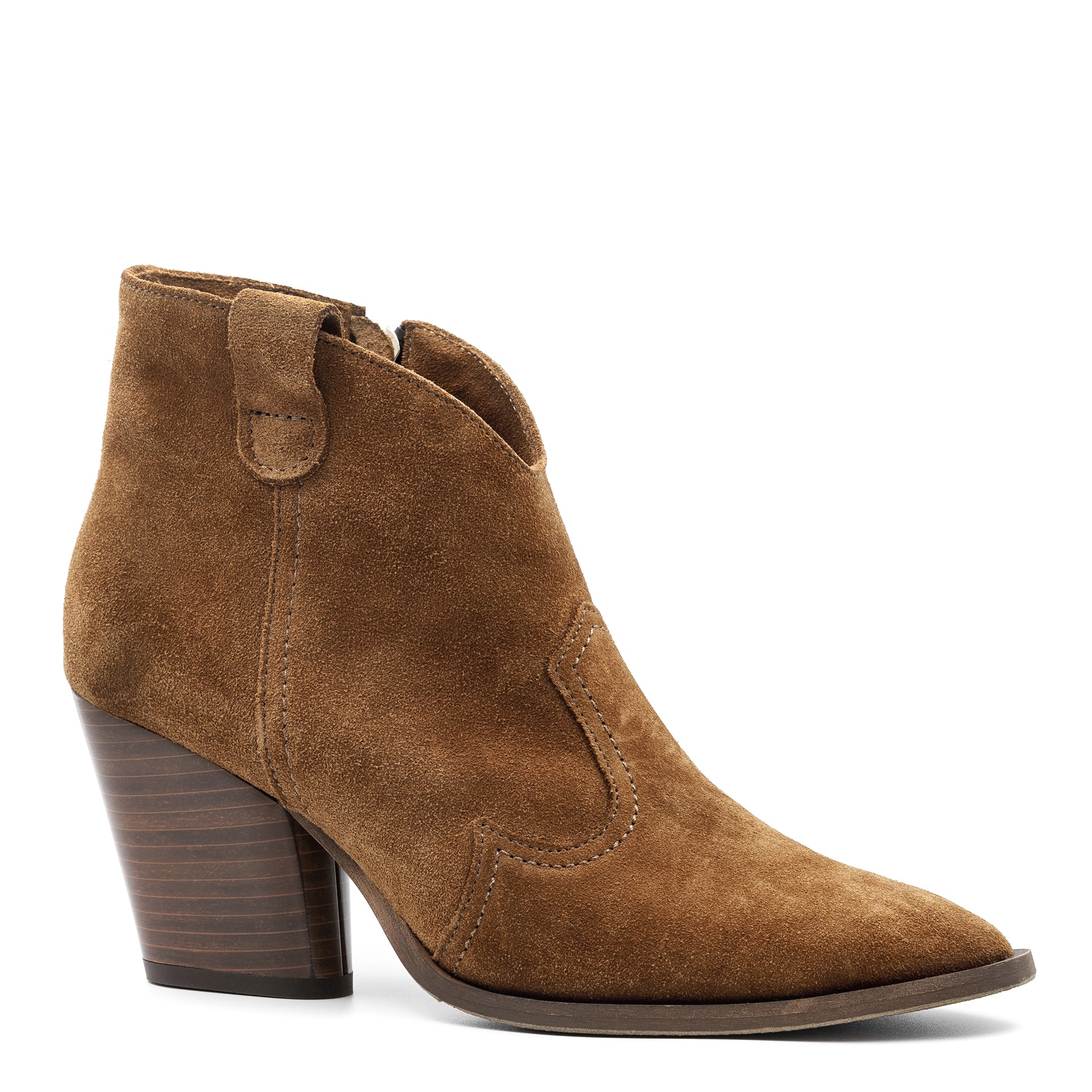 Koniakowe botki w stylu county sięgające do kostek. Obuwie wykonane jest ze skóry welurowej. Skośny obcas w butach wynosi 7,5 cm. Botki mają noski w szpic. Od wewnętrznej strony cholewki wszyto suwak. Wkładkę i podszewkę wykonano z filcu. Szerokość cholewki na górze około 24 cm, a jej wysokość mierzona od obcasa wynosi około 10 cm. Wymiary podawane na kartach produktów to wymiary orientacyjne i odnoszą się do rozmiaru 37.