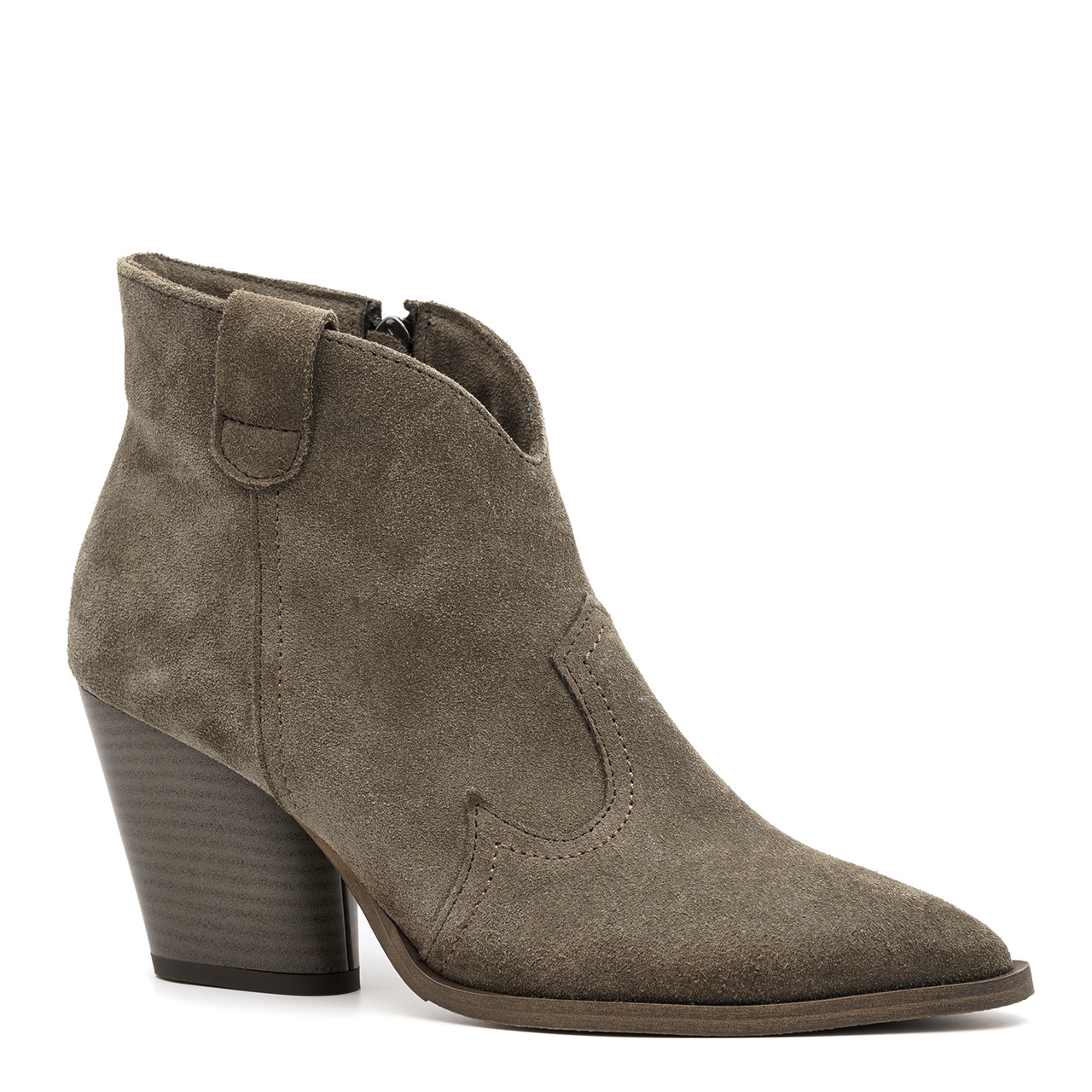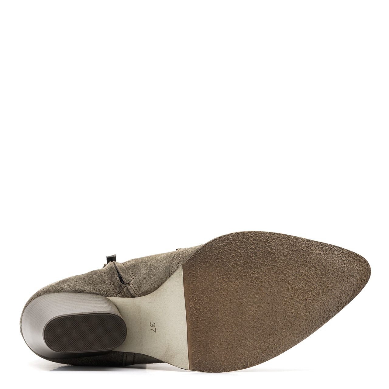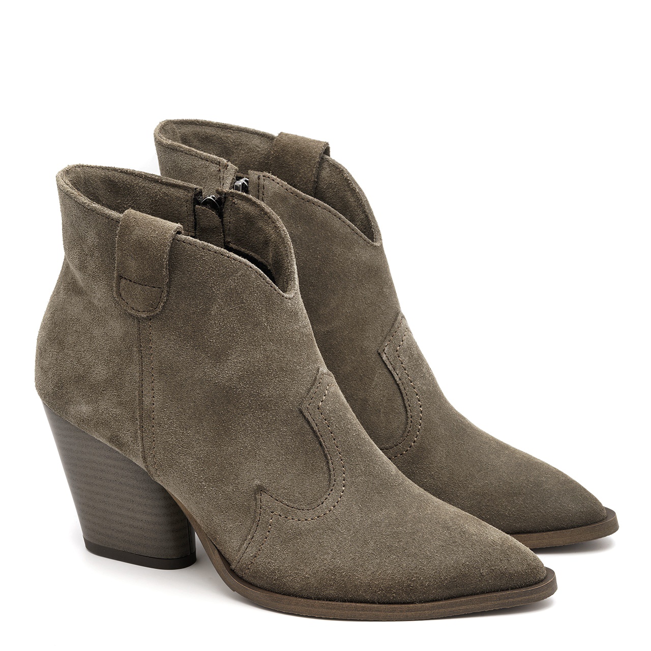 Kawowe botki w stylu county sięgające do kostek. Obuwie wykonane jest ze skóry welurowej. Skośny obcas w butach wynosi 7,5 cm. Botki mają noski w szpic. Od wewnętrznej strony cholewki wszyto suwak. Wkładkę i podszewkę wykonano z filcu. Szerokość cholewki na górze około 24 cm, a jej wysokość mierzona od obcasa wynosi około 10 cm. Wymiary podawane na kartach produktów to wymiary orientacyjne i odnoszą się do rozmiaru 37.