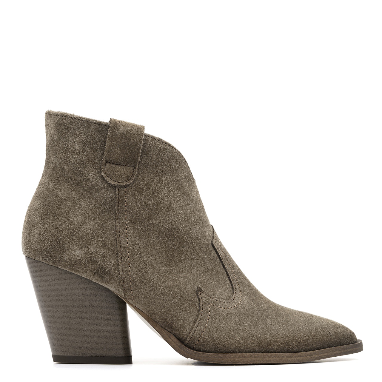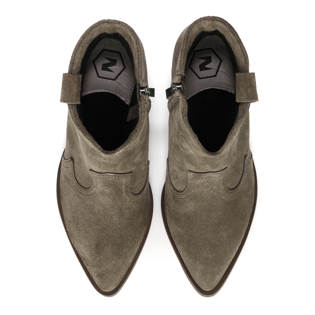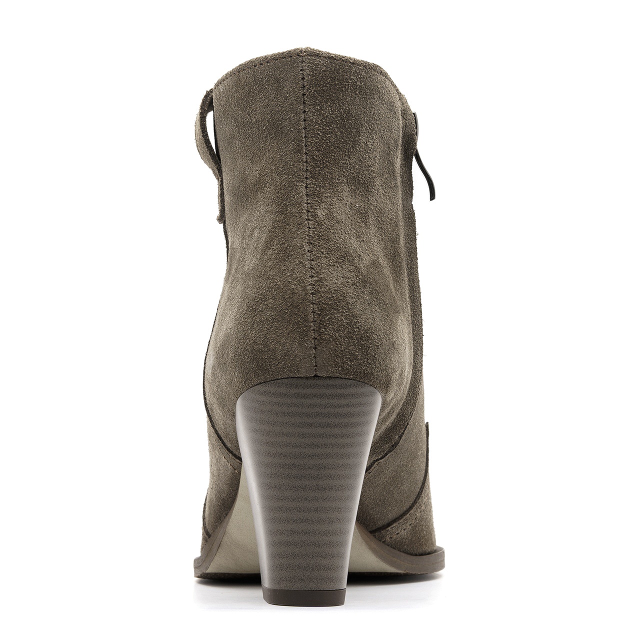 Kawowe botki w stylu county sięgające do kostek. Obuwie wykonane jest ze skóry welurowej. Skośny obcas w butach wynosi 7,5 cm. Botki mają noski w szpic. Od wewnętrznej strony cholewki wszyto suwak. Wkładkę i podszewkę wykonano z filcu. Szerokość cholewki na górze około 24 cm, a jej wysokość mierzona od obcasa wynosi około 10 cm. Wymiary podawane na kartach produktów to wymiary orientacyjne i odnoszą się do rozmiaru 37.