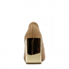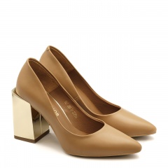 Karmelowe czółenka wykonane z naturalnej skóry licowej na unikalnym, kwadratowym, lustrzanym w kolorze złotym obcasie, który wynosi 9 cm. Nosek butów w szpic. Wkładka w butach jest skórzana. Wymiary podawane na kartach produktów to wymiary orientacyjne i odnoszą się do rozmiaru 37.