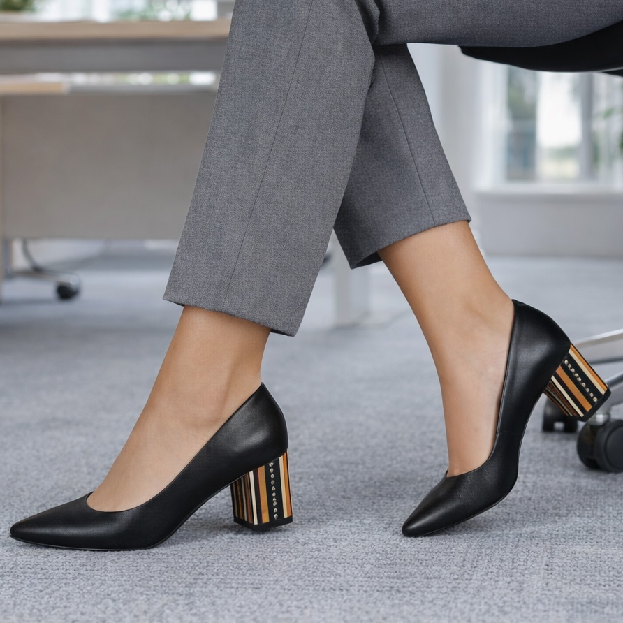 Czarne skórzane czółenka na kolorowym niskim 6 cm obcasie. Obuwie zostało wykonane ze skóry naturalnej. Wkładka w butach jest skórzana. Nosek butów w szpic. Wymiary podawane na kartach produktów to wymiary orientacyjne i odnoszą się do rozmiaru 37.