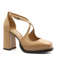 Karmelowe półbuty na wysokim, 10 cm masywnym obcasie i grubej 2 cm platformie. Buty wyprodukowano z naturalnej skóry licowej. Dwa cienkie, zapinane w kostce paski krzyżują się i dodają butom uroku. Noski butów w ścięty lekki kwadrat. Na otoku podeszwy widoczne delikatne przeszycie. Wkładkę wykonano z naturalnej skóry. Wymiary podawane na kartach produktów to wymiary orientacyjne i odnoszą się do rozmiaru 37.