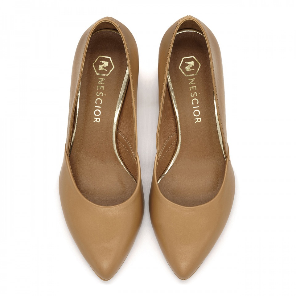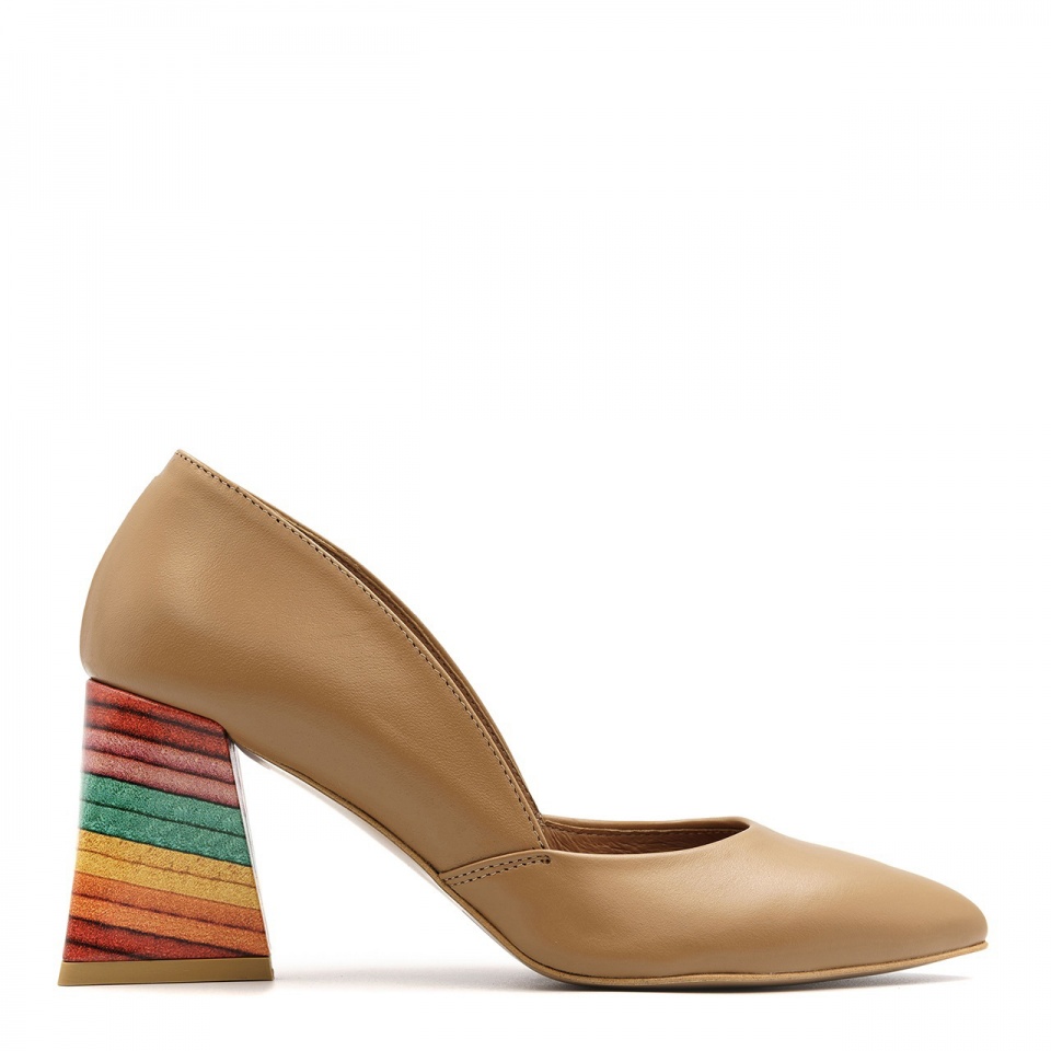 Karmelowe, wygodne czółenka na 7,5 cm trójkątnym kolorowym obcasie i estetycznie wyciętą cholewką po bokach. Buty wyprodukowano ze skóry naturalnej licowej. Przód buta w delikatny szpic. Wkładka w butach wykonana jest ze skóry naturalnej. Wymiary podawane na kartach produktów to wymiary orientacyjne i odnoszą się do rozmiaru 37.