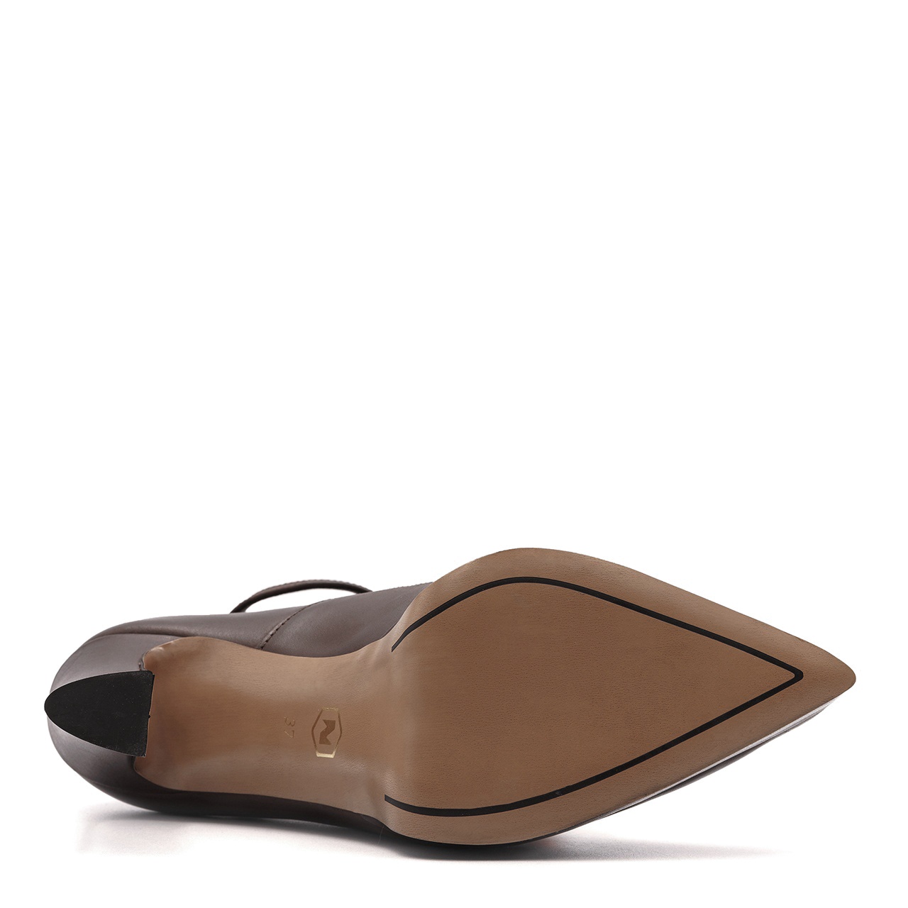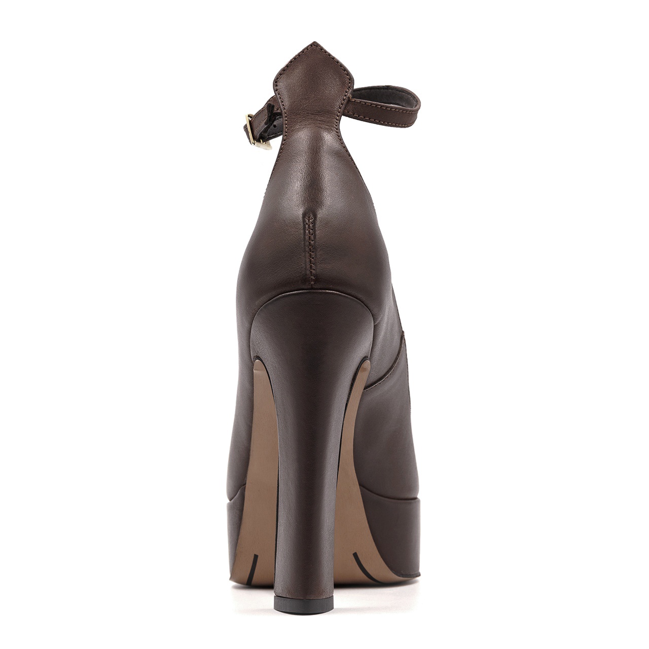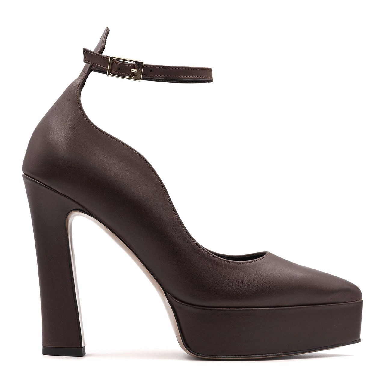 Brązowe skórzane czółenka zapinane na cienki pasek wokół kostki. Obuwie wykonano z naturalnej skóry licowej z lekkimi przyciemnionymi noskami i piętą. Buty na 3 cm platformie i wysokim 12,5 cm słupku. Noski butów w szpic. Wkładka w butach jest skórzana. Wymiary podawane na kartach produktów to wymiary orientacyjne i odnoszą się do rozmiaru 37.
