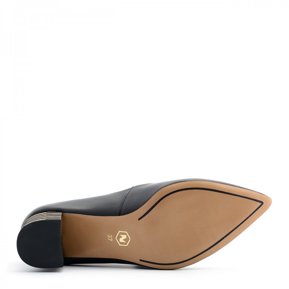 Ten rodzaj damskiego obuwia wysmukla sylwetkę i dodaje jej kilku centymetrów. Mozaikowy, czarno-złoty obcas jest modnym dodatkiem, obok którego nie można przejść obojętnie. Połączenie w nim dwóch kolorów w szachownicę tworzy ciekawy, lecz spokojny akcent. Noski butów są lekko spiczaste. Gładka, beżowa podeszwa wykonana jest z tuniskóru. Te eleganckie czółenka będą współgrały z wieloma stylizacjami o różnych charakterach. Doskonale wyprofilowane, wykonane ręcznie ze skóry naturalnej, wysokiej jakości buty damskie na pewno spełnią kobiece oczekiwania dotyczące połączenia wygody i designu.