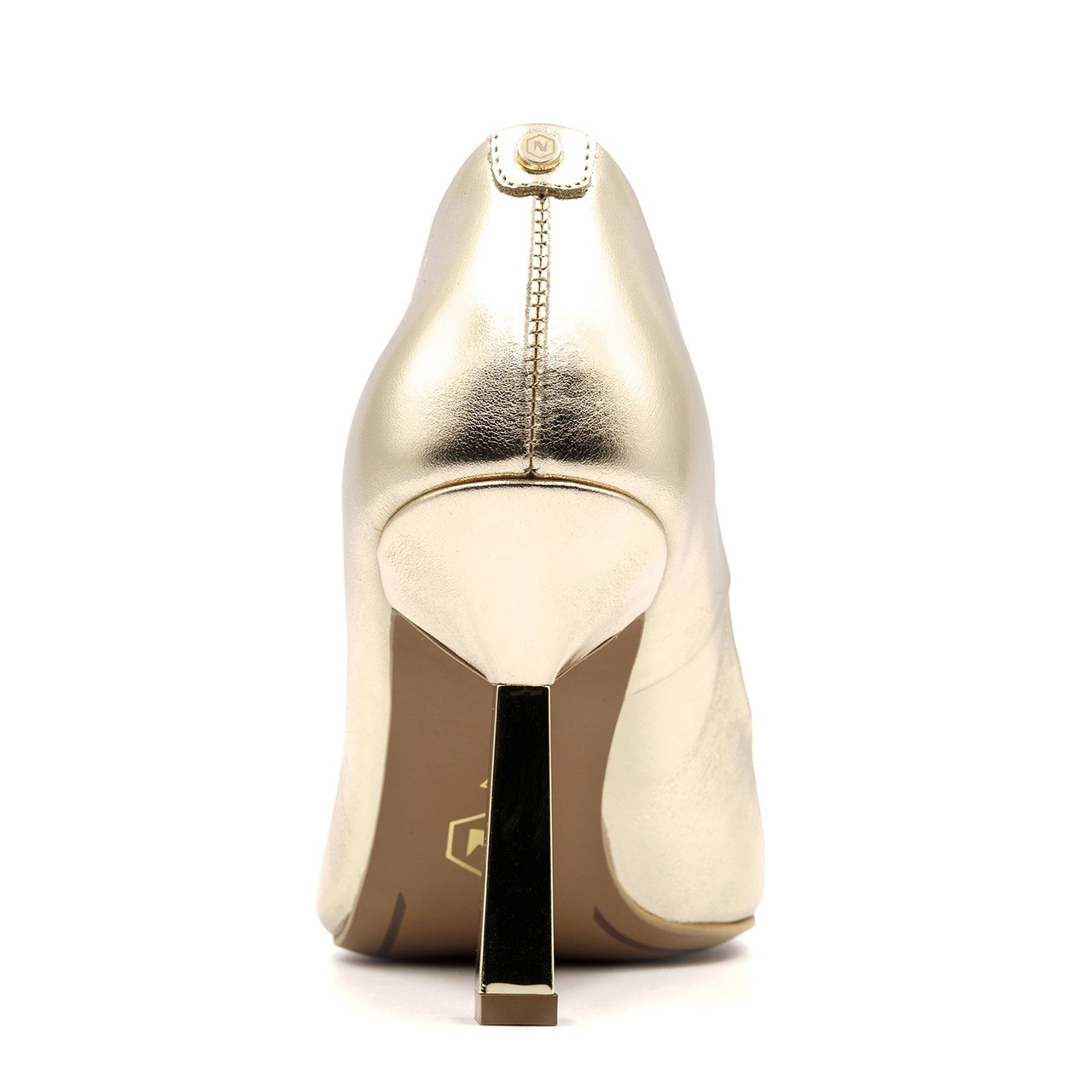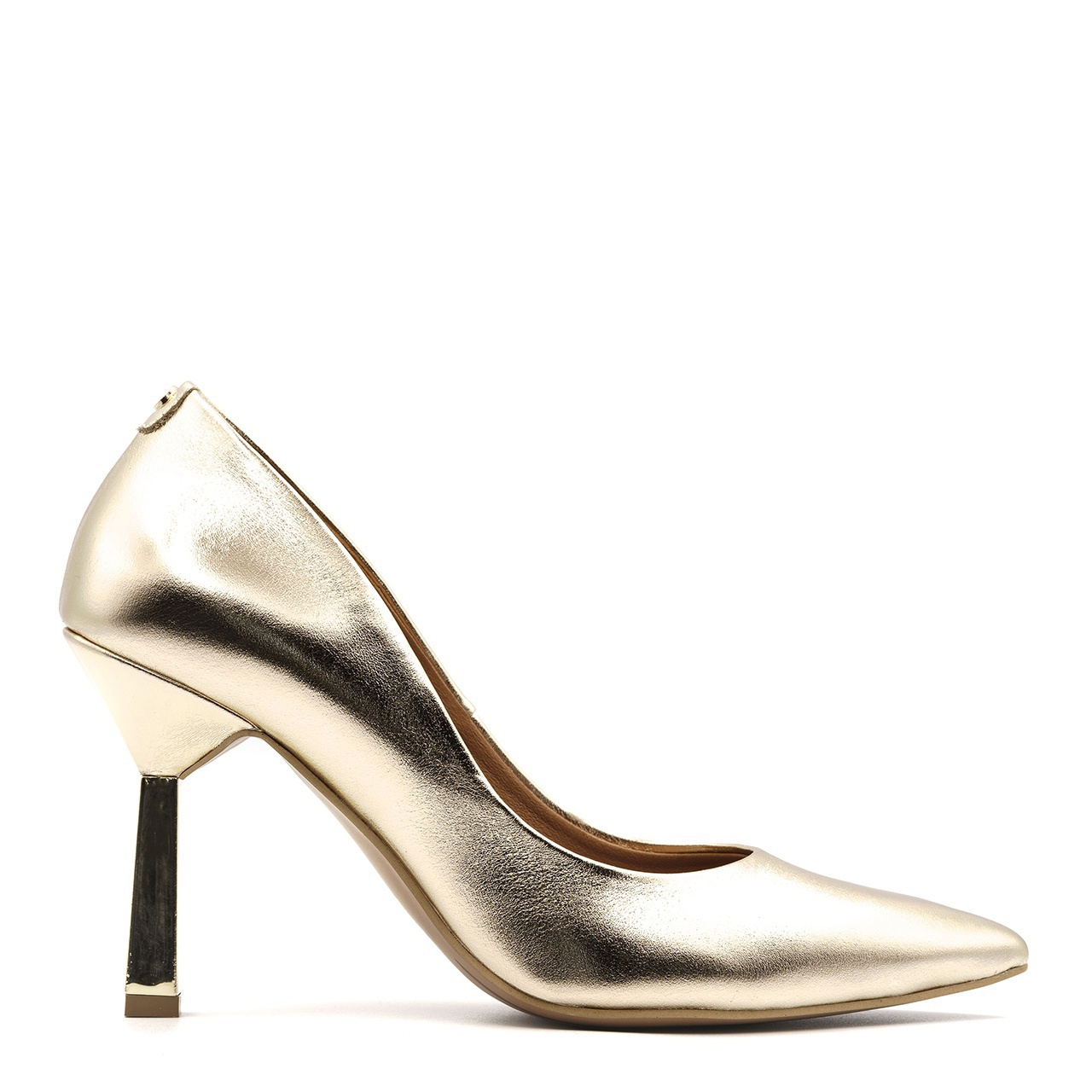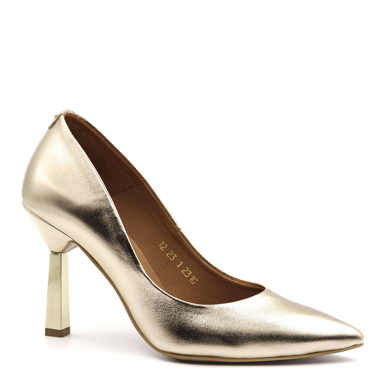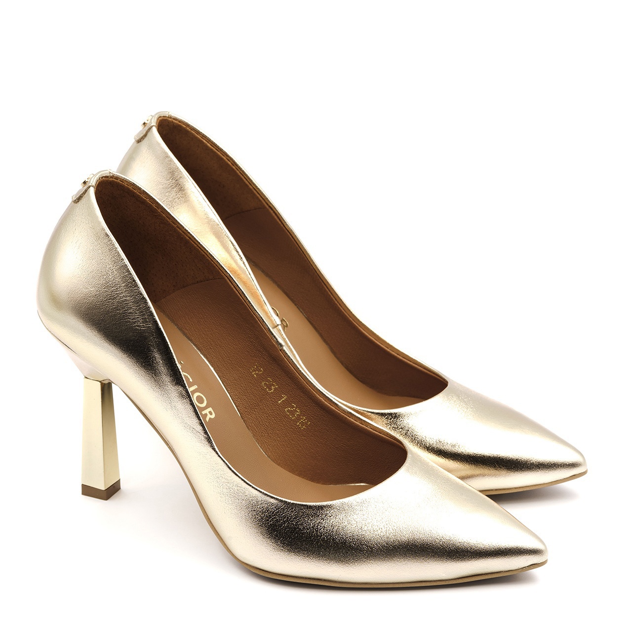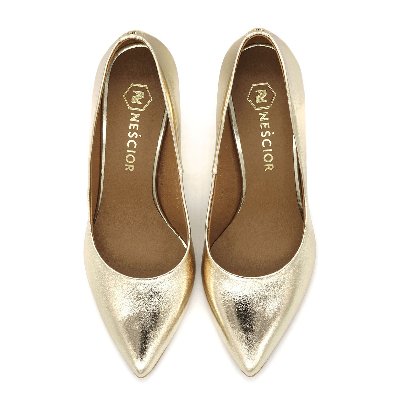 Złote skórzane, delikatne szpilki na 9 cm lustrzanym obcasie w kolorze złotym. Obuwie wykonane jest ze skóry naturalnej. Nosek butów w szpic. Wkładka w butach jest skórzana. Niezwykle wygodne buty do codziennego użytkowania, a także na specjalne okazje. Wymiary podawane na kartach produktów to wymiary orientacyjne i odnoszą się do rozmiaru 37.