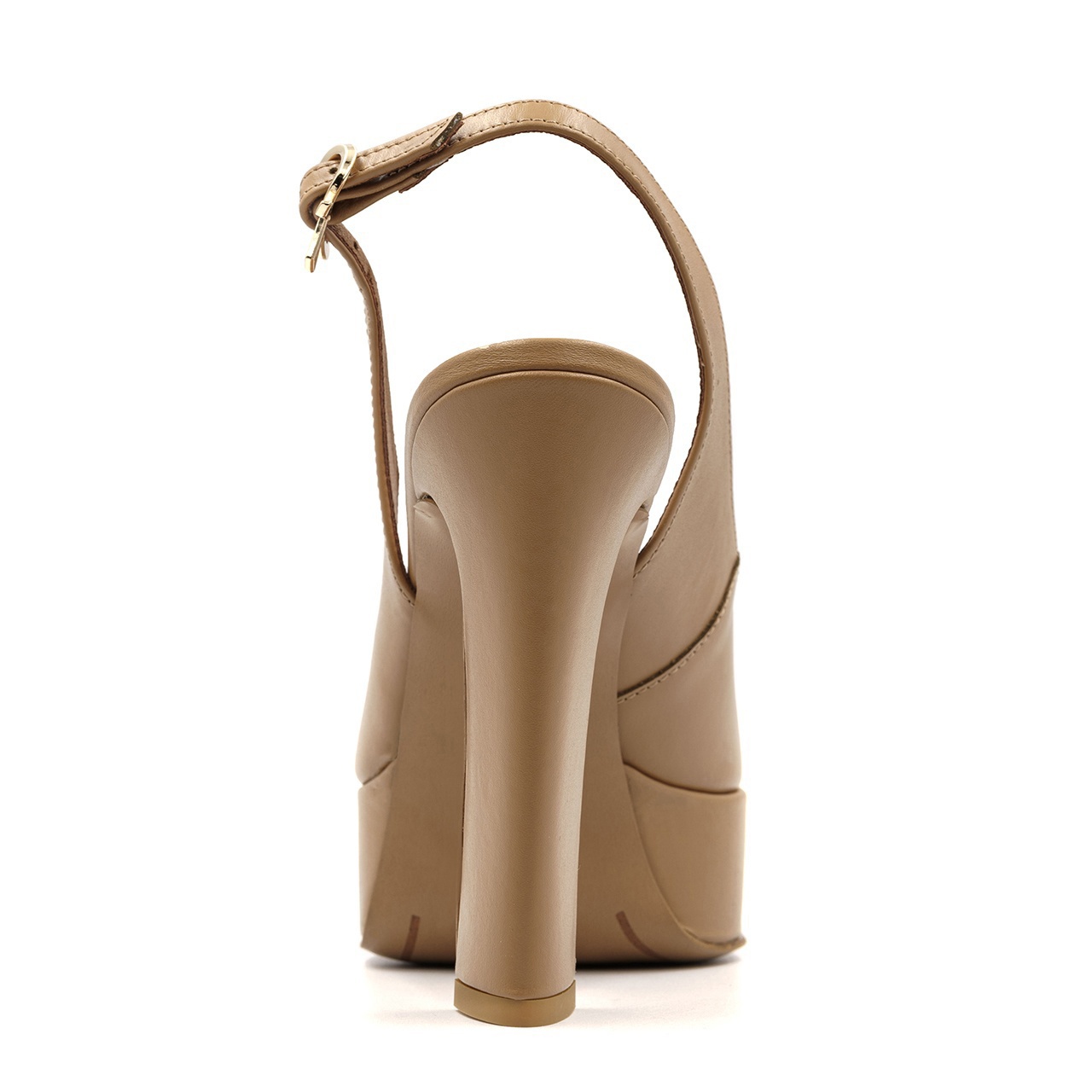 Karmelowe, eleganckie czółenka z odkrytą piętą zapinane na sprzączkę w kolorze złotym. Buty wykonane są ze skóry naturalnej licowej. Wysokość obcasa około 12,5 cm oraz platformie o wysokości około 3 cm. Wkładka wykonana jest z naturalnej skóry w kolorze karmelowym. Wymiary podawane na kartach produktów to wymiary orientacyjne i odnoszą się do rozmiaru 37.