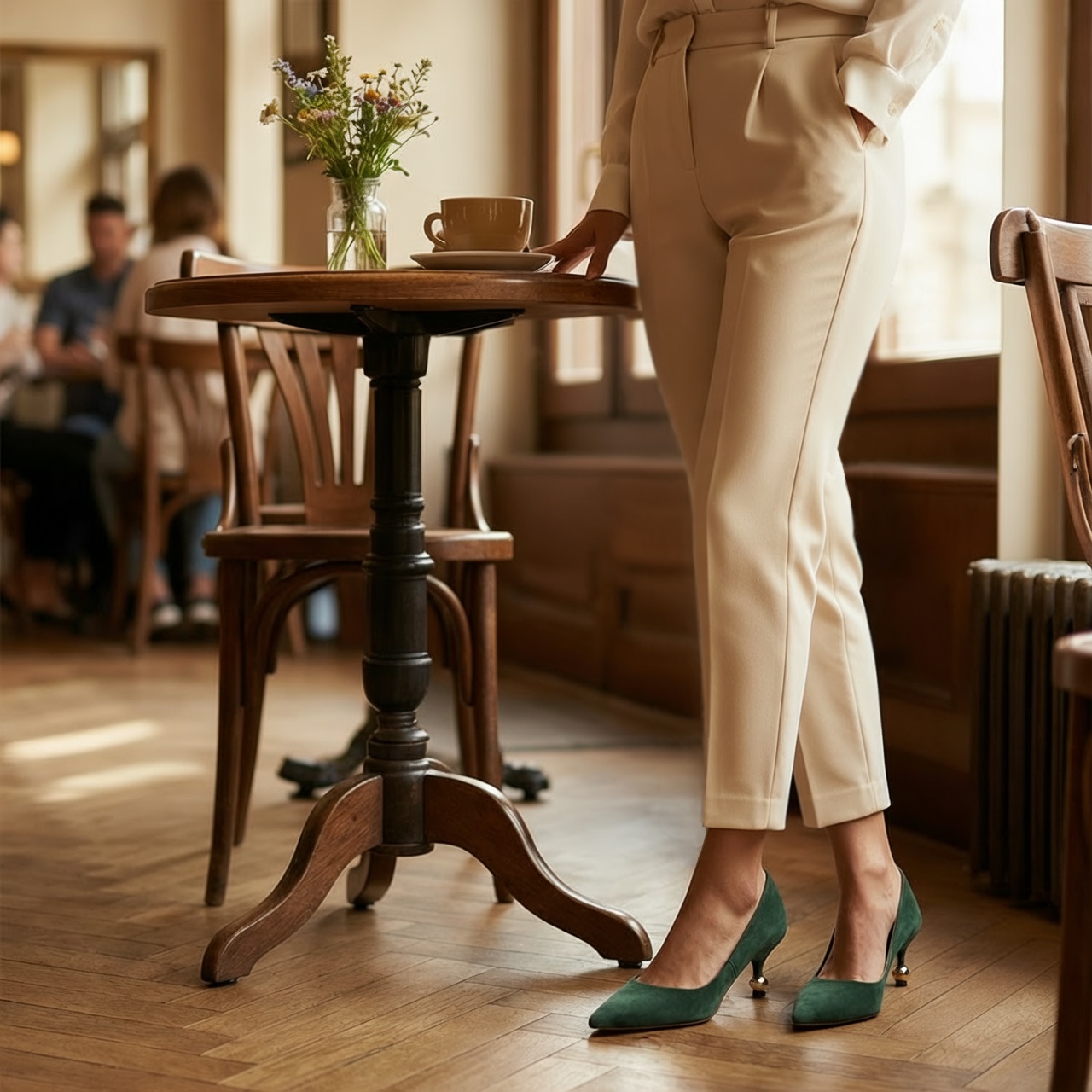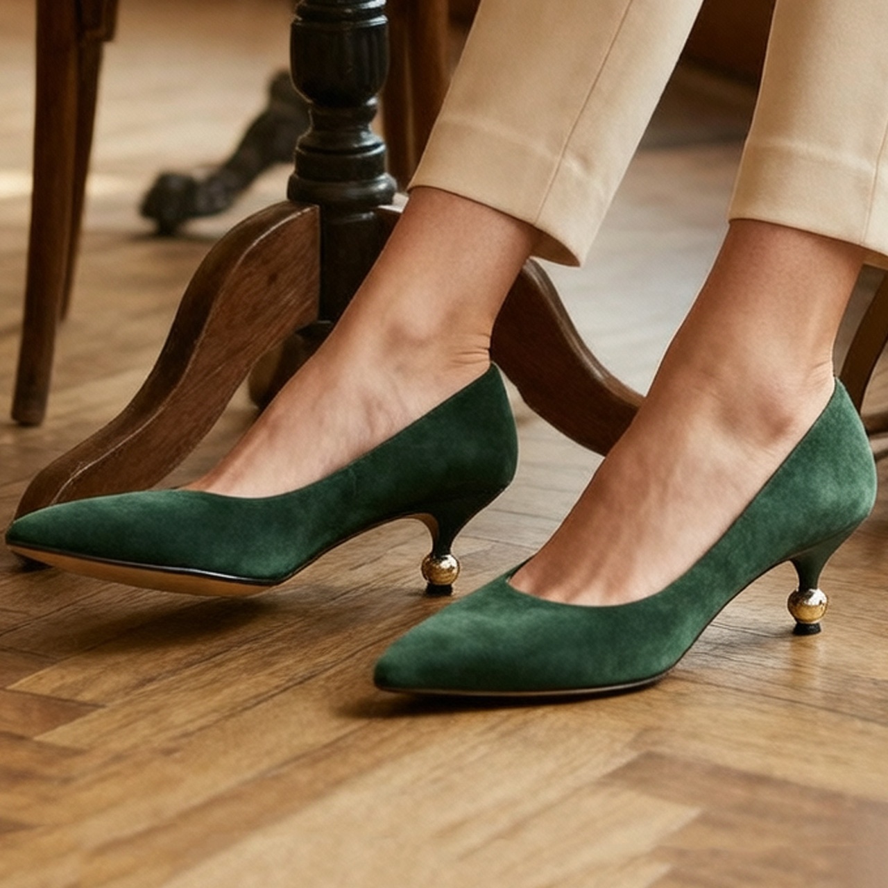 Zielone w kolorze butelkowej zieleni, stylowe, klasyczne czółenka osadzone na niskim obcasie z kulką w kolorze złotym. Wykonane czółenka są ze skóry zamszowej. Wkładka jest skórzana. Noski w szpic optycznie wysmuklą nogi. Ten fason z pewnością dopełni wiele Twoich stylizacji. Wymiary podawane na kartach produktów to wymiary orientacyjne i odnoszą się do rozmiaru 37.