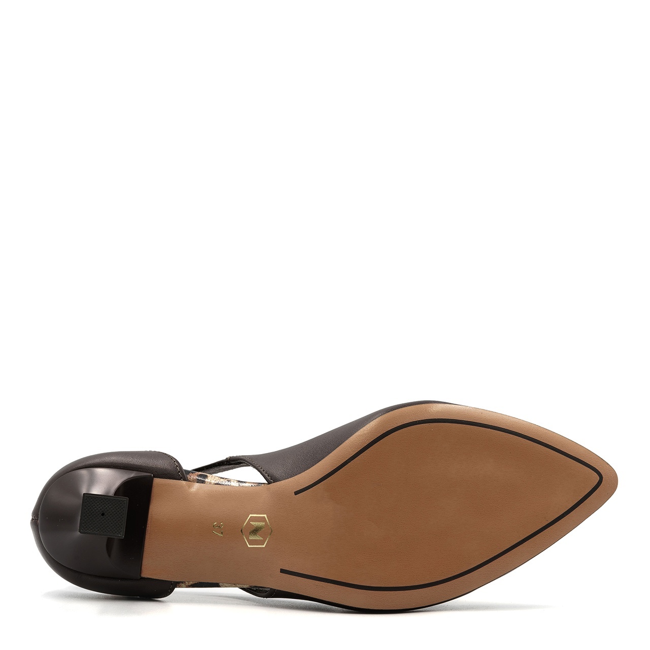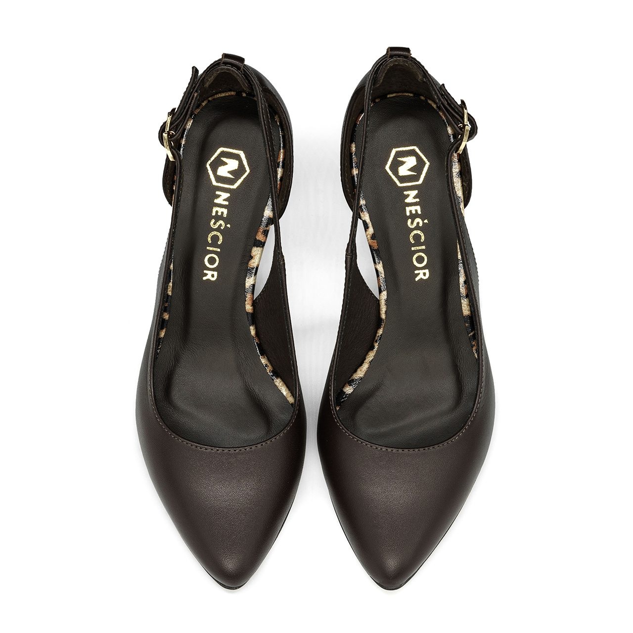 Czekoladowe czółenka z akcentami panterki, z wycięciami po bokach i delikatną ozdobą. Obuwie wykonano ze skóry naturalnej licowej. Wysokość obcasa wynosi około 7 cm. Przód buta w delikatny szpic. Wkładka wykonana ze skóry naturalnej. Wymiary podawane na kartach produktów to wymiary orientacyjne i odnoszą się do rozmiaru 37.
