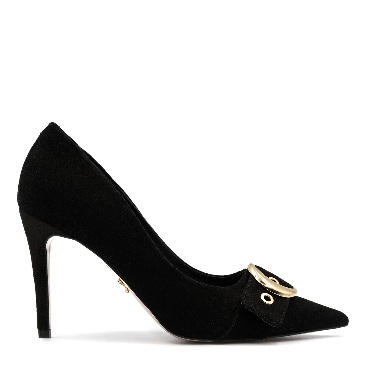 Czarne czółenka, szpilki w szpic. Obuwie wykonano z naturalnej skóry zamszowej. Wysokość obcasa wynosi około 9 cm. Wkładka w butach jest skórzana. Z przodu buta umieszczono klamrę. Wymiary podawane na kartach produktów to wymiary orientacyjne i odnoszą się do rozmiaru 37.
