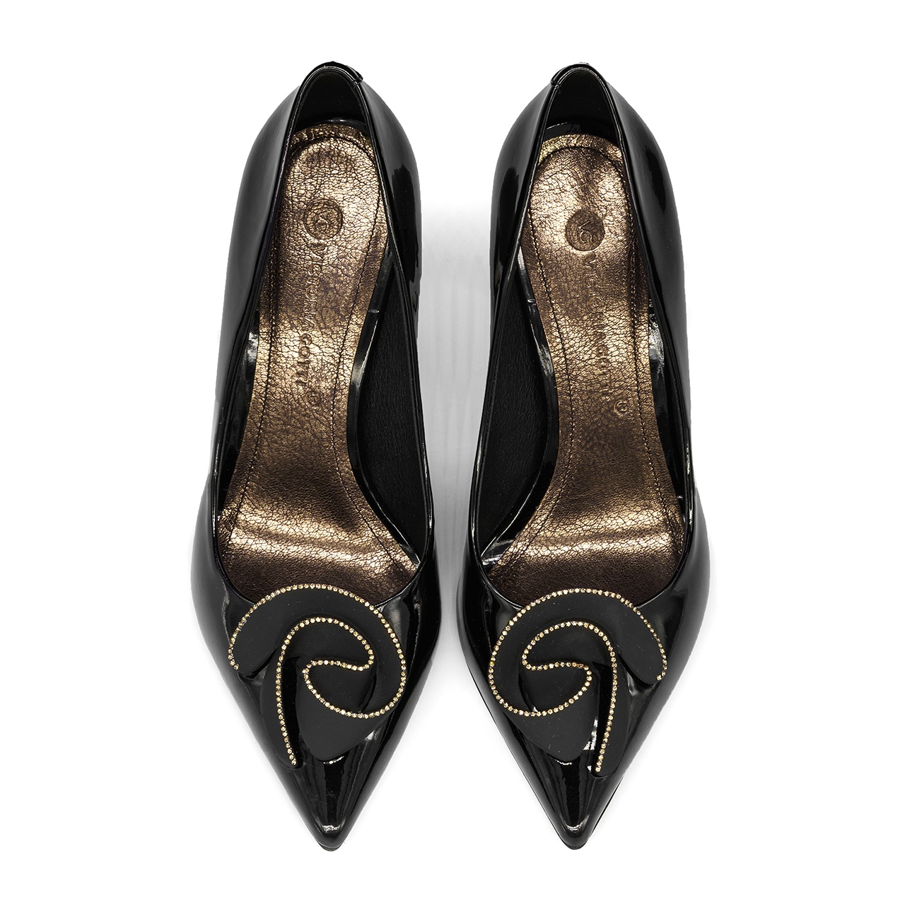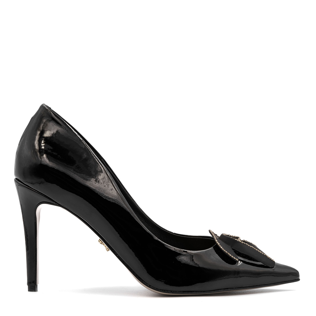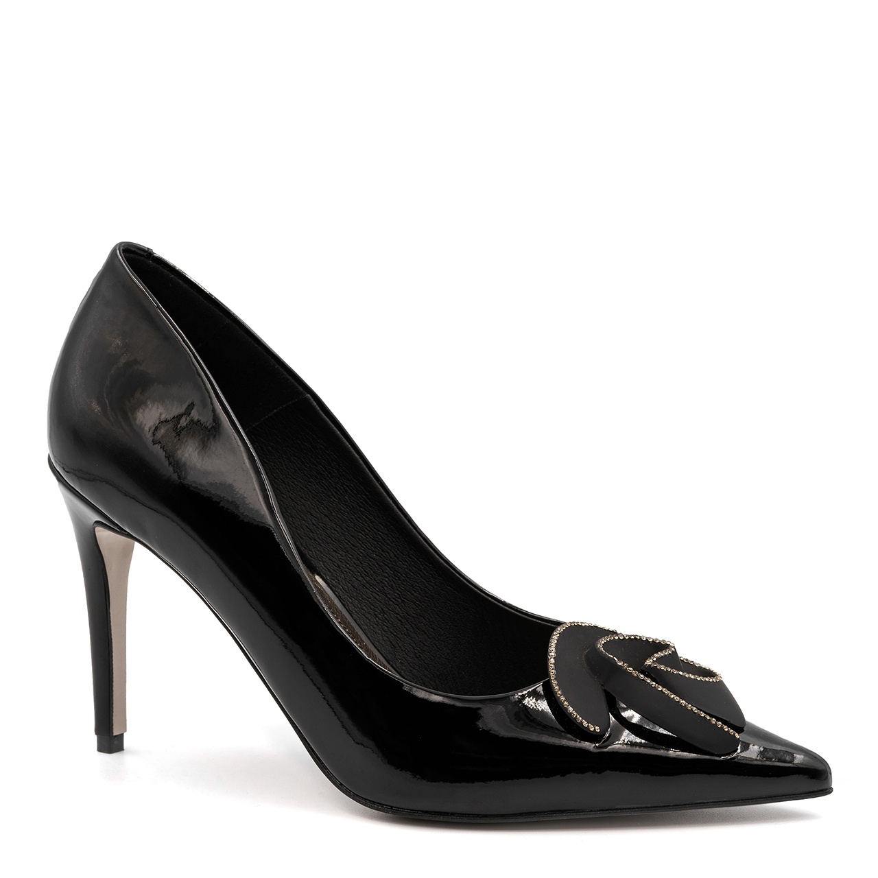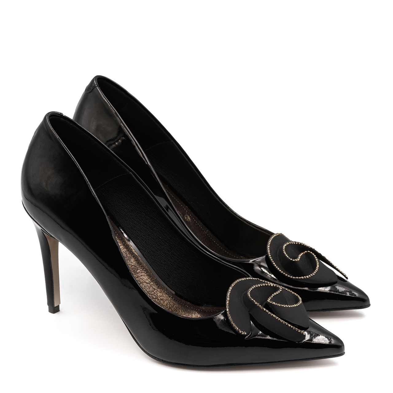 Czarne czółenka, szpilki w szpic. Obuwie wykonano z naturalnej skóry lakierowanej. Wysokość obcasa wynosi około 9 cm. Wkładka w butach jest skórzana. Z przodu buta umieszczono czarną, matową różę z cyrkoniami. Wymiary podawane na kartach produktów to wymiary orientacyjne i odnoszą się do rozmiaru 37.