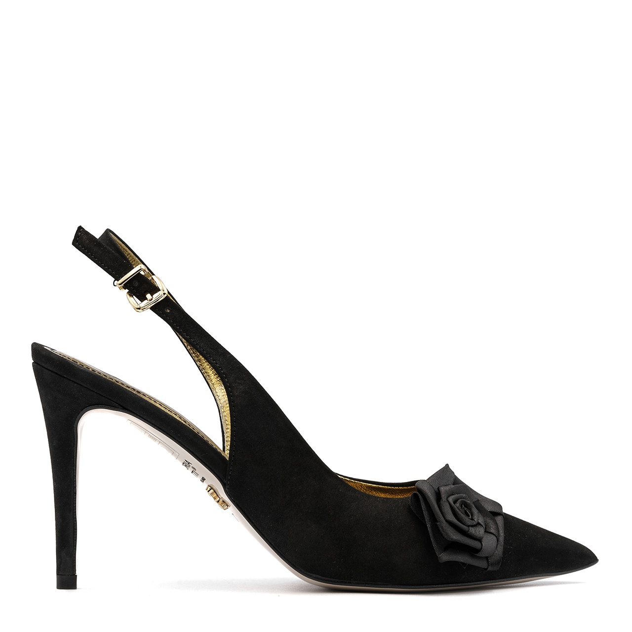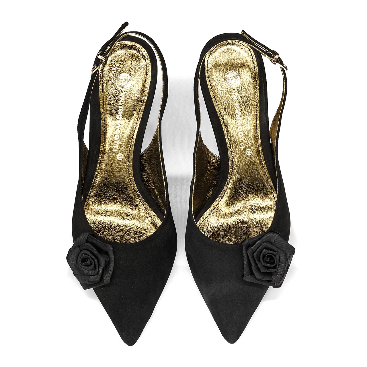 Czarne, klasyczne czółenka bez pięty na wysokiej 9 cm szpilce. Obuwie wykonano ze skóry zamszowej. Wkładka jest złota i skórzana. Noski w szpic ozdobiono różą z materiału. Wymiary podawane na kartach produktów to wymiary orientacyjne i odnoszą się do rozmiaru 37.