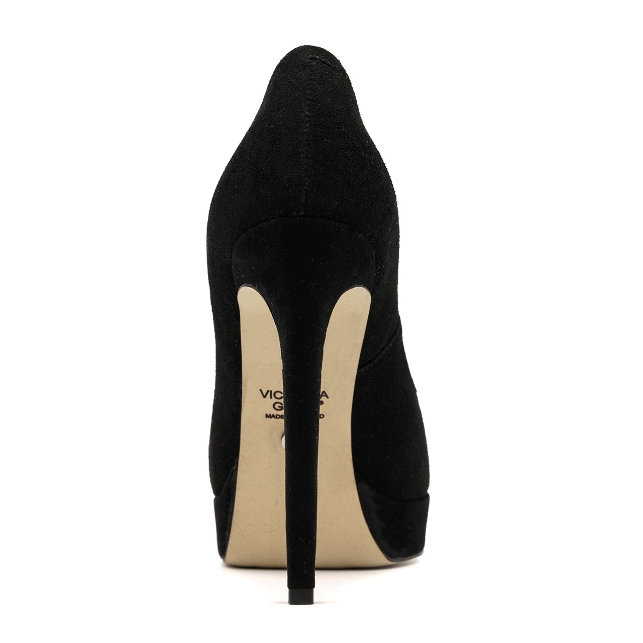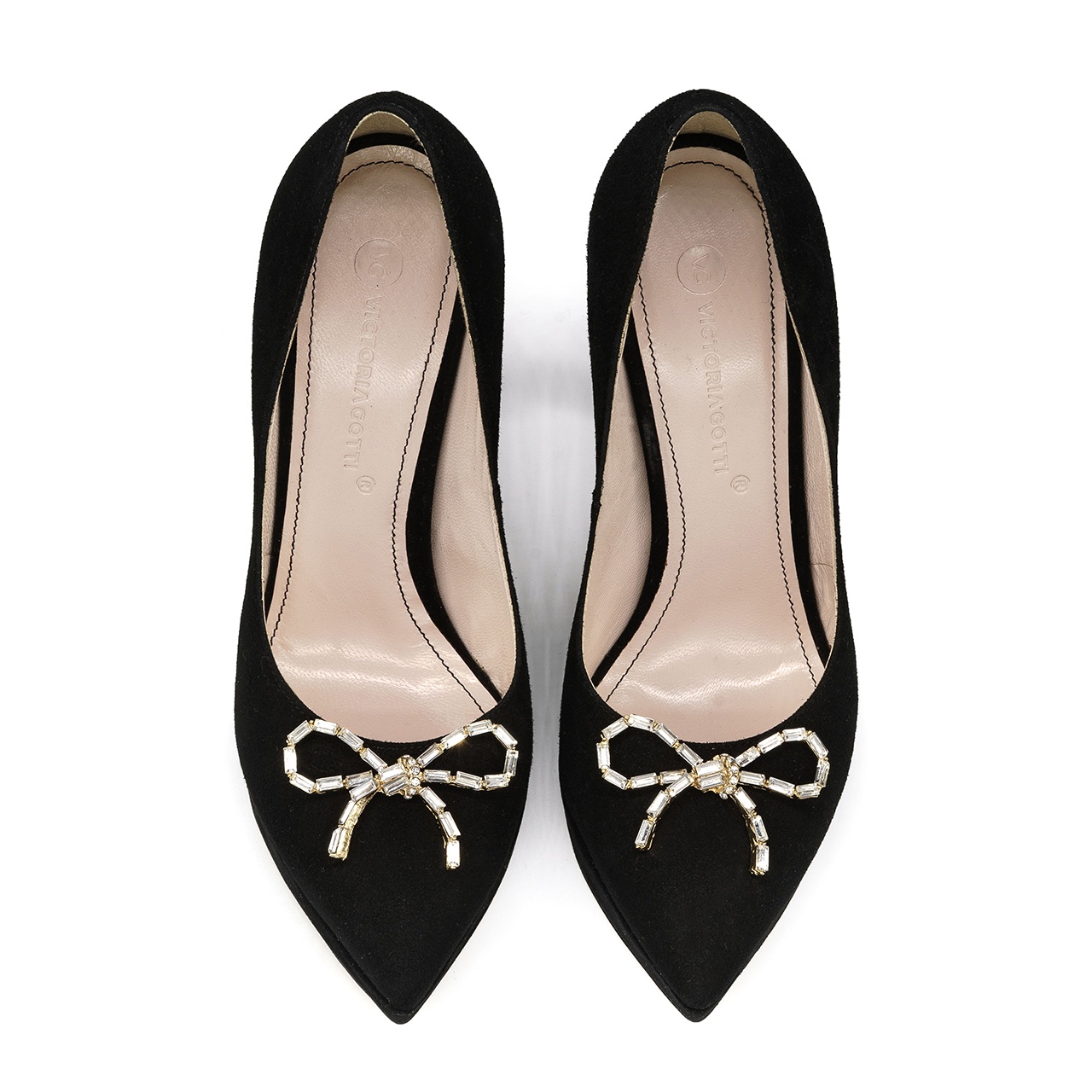 Czarne czółenka, szpilki na platformie. Obuwie wykonano z naturalnej skóry zamszowej. Wysokość obcasa wynosi około 12,5 cm, a platforma wynosi około 2cm. Z przodu buta umieszczono kokardkę z cyrkoniami. Wkładka w butach jest skórzana. Wymiary podawane na kartach produktów to wymiary orientacyjne i odnoszą się do rozmiaru 37.